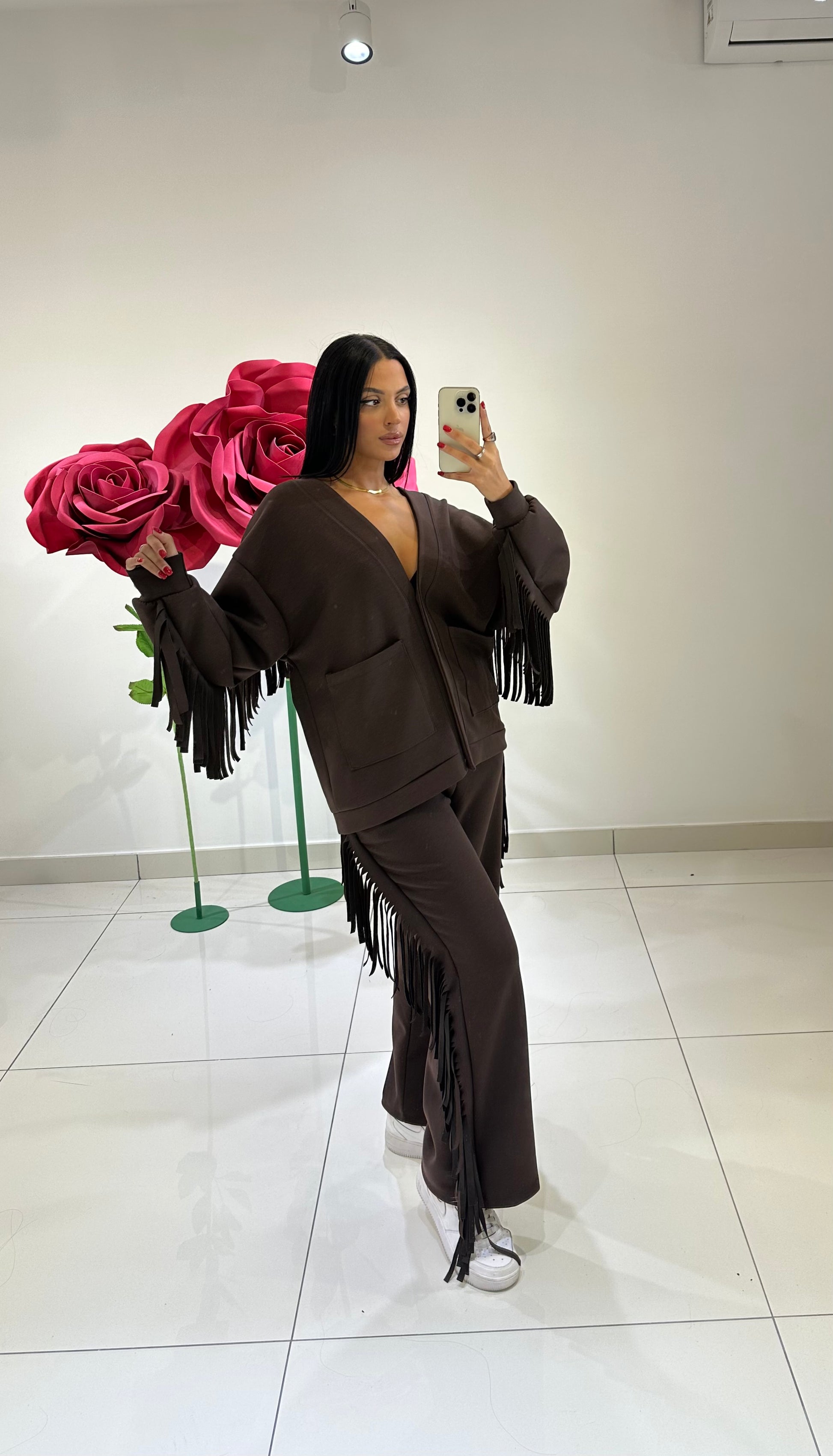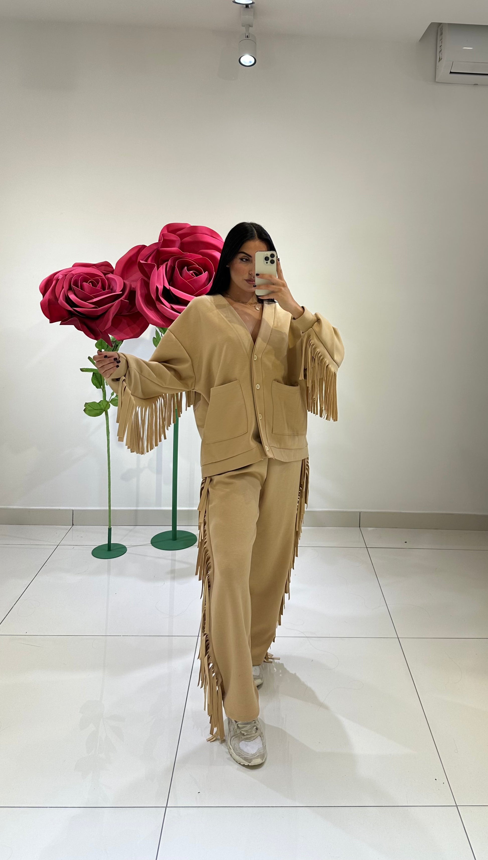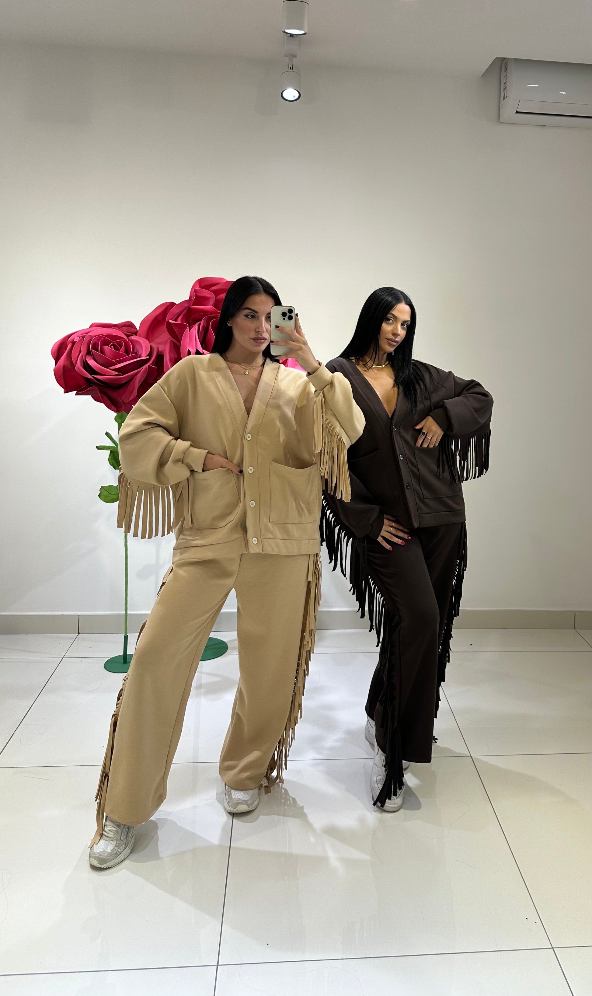 The cardigan, with its button closure and large pockets, is embellished with long, dynamic fringes that move with every step, creating a very trendy visual effect. The straight-leg, comfortable trousers feature the same fringe detail along the sides, ensuring perfect stylistic continuity.