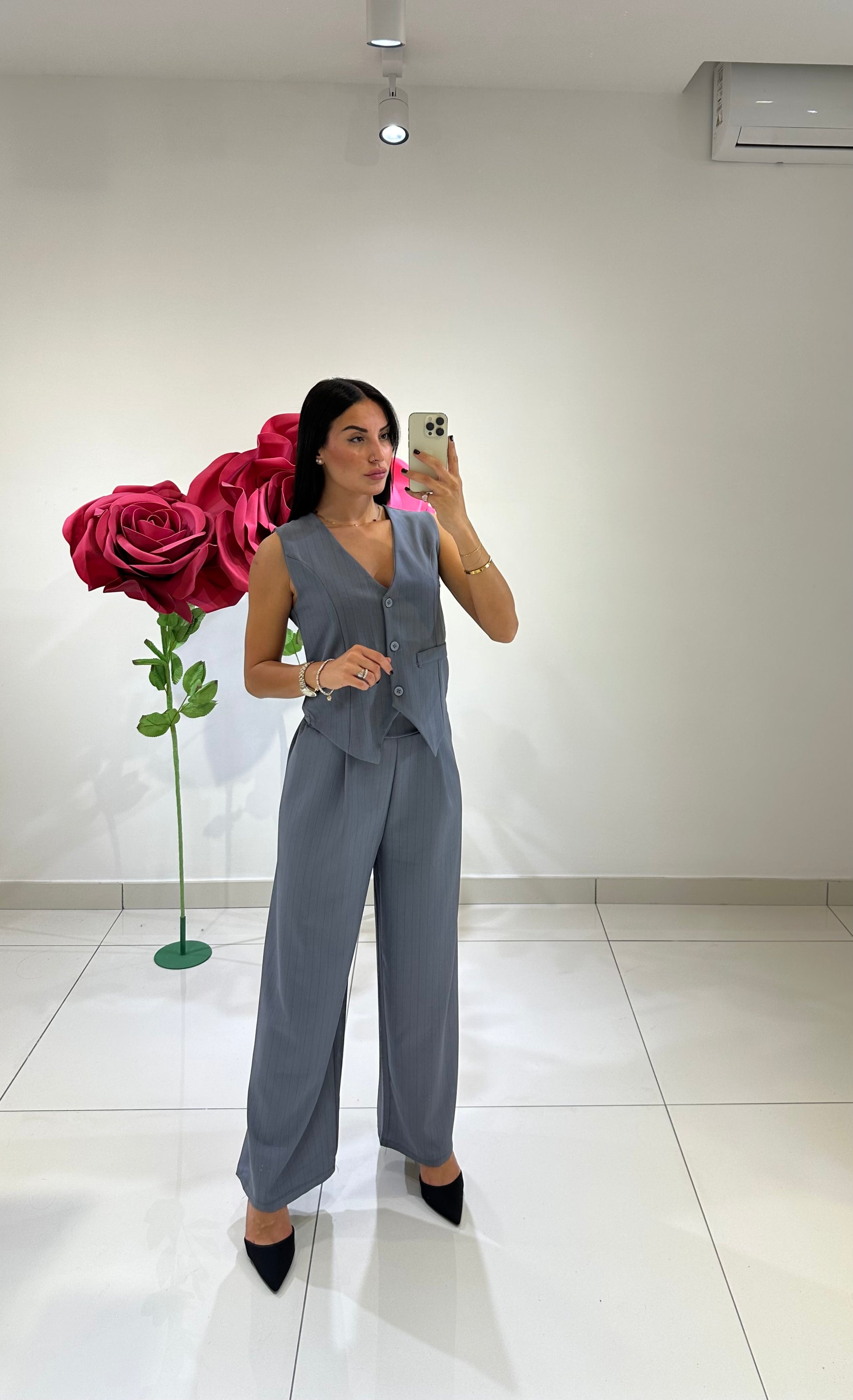 PINSTRIPE COORDINATE SET COMPRISING A VEST WITH FAKE POCKETS ON THE SIDES, STRAIGHT LEG TROUSERS, HIGH WAIST WITH ELASTIC AT THE BACK. IN VARIOUS COLORS