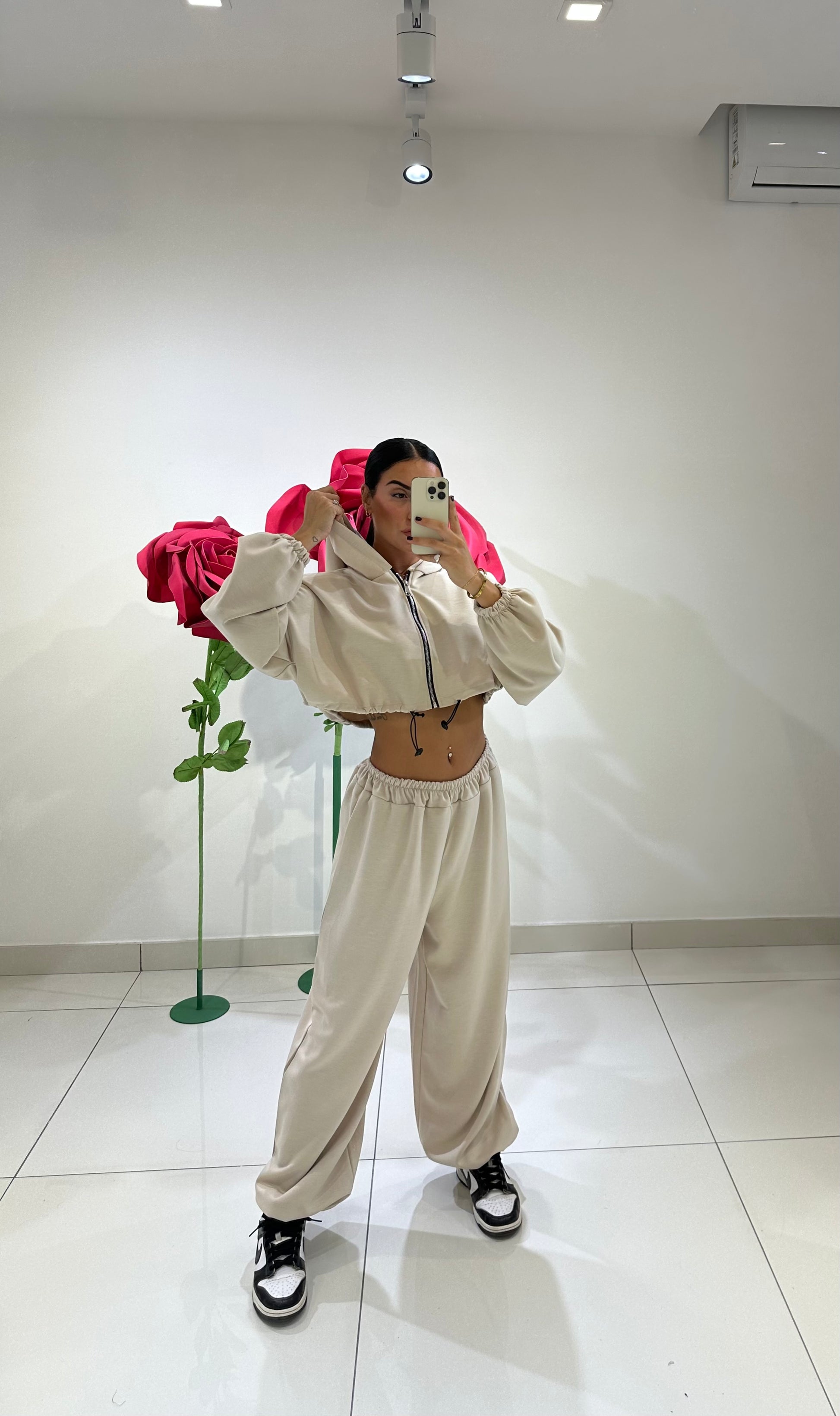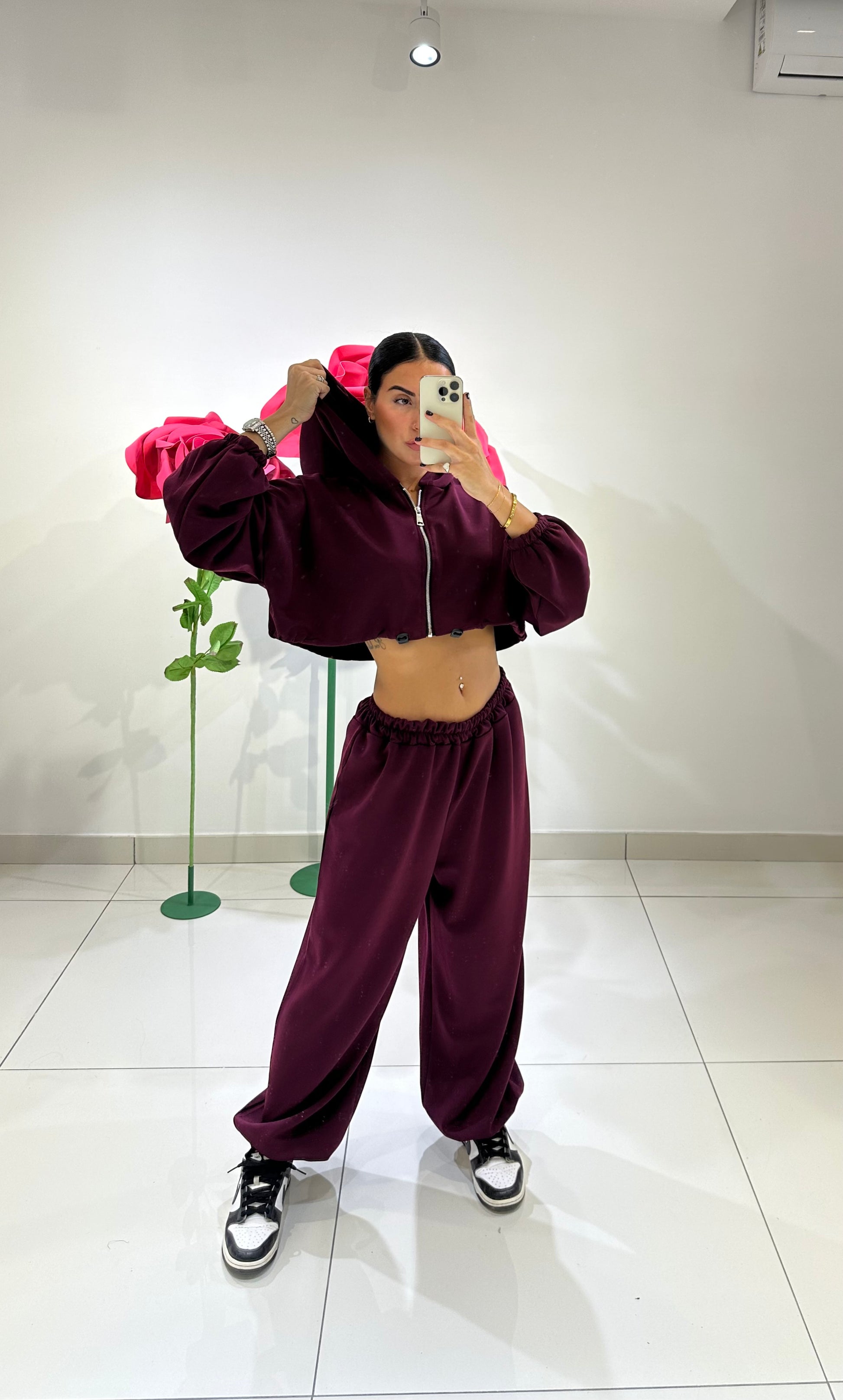 Tracksuit set with cropped hoodie and adjustable drawstring waist. Oversized tracksuit bottoms. Available in various colors.