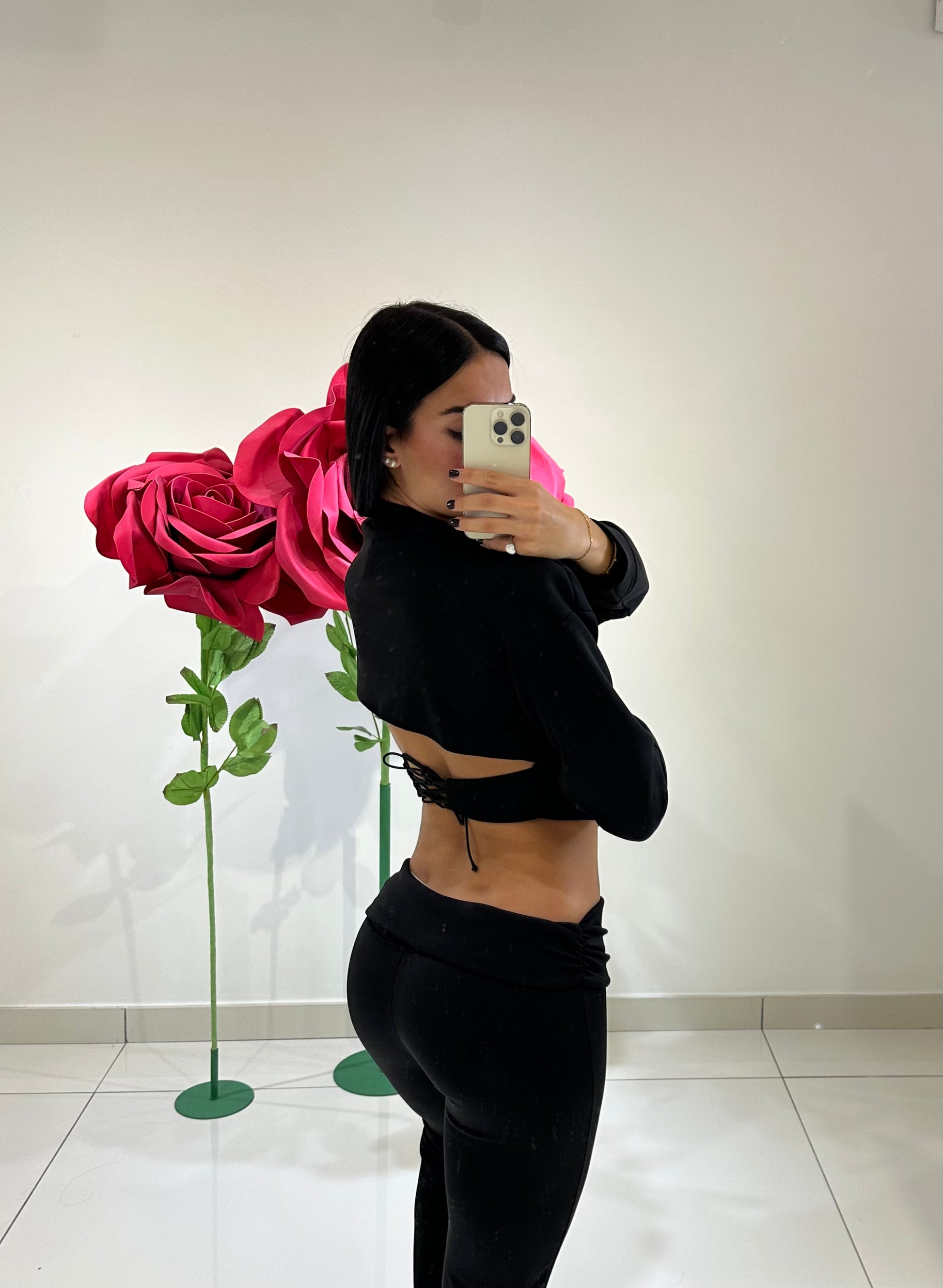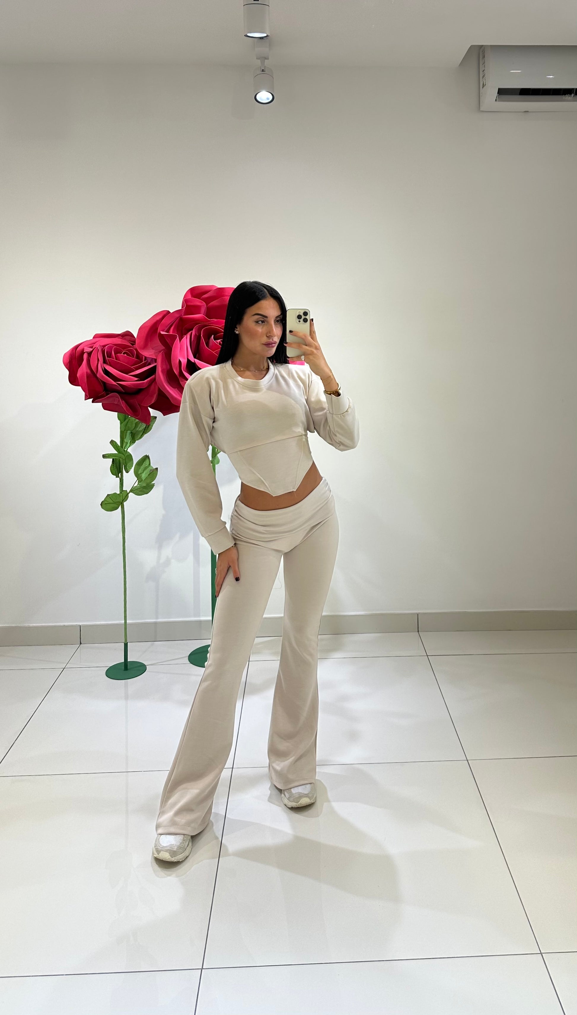 Co-ord set consisting of a bustier-effect crop sweatshirt, padded shoulders, and a back opening with laces. Flared trousers with a low waist and turn-ups. Available in various colors.