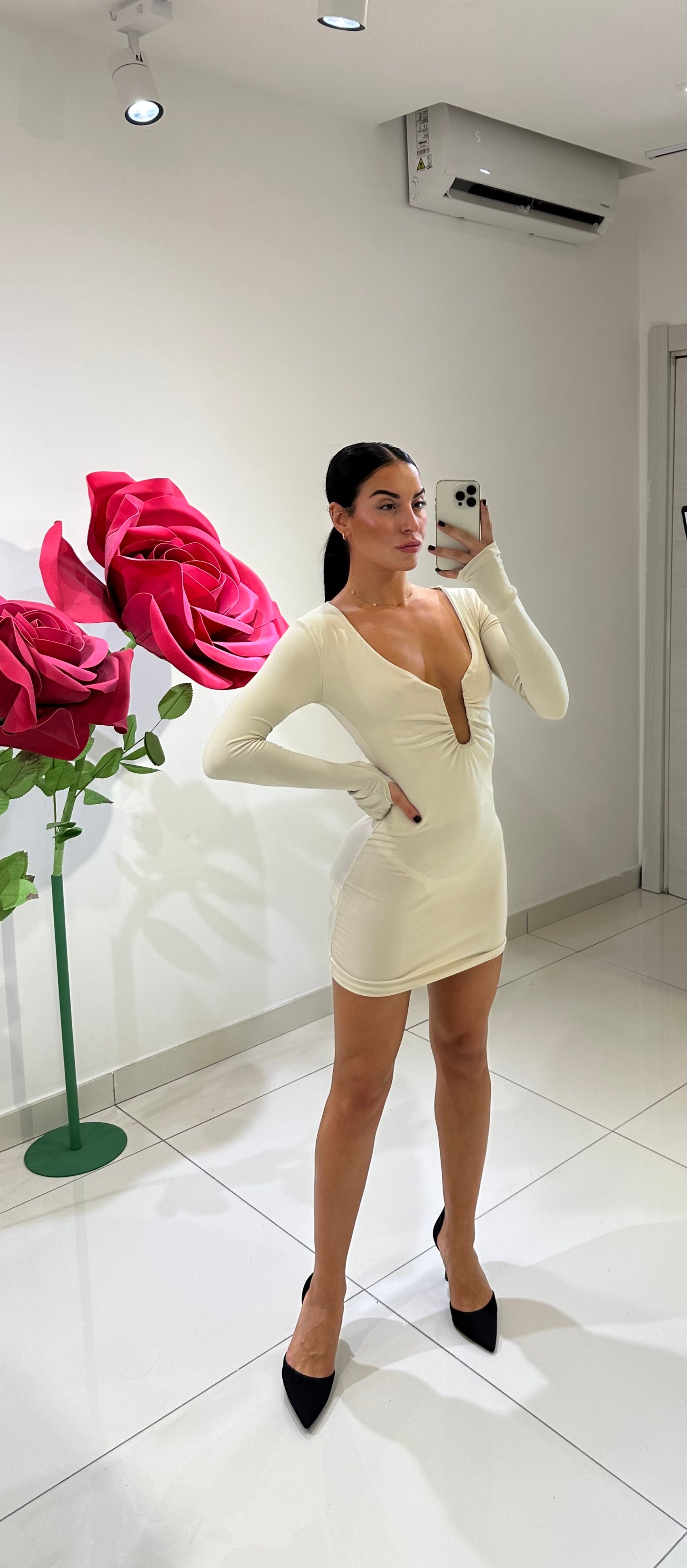 DRESS WITH A WIDE V-NECKLINE, UNDERWIRE, AND LONG, HALF-GLOVE SLEEVES. IN VARIOUS COLORS.