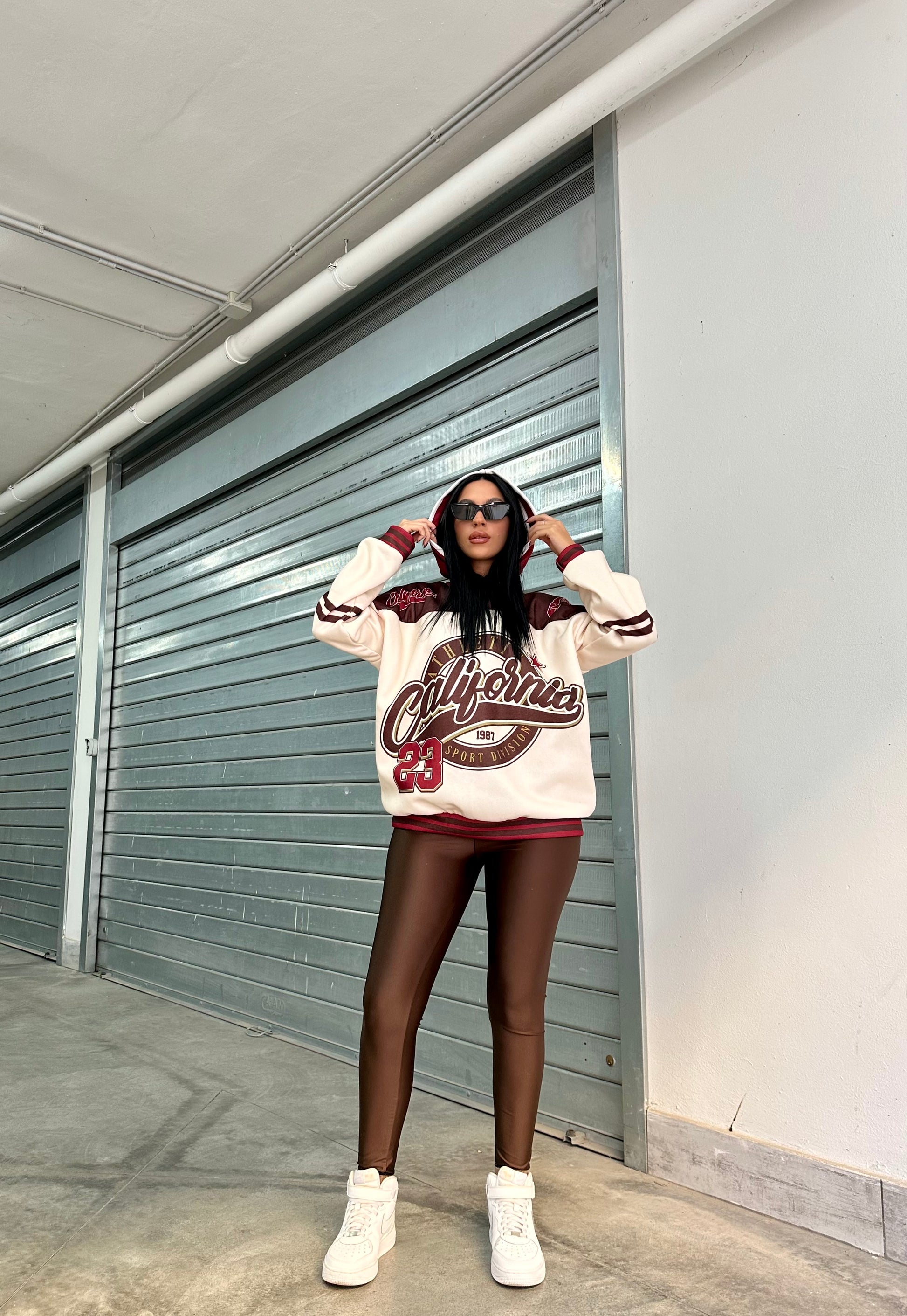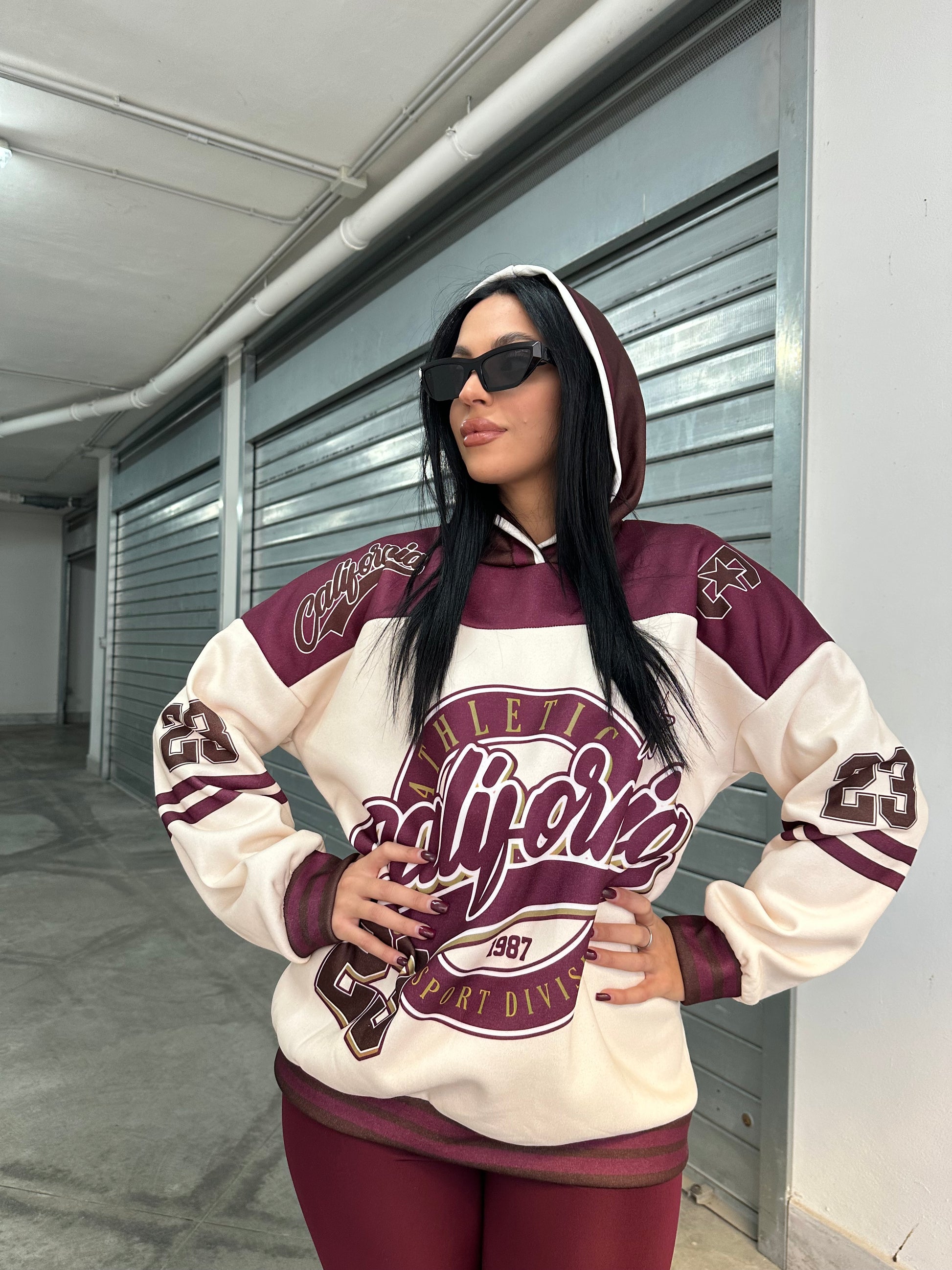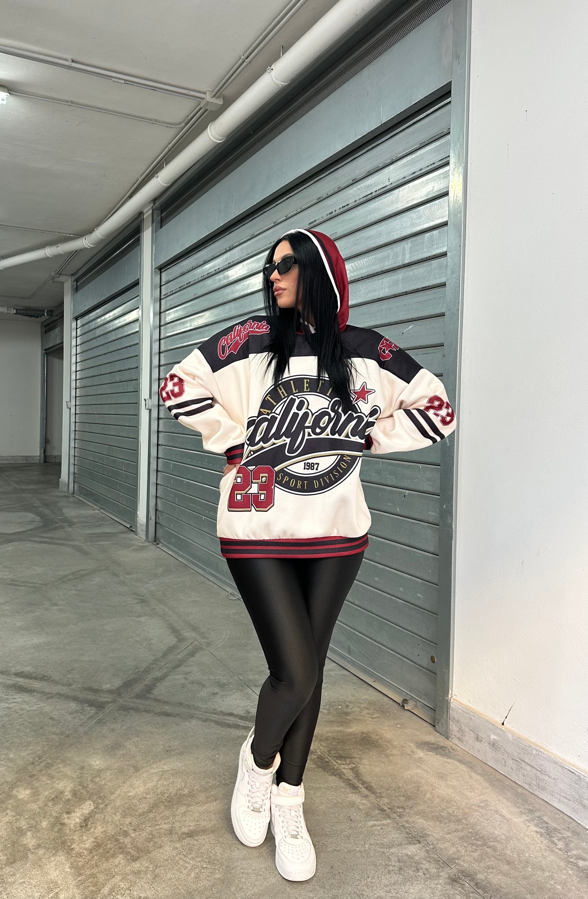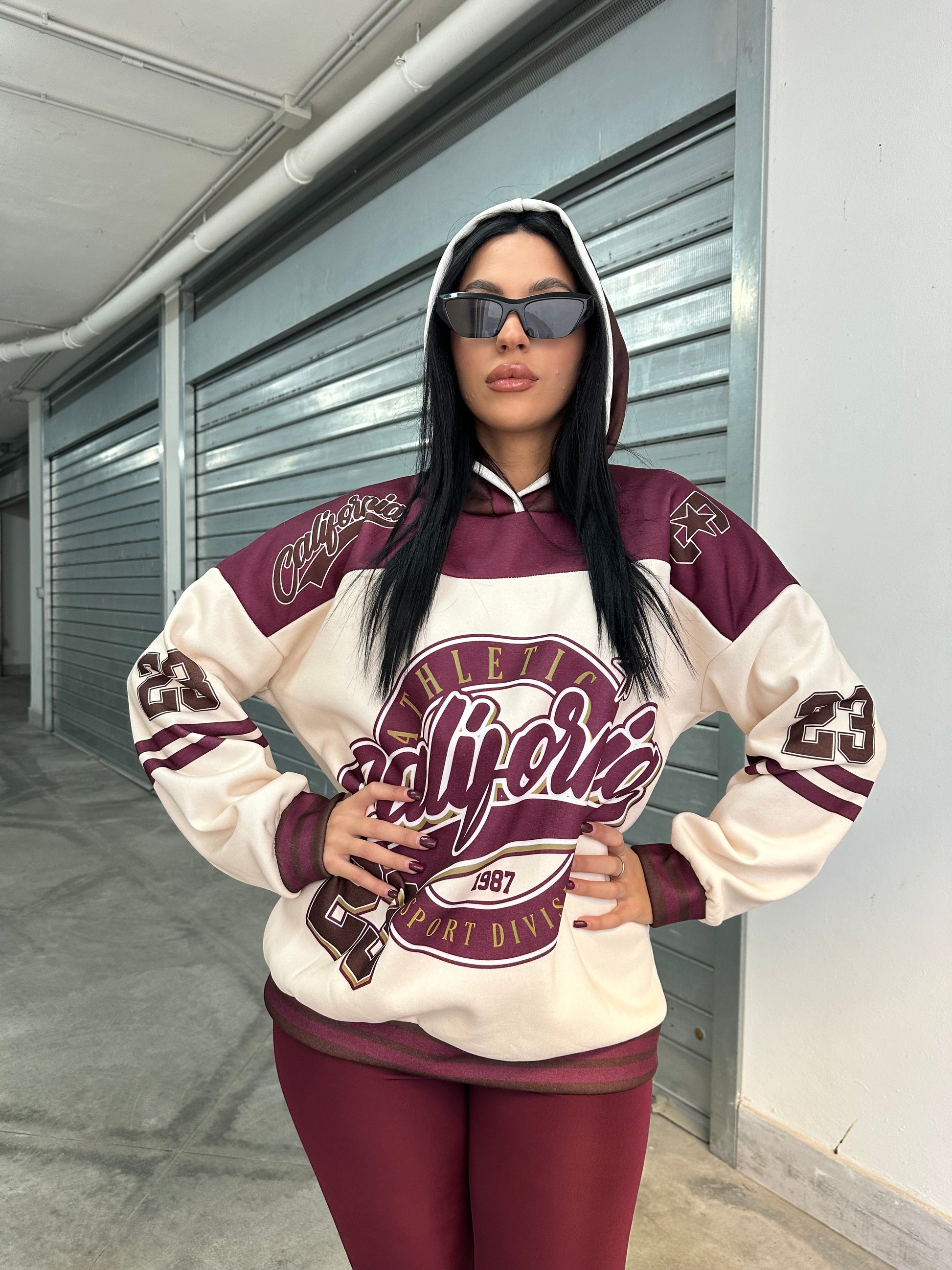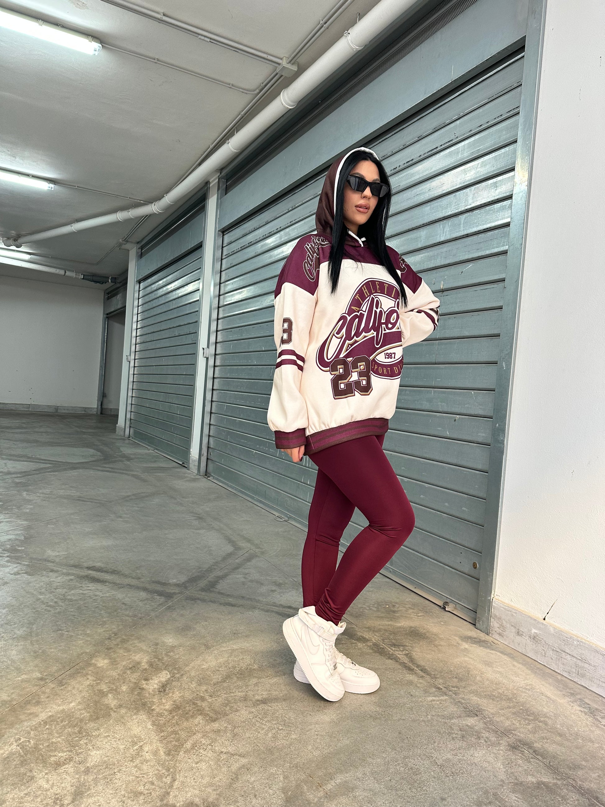 Felpa oversize con cappuccio e stampa college “California Athletics”, abbinata a leggings in lycra  effetto lucido.