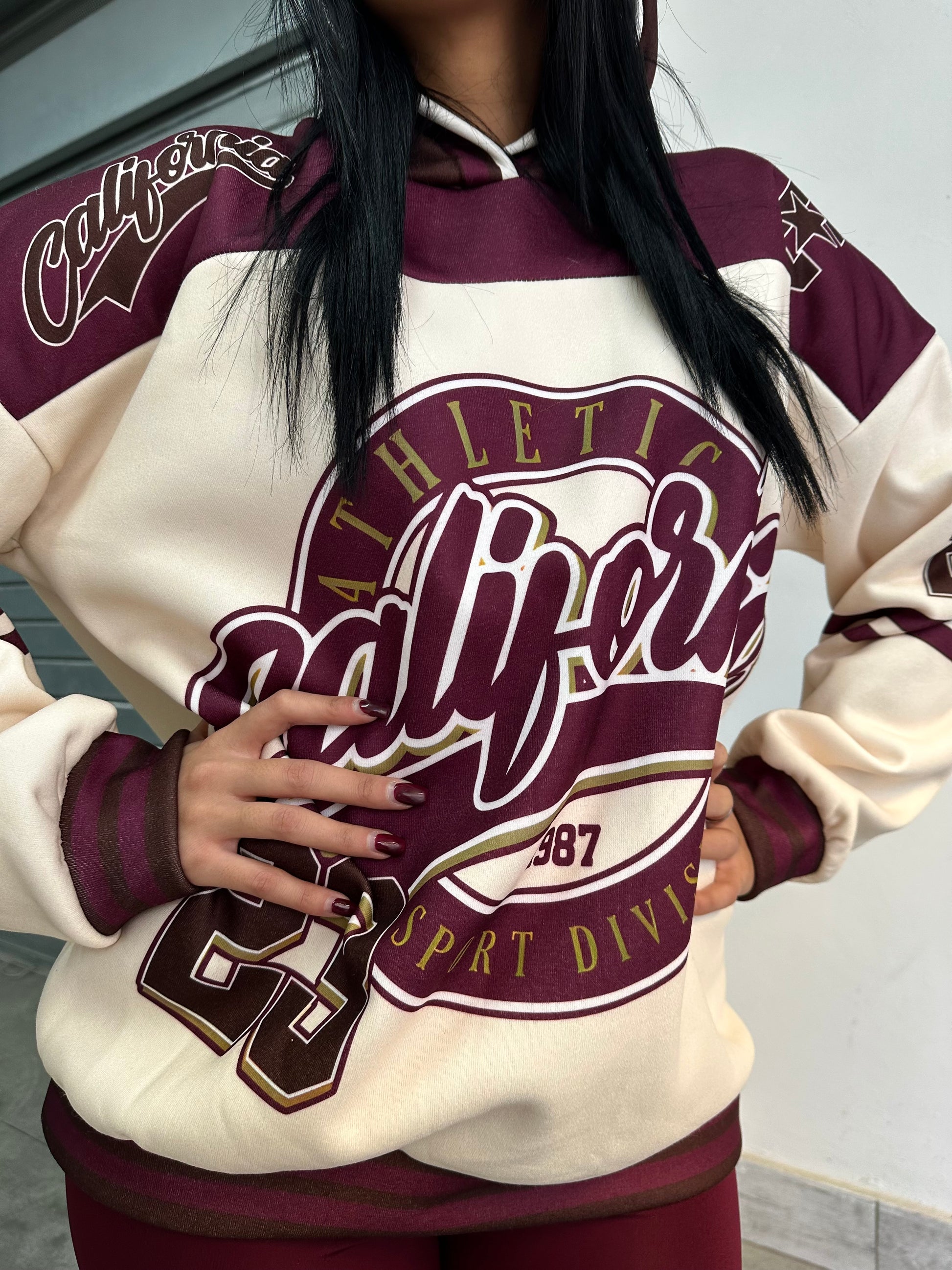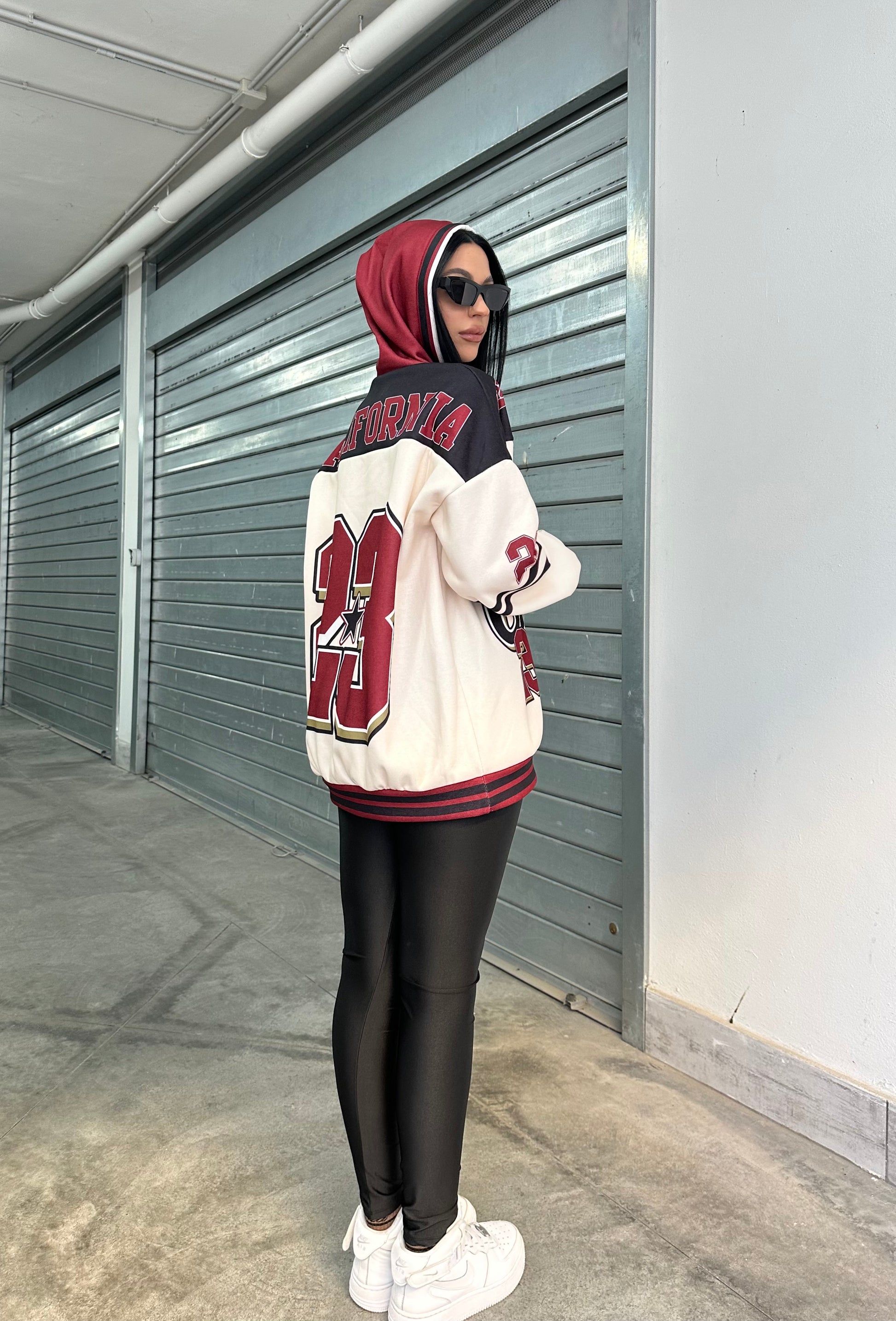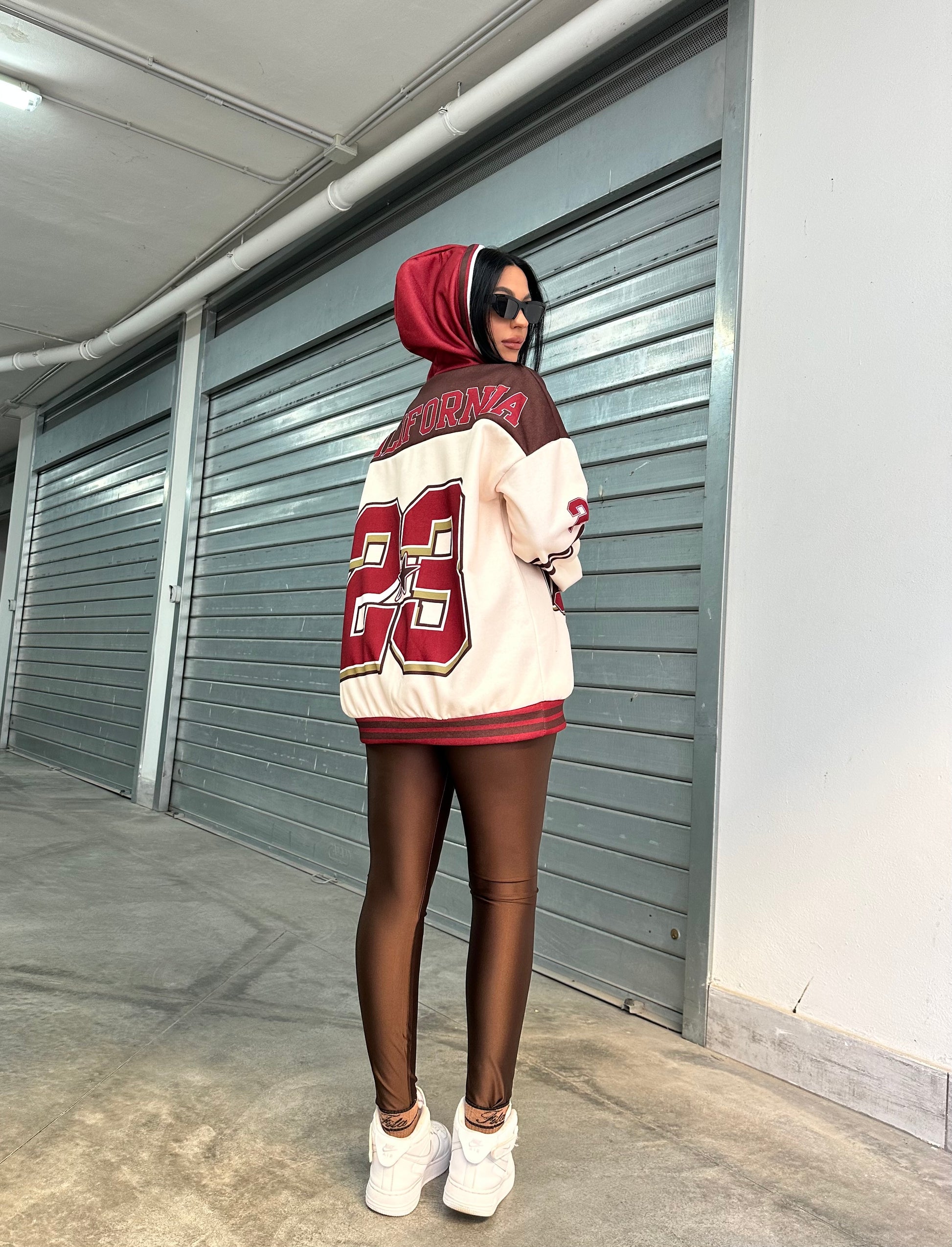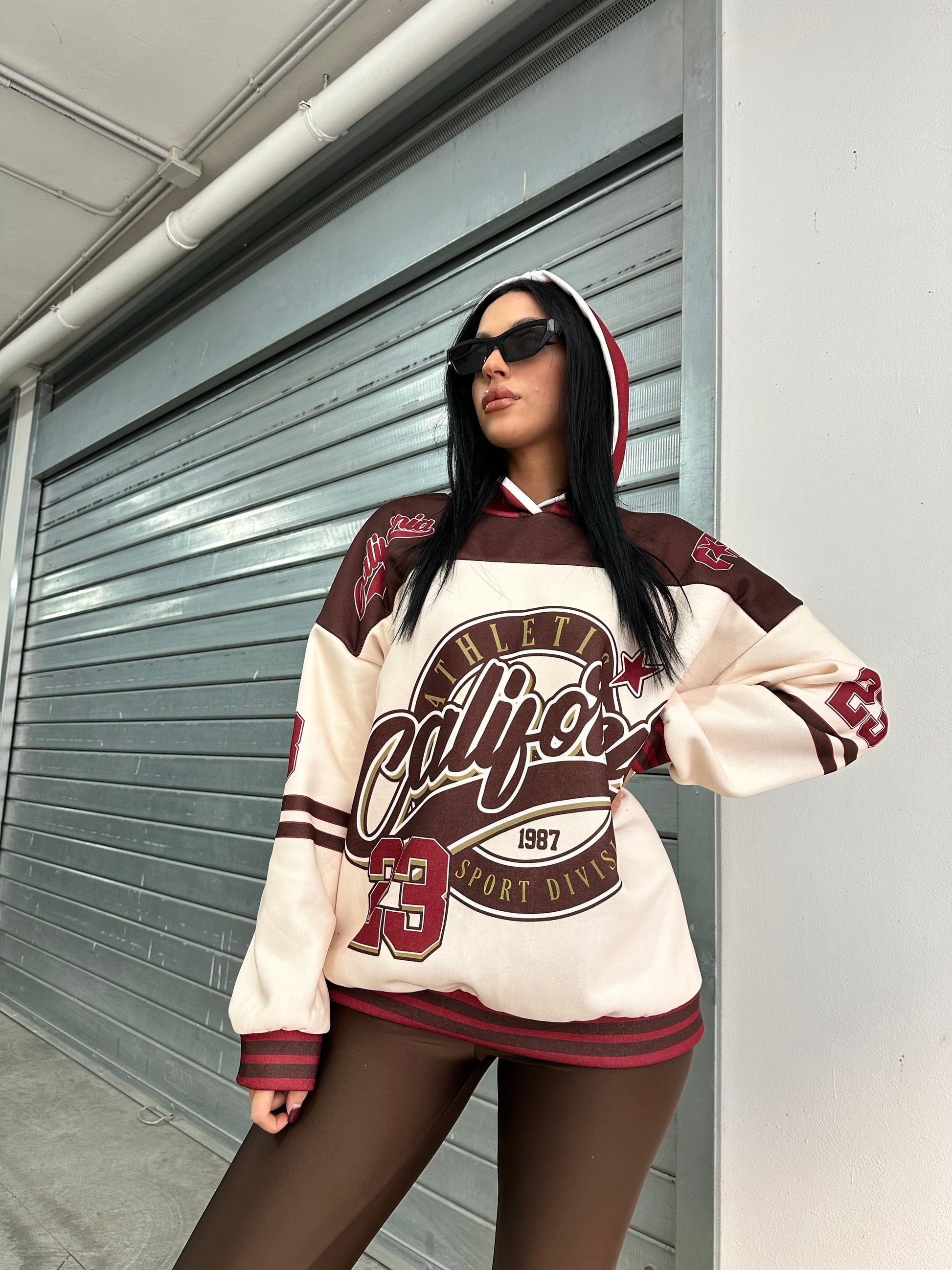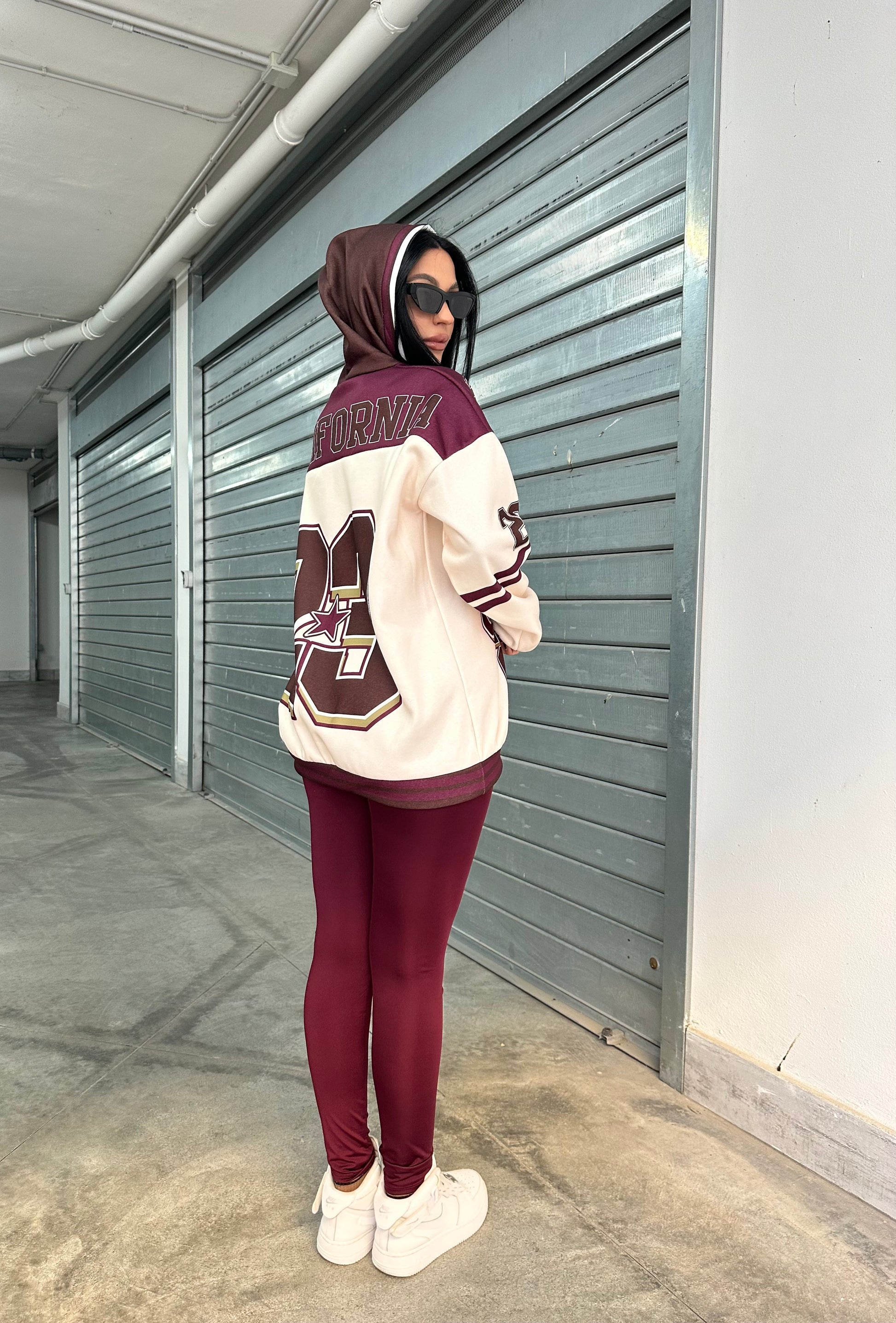 Felpa oversize con cappuccio e stampa college “California Athletics”, abbinata a leggings in lycra  effetto lucido.