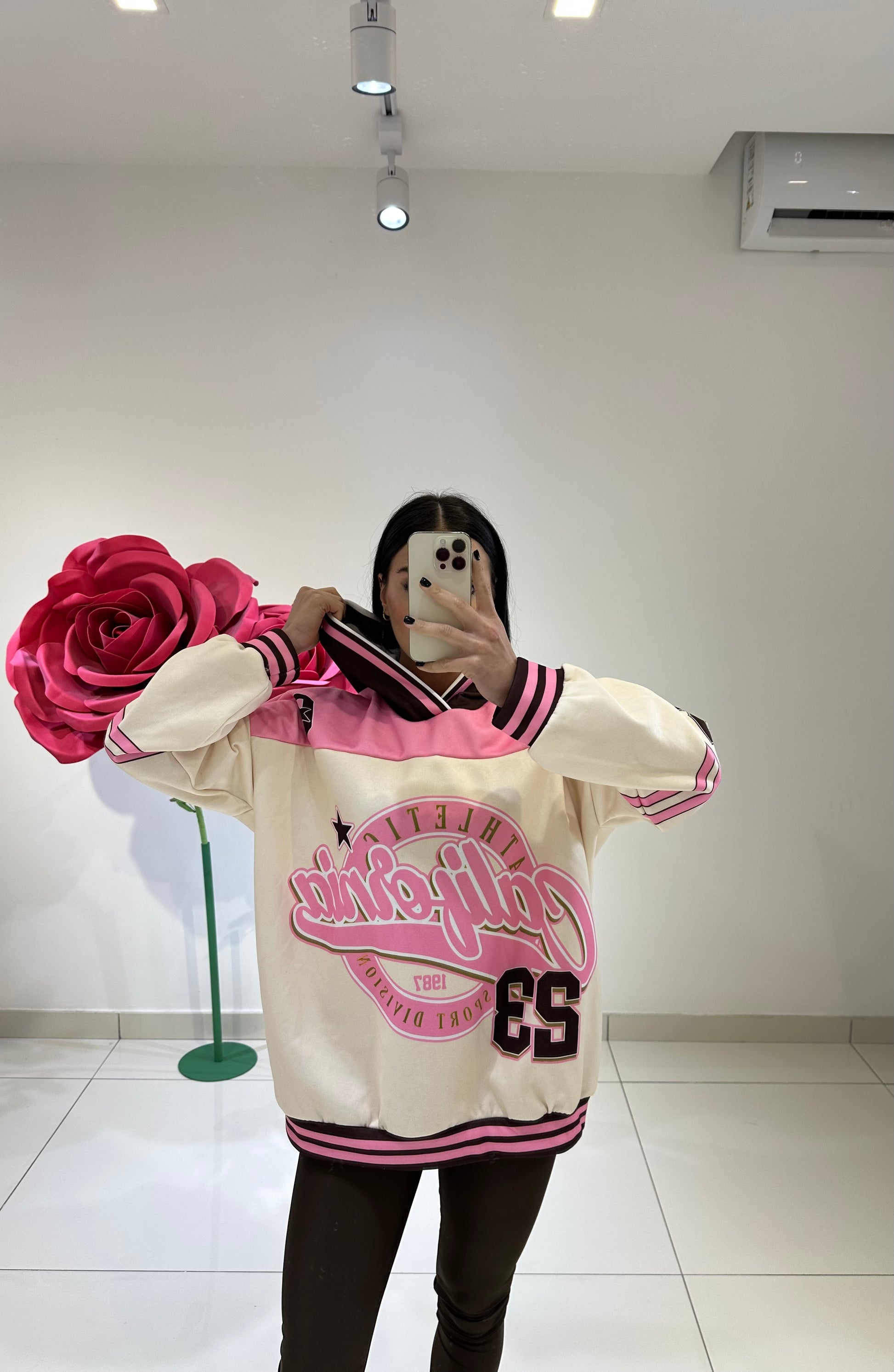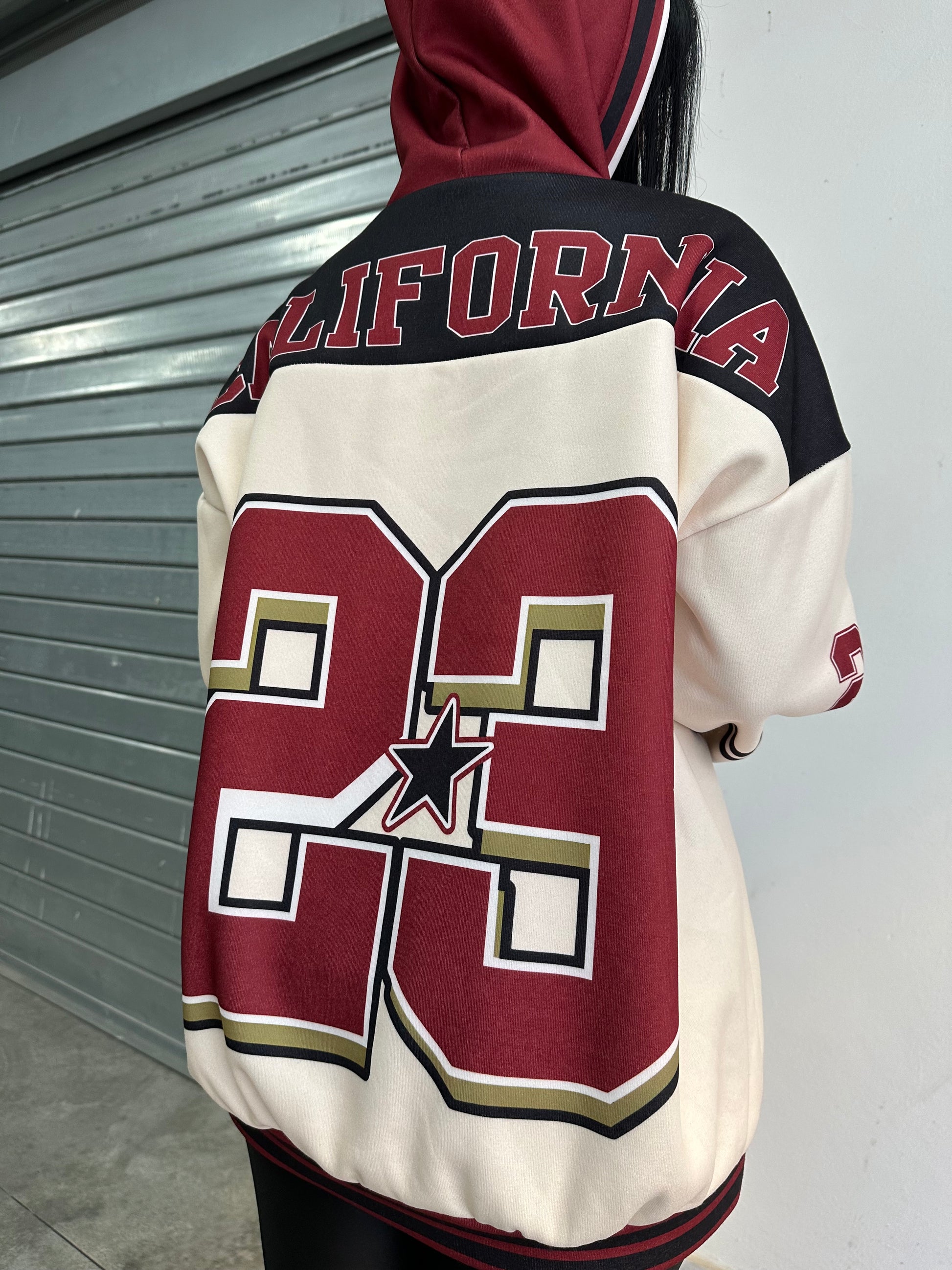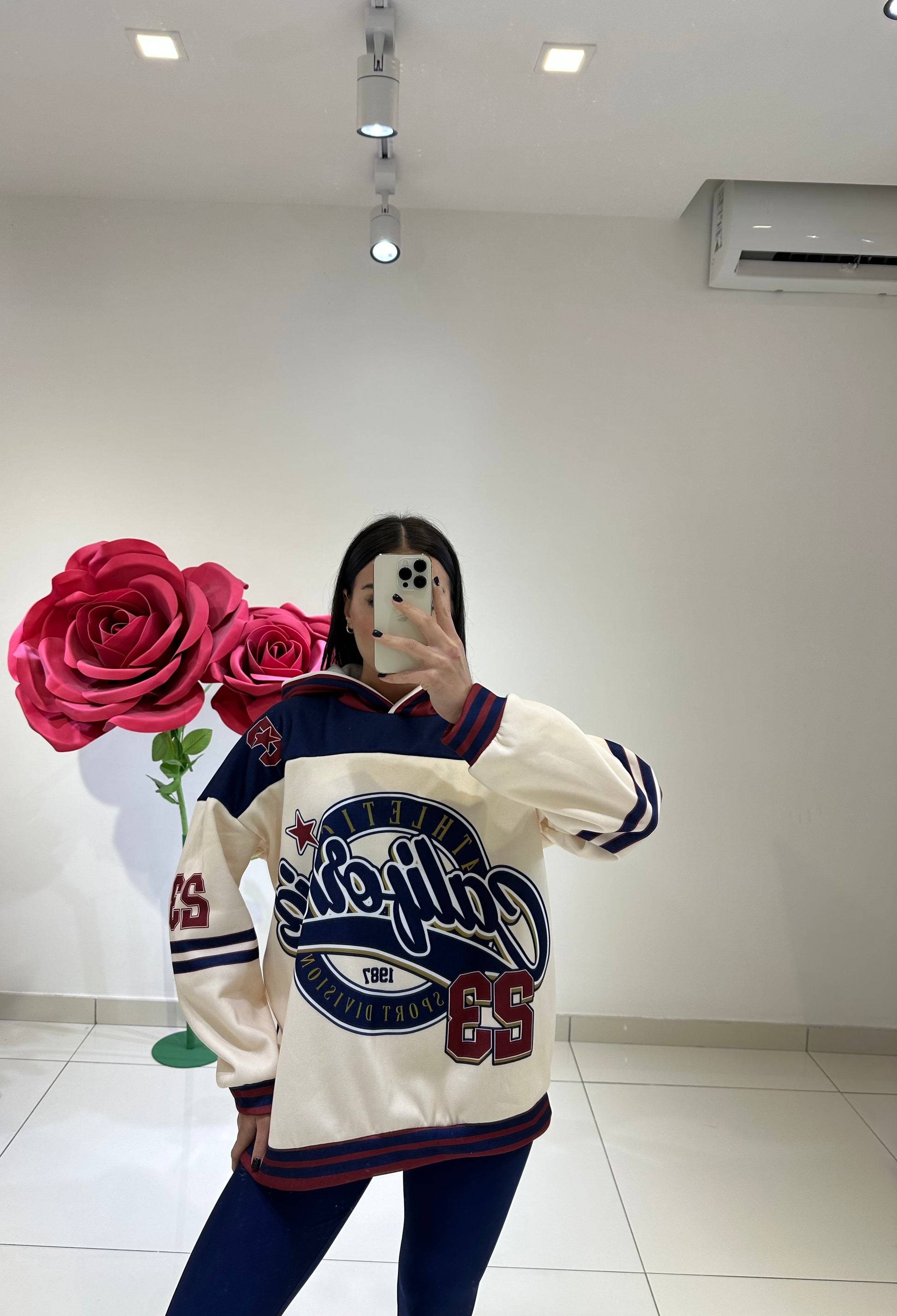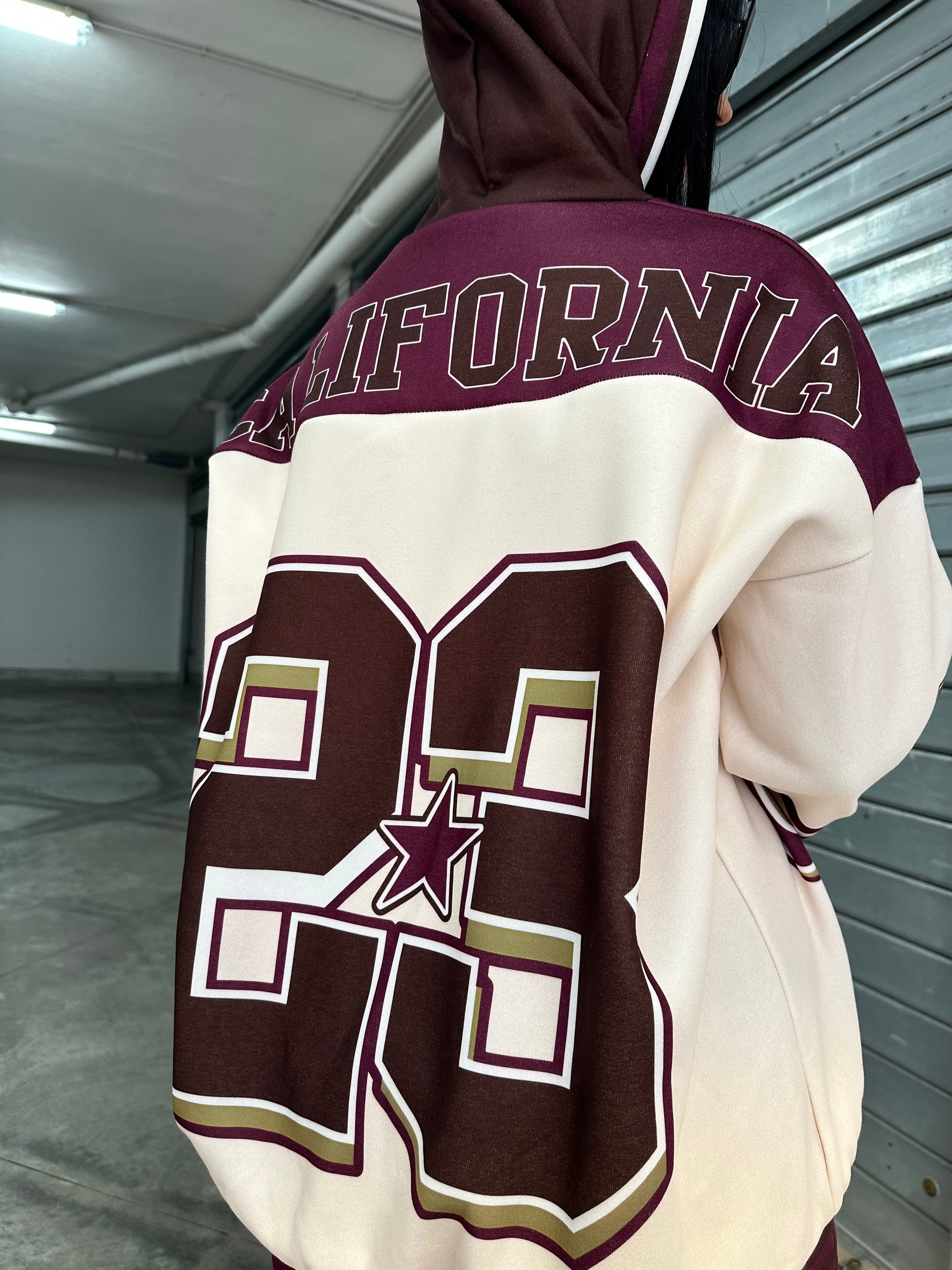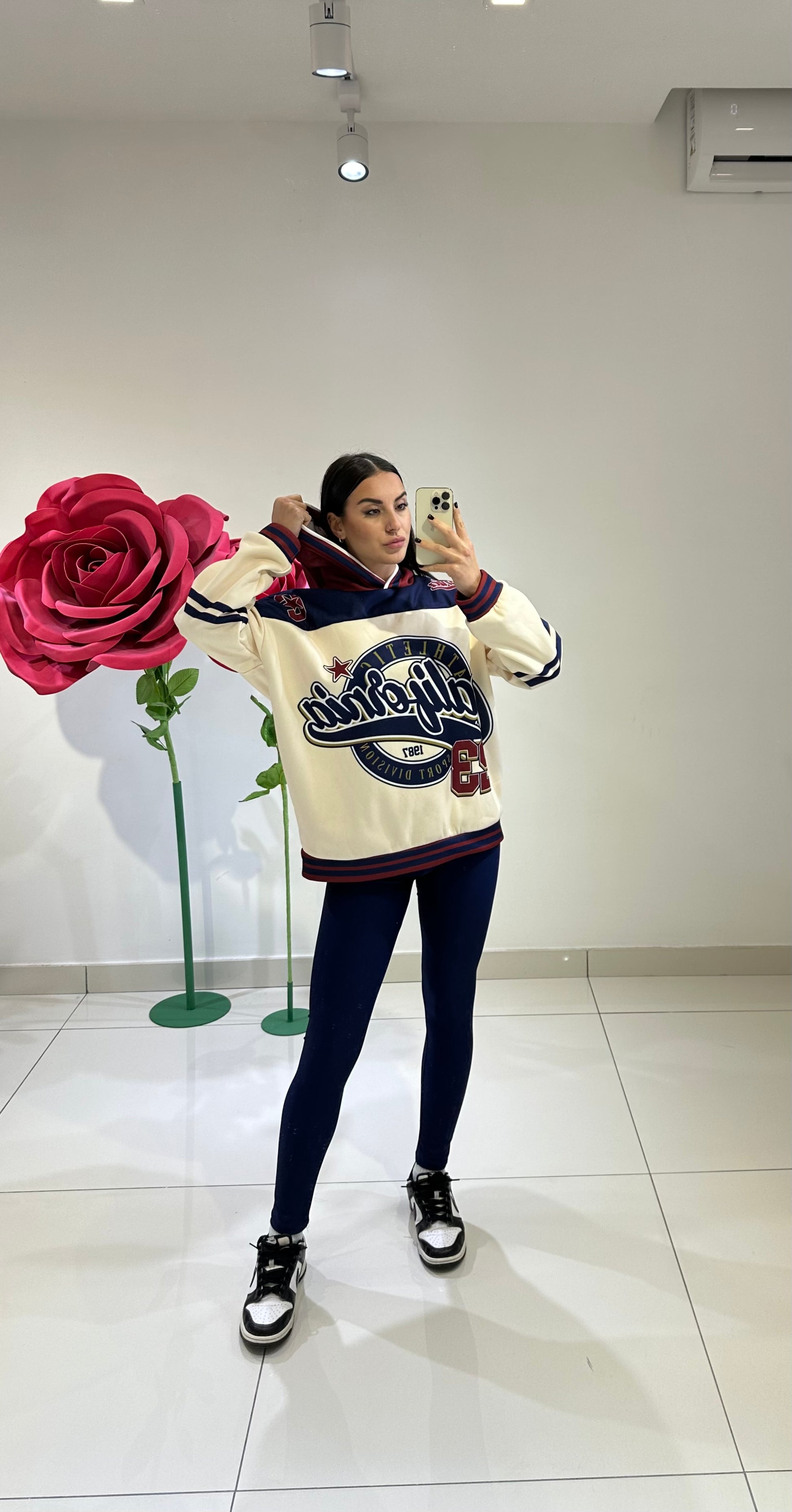 Felpa oversize con cappuccio e stampa college “California Athletics”, abbinata a leggings in lycra  effetto lucido.