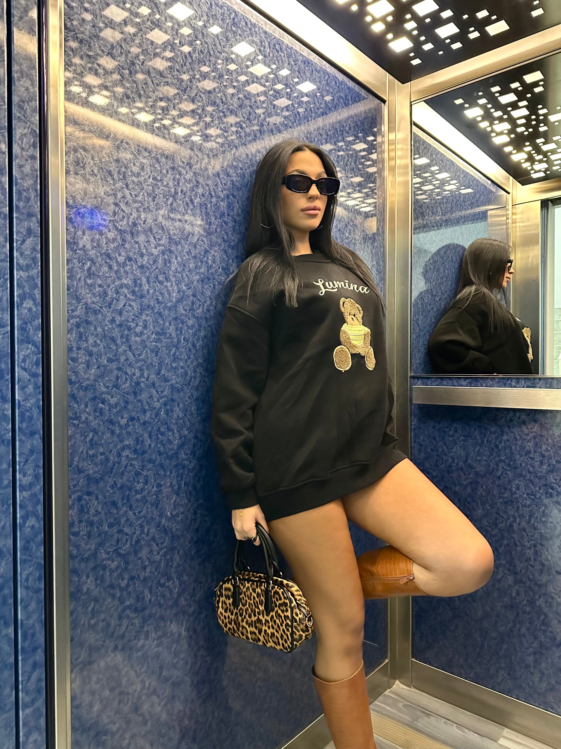 FELPA LUMINA, TOP QUALITY, TAGLIO LEGGERMENTE OVER , CALDO PILE ALL’INTERNO, STAMPA TEDDY LUMINA SUL DAVANTI.