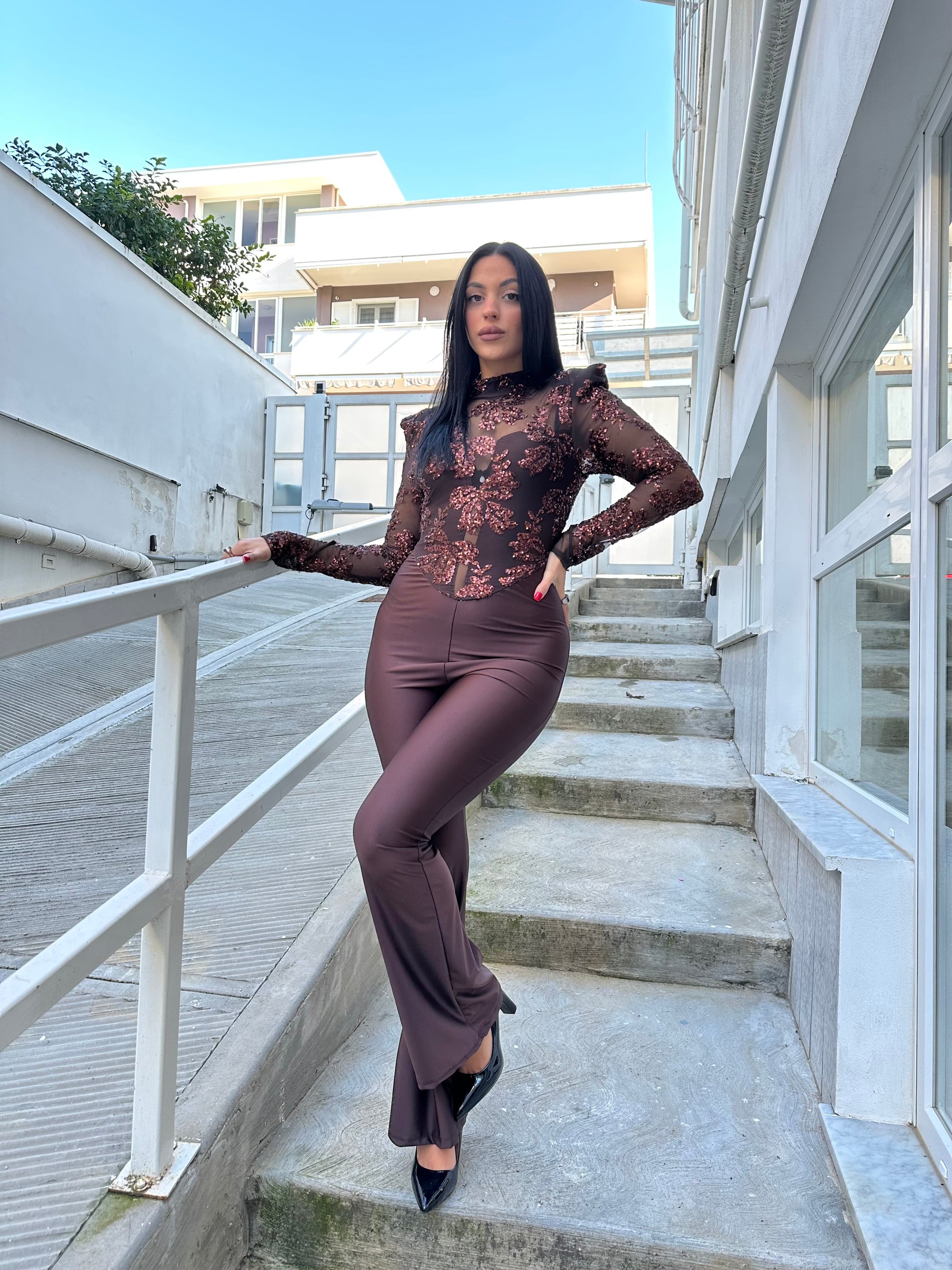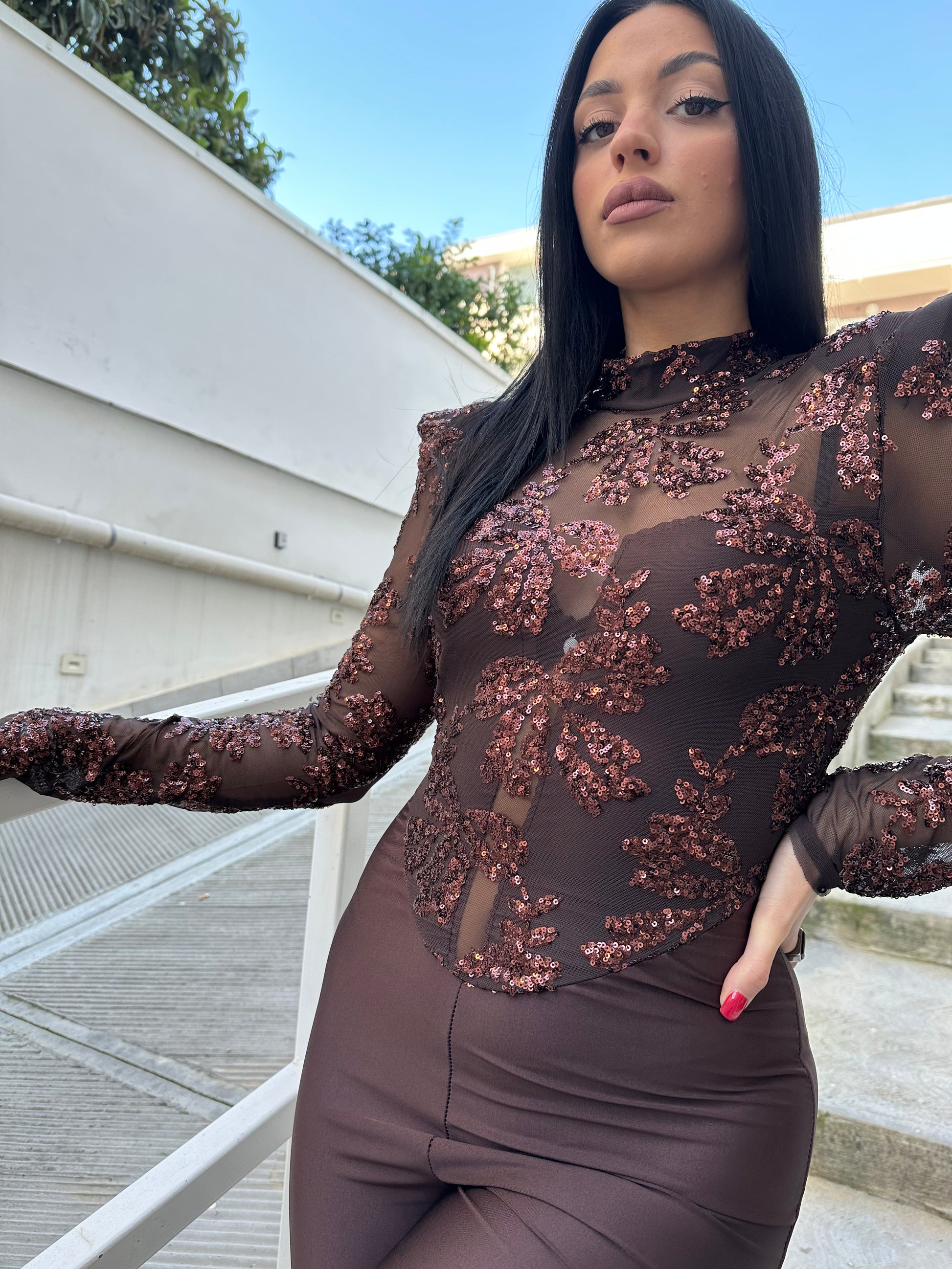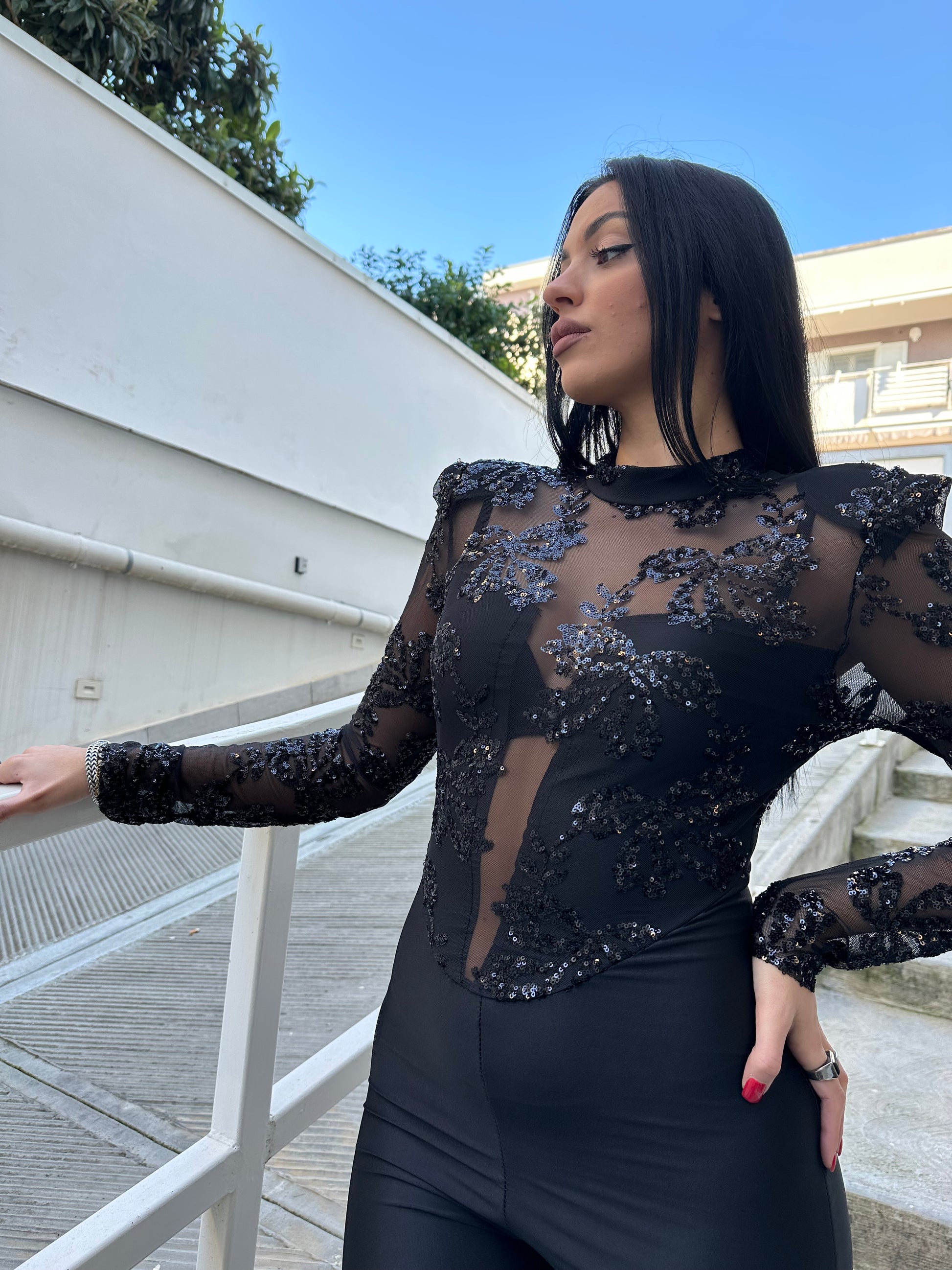 JUMPSUITE CON PARTE SUPERIORE IN TULLE DETTAGLIATA DA PAIETTE E SPALLINE IMBOTTITE,PARTE INFERIORE TOTAL LYCRA A ZAMPA. VARI COLORI.