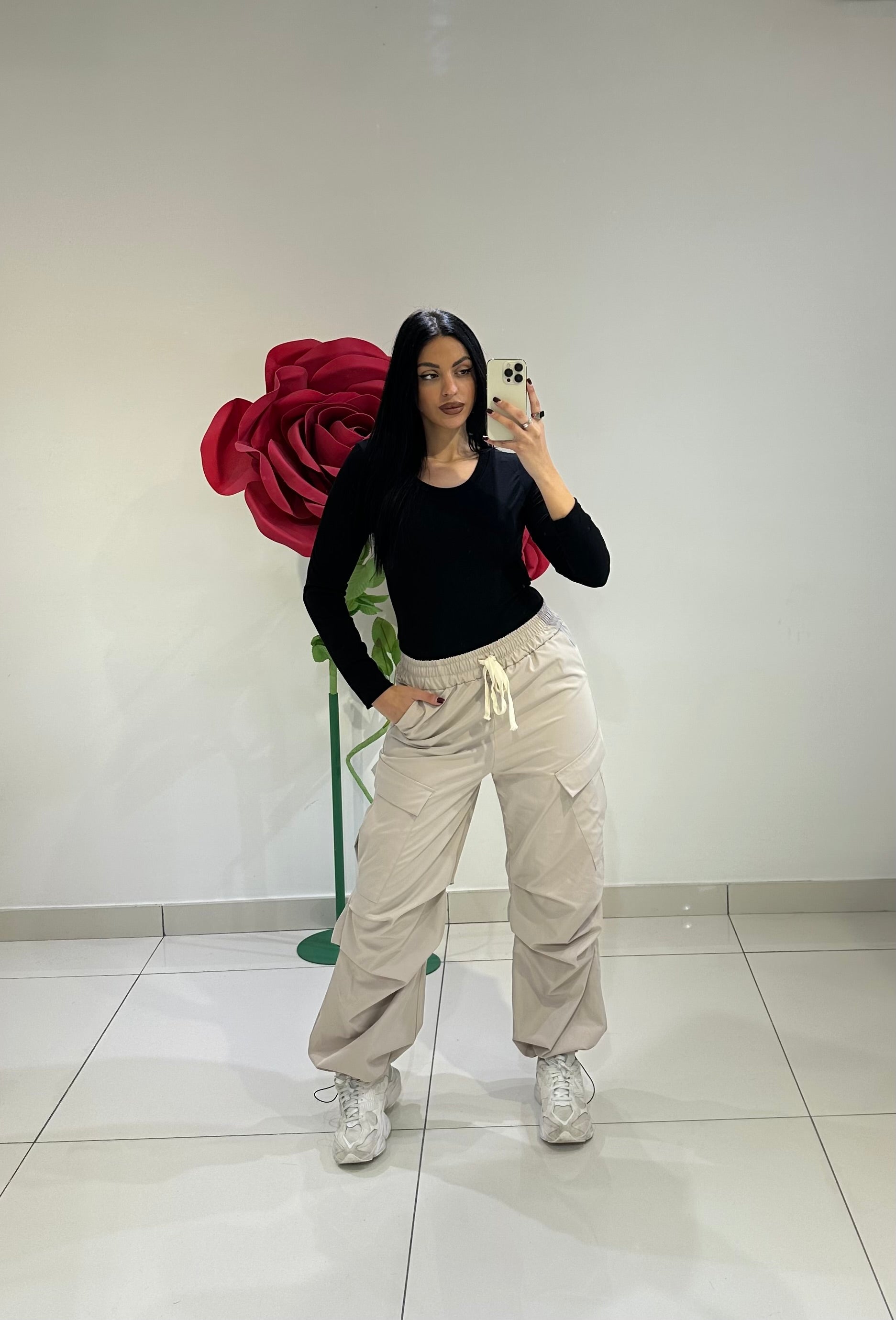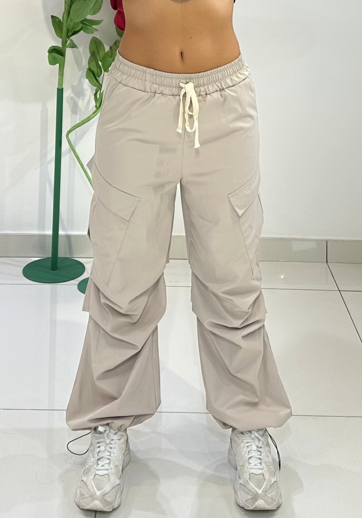 PARACHUTE CON ELASTICO IN VITA,TASCHE LATERALI , COULISSE ALLA CAVIGLIA REGOLABILE E MAXI TASCONI LATERALI CON DRAPPEGGIO.