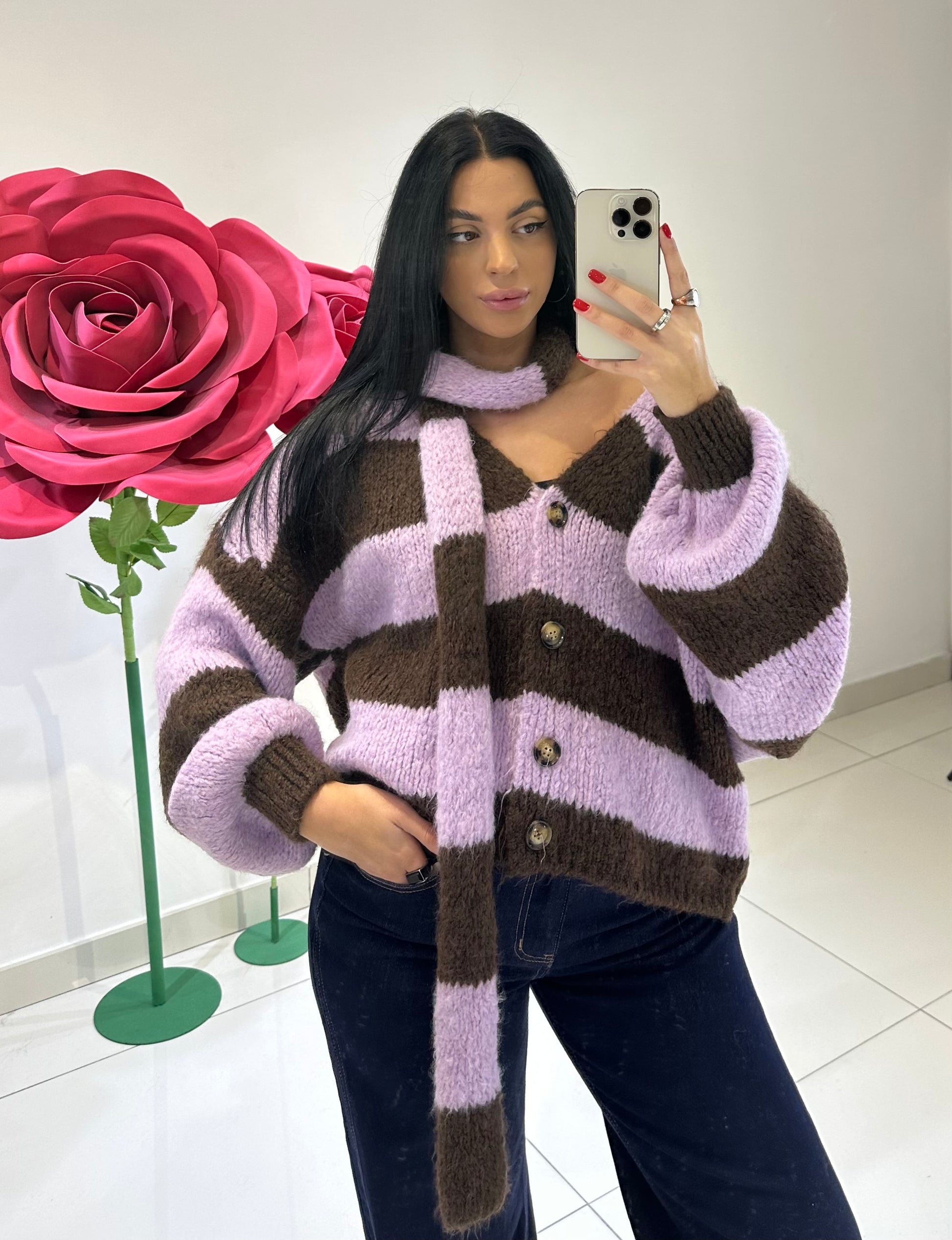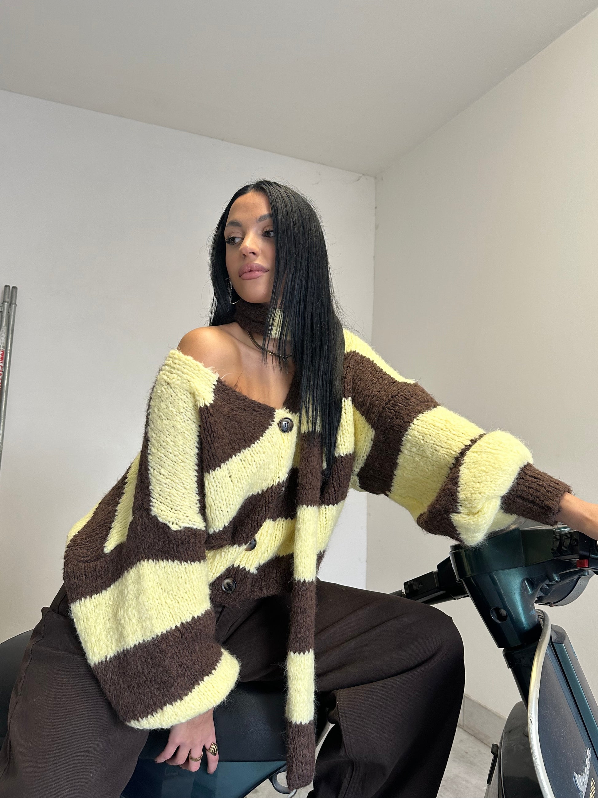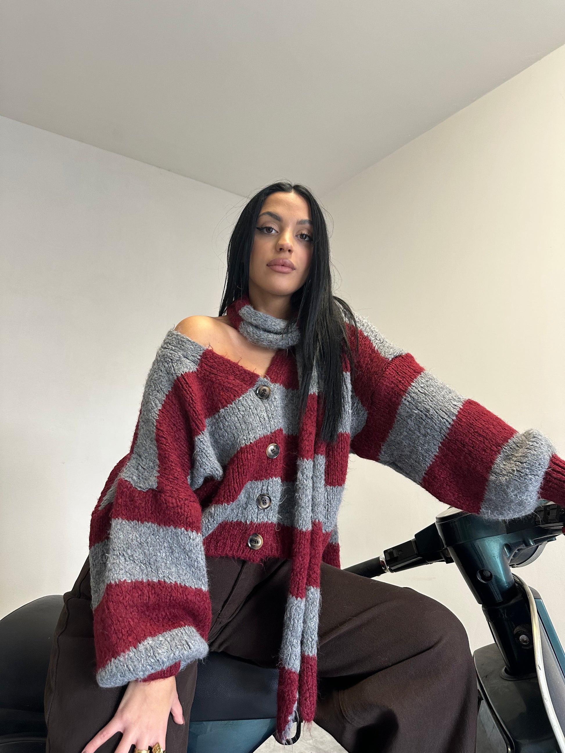 PULL IN LANA BICOLORE A RIGHE LARGHE,CHIUSURA A BOTTONI CENTRALE, MANICA A SBUFFO,SCOLLO A V E SCIARPA INCLUSA .
