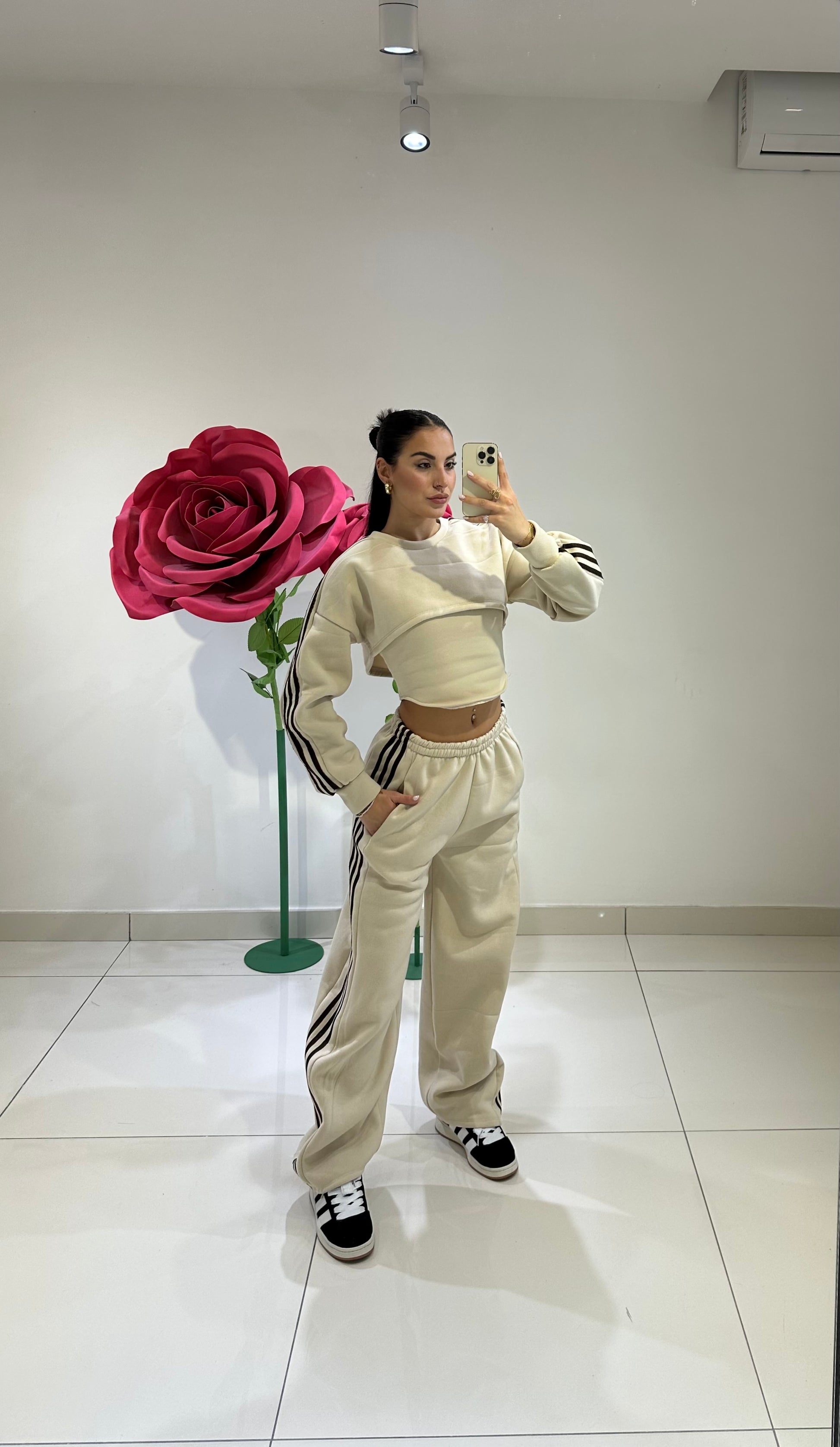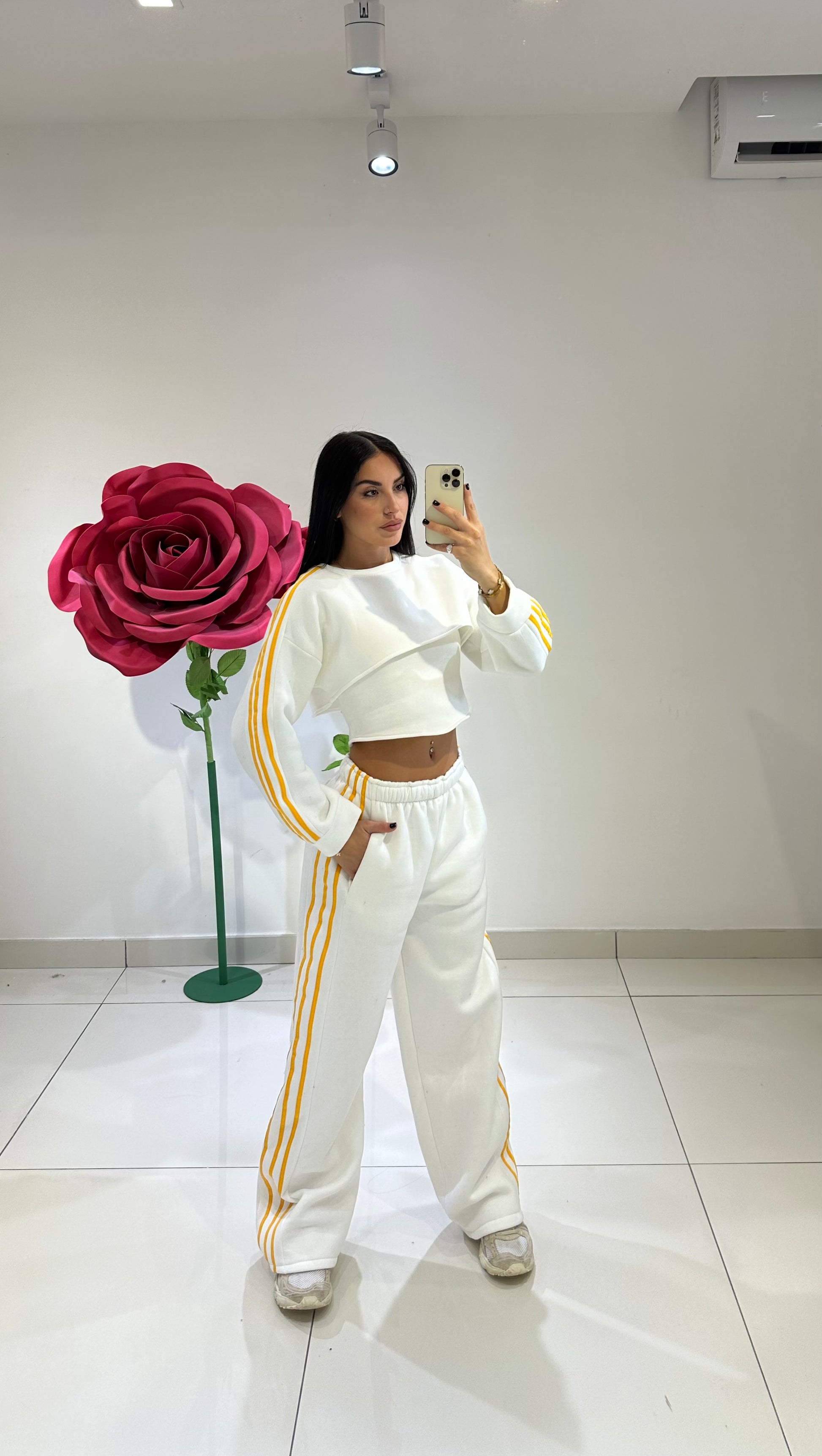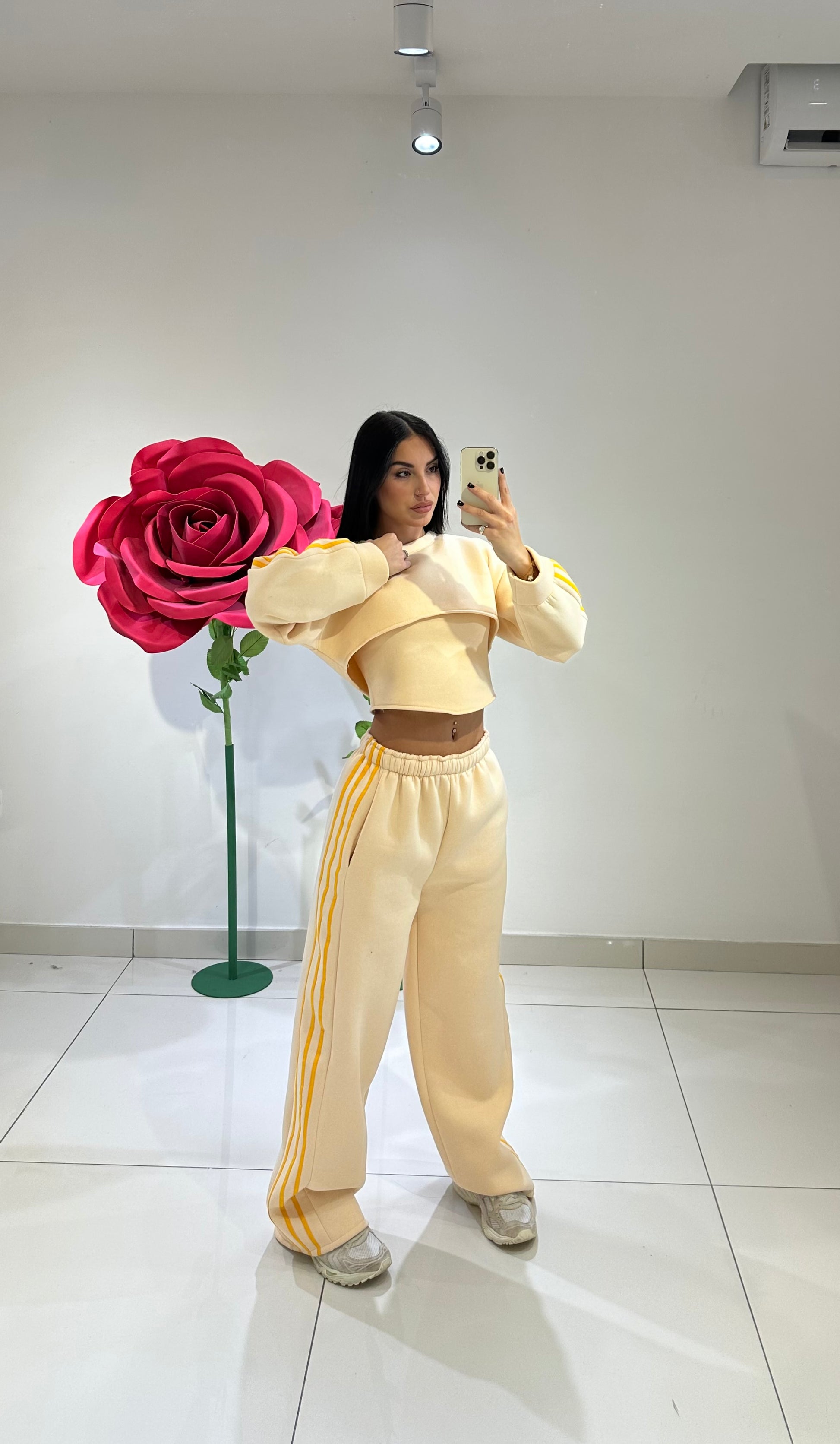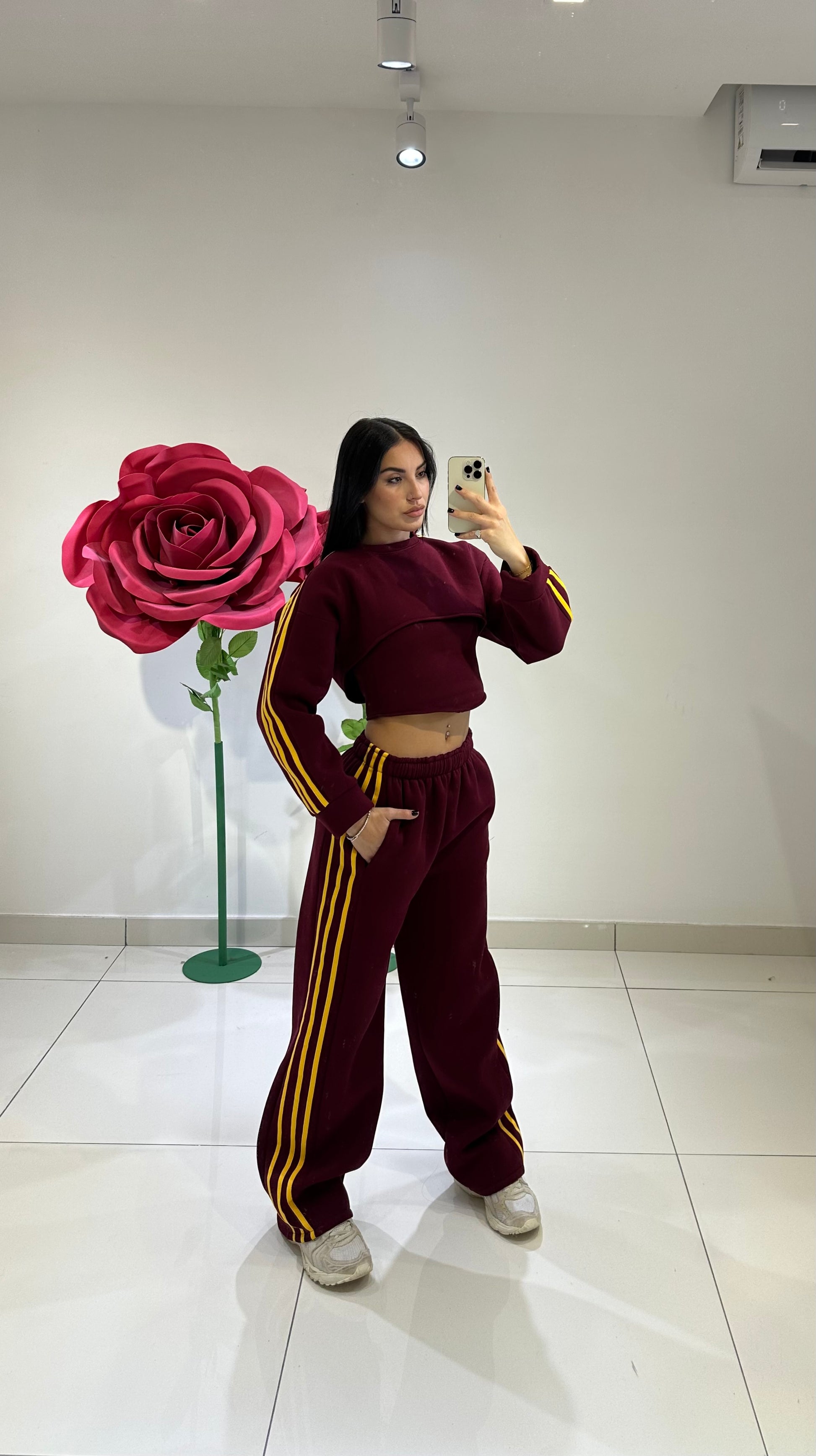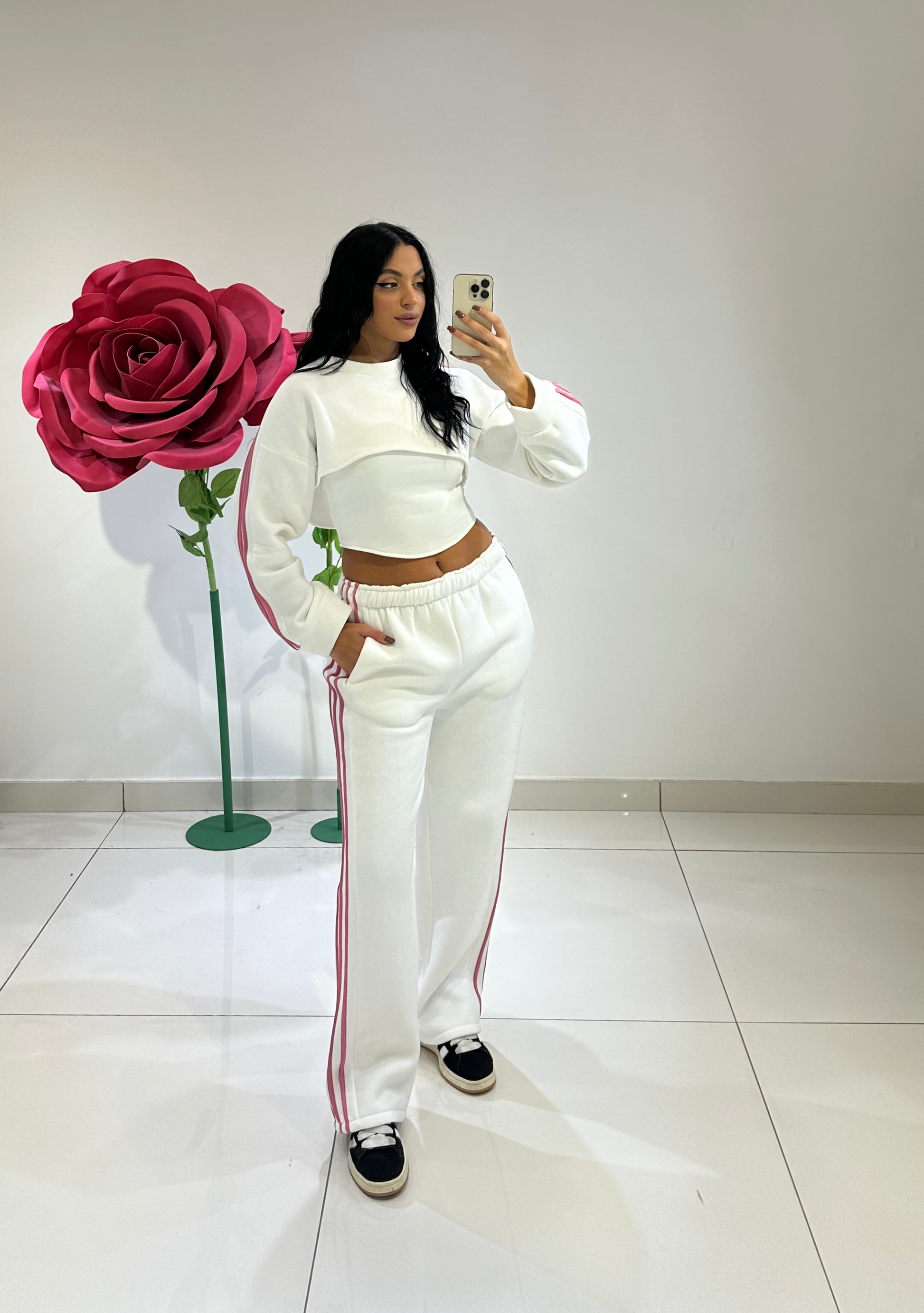 SET COMPOSTO DA TOP CON SPALLINA LARGA, FELPA CORTA AVANTI E LUNGA DIETRO CON FASCE LATERALI IN CONTRASTO DI COLORE CHE VENGONO RICHIAMATE ANCHE AI LATI DEL PANTALONE GAMBA DRITTA CON ELASTICO IN VITA, TUTTO IL SET È FELPATO ALL’INTERNO. IN VARI COLORI