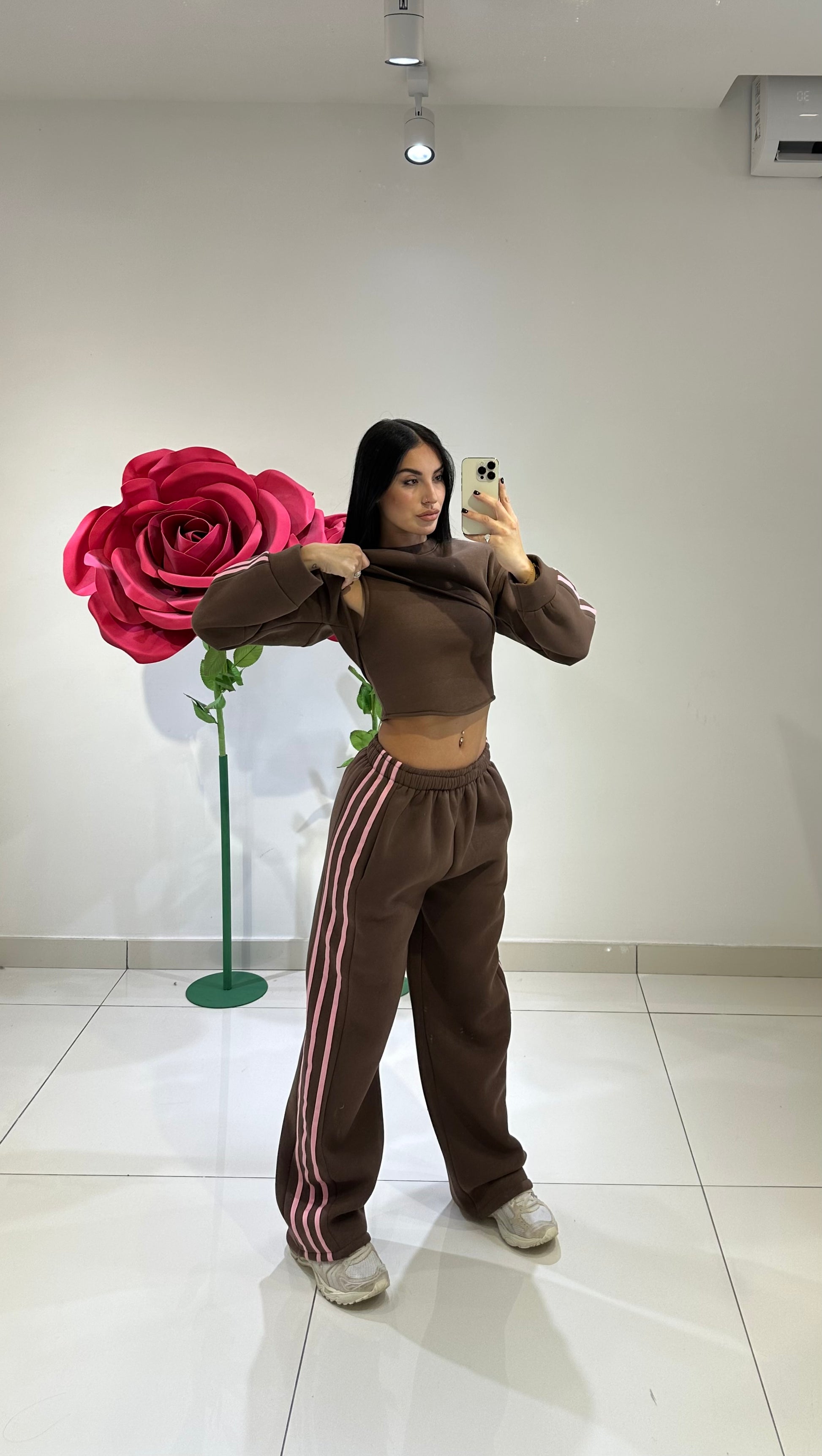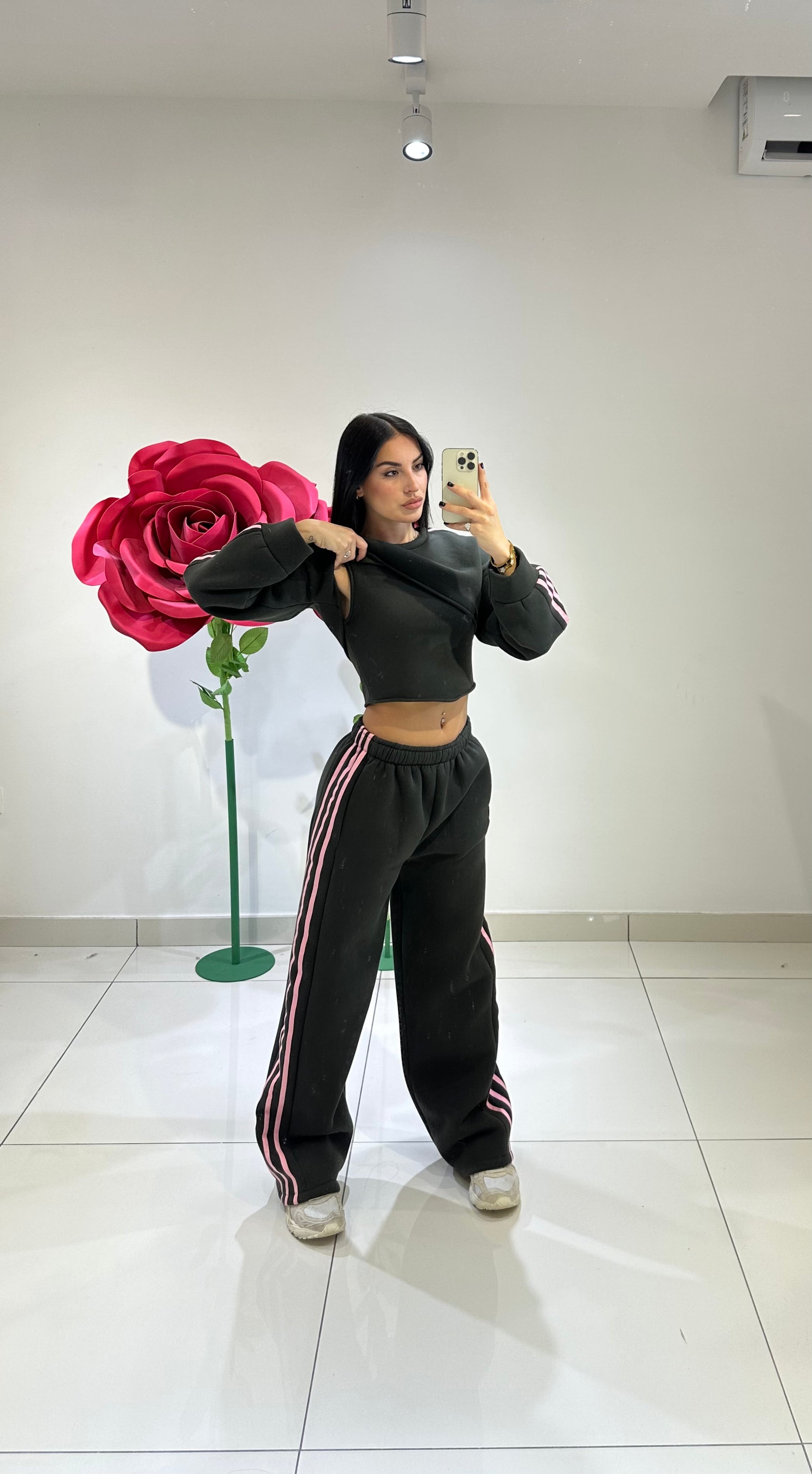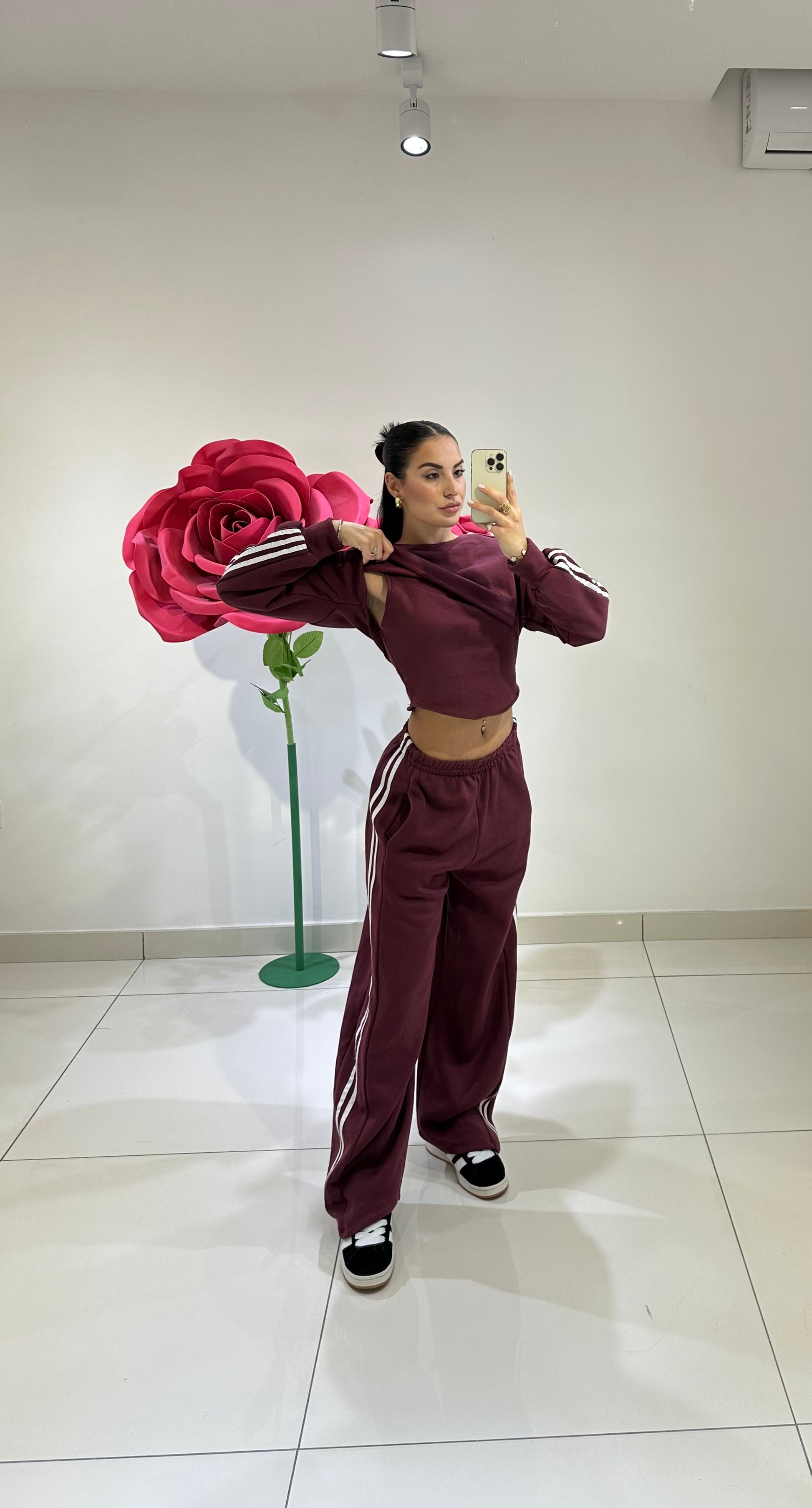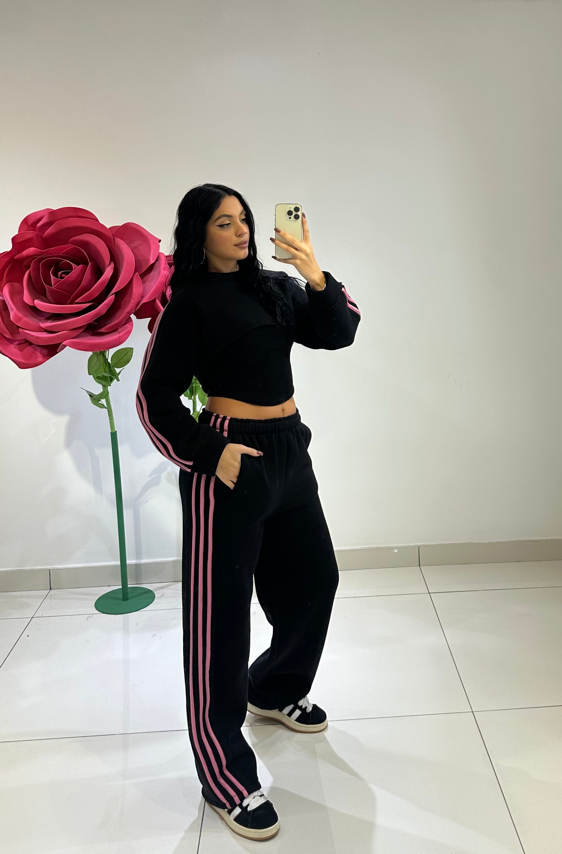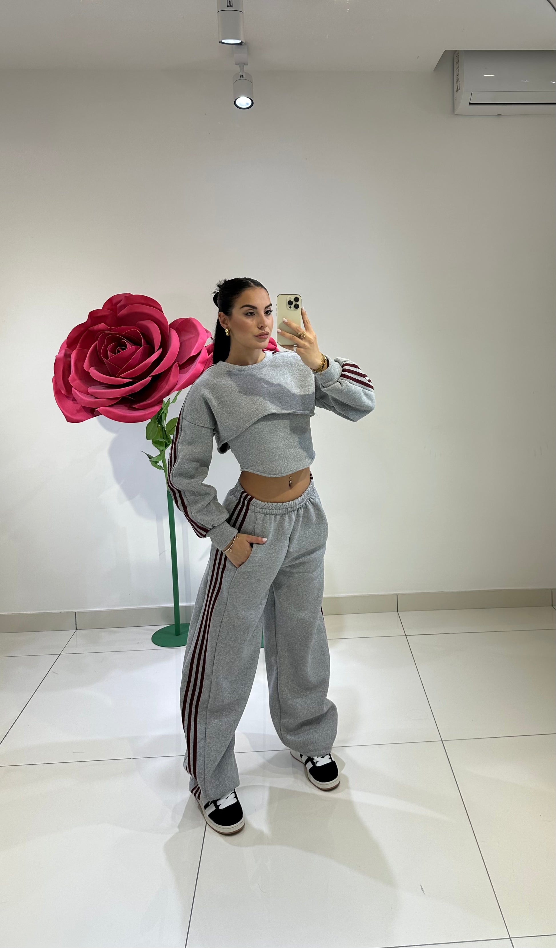 SET COMPOSTO DA TOP CON SPALLINA LARGA, FELPA CORTA AVANTI E LUNGA DIETRO CON FASCE LATERALI IN CONTRASTO DI COLORE CHE VENGONO RICHIAMATE ANCHE AI LATI DEL PANTALONE GAMBA DRITTA CON ELASTICO IN VITA, TUTTO IL SET È FELPATO ALL’INTERNO. IN VARI COLORI