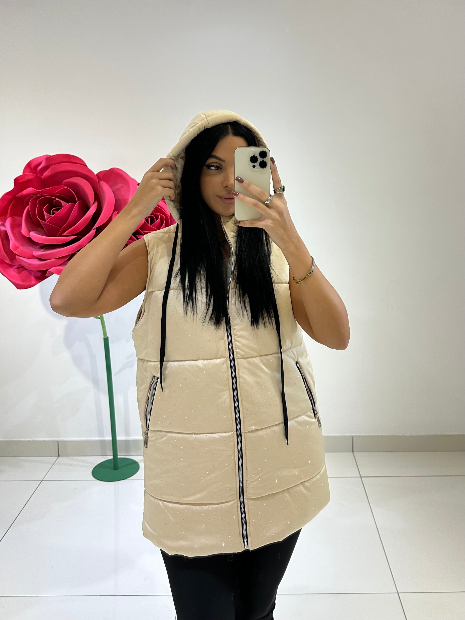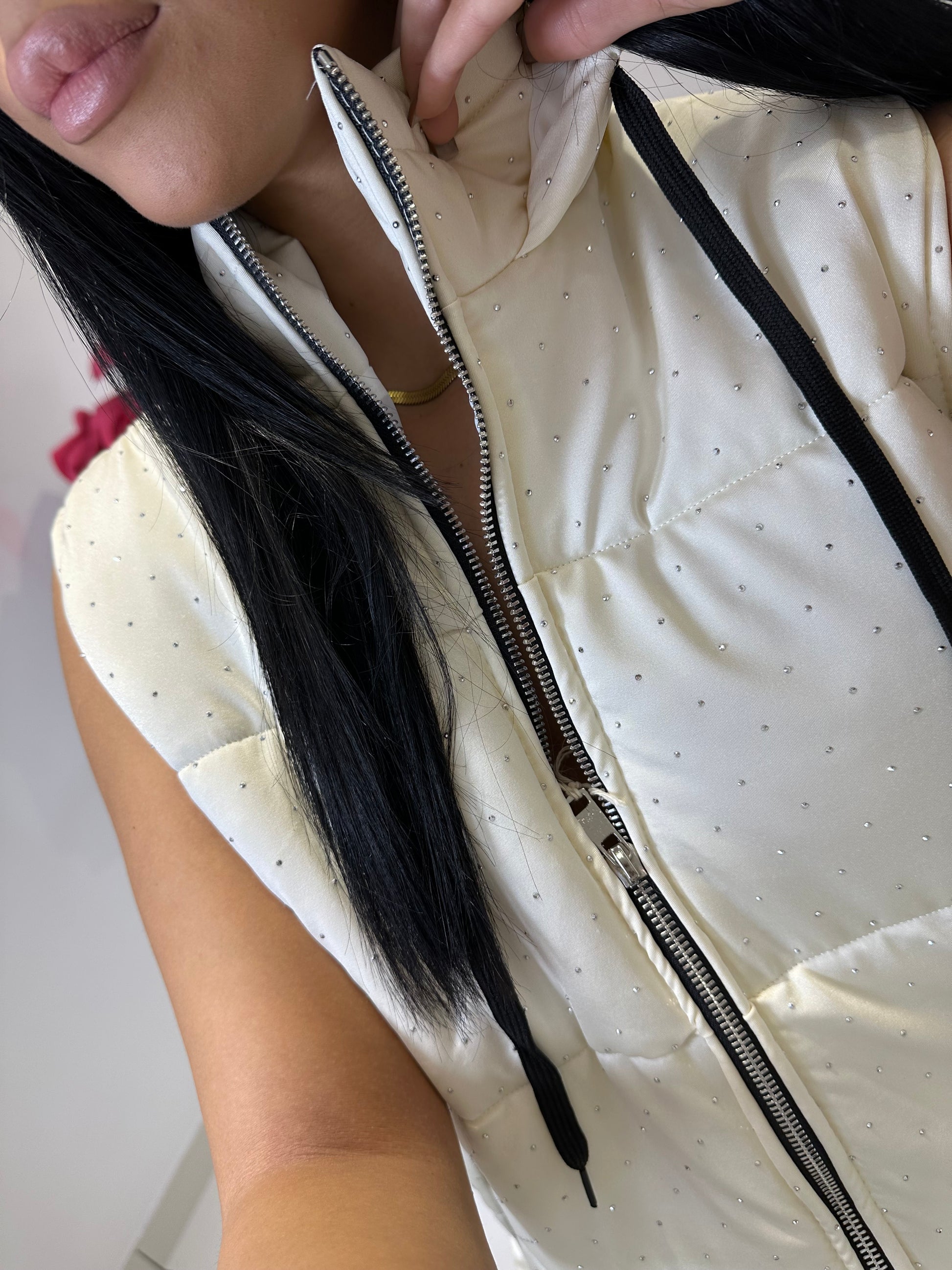 SMANICATO INTERAMENTE TEMPESTATO DI STRASS CON ZIP CENTRALE ,TASCHE LATERALI E CAPPUCCIO. VARI COLORI
