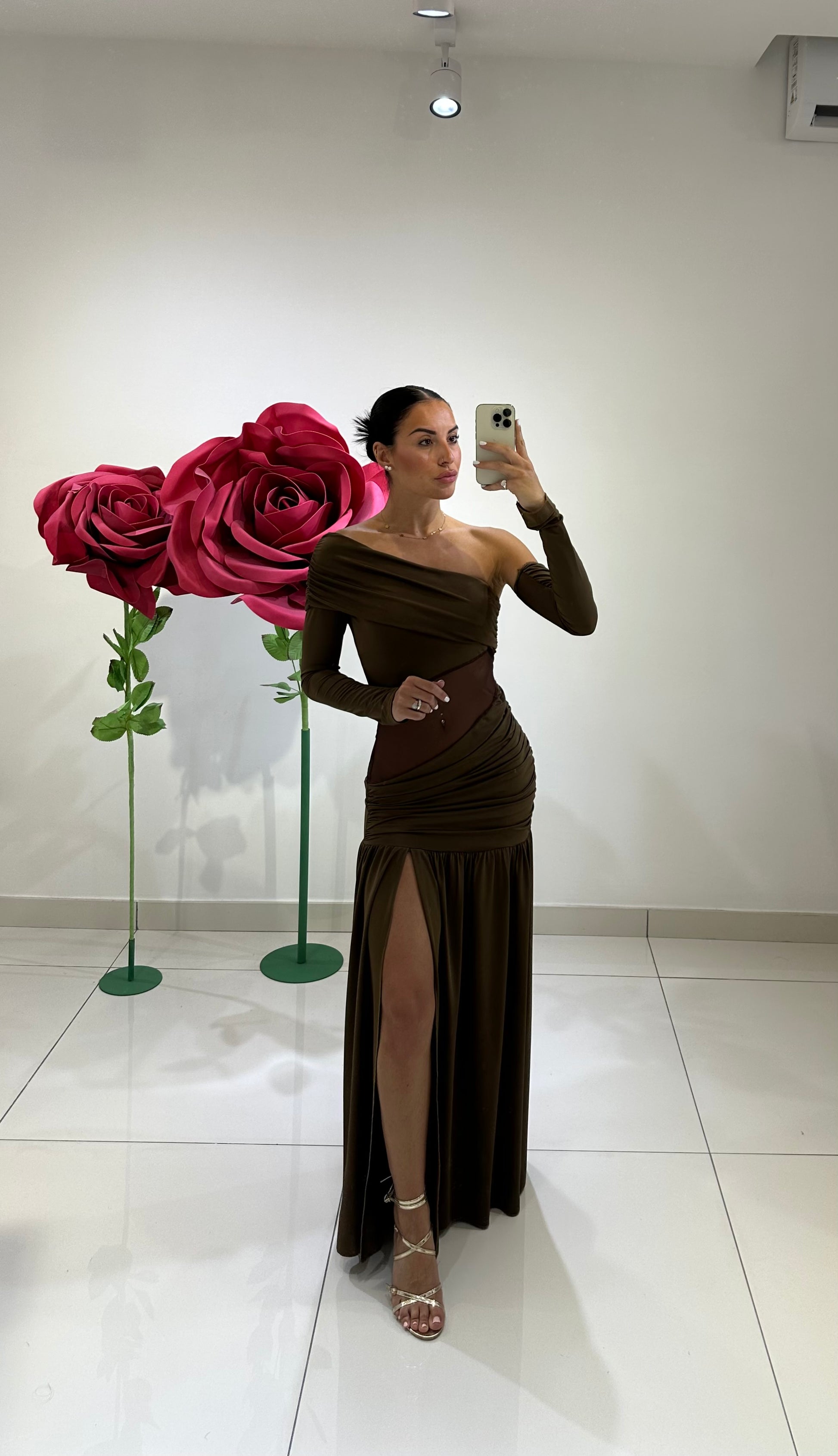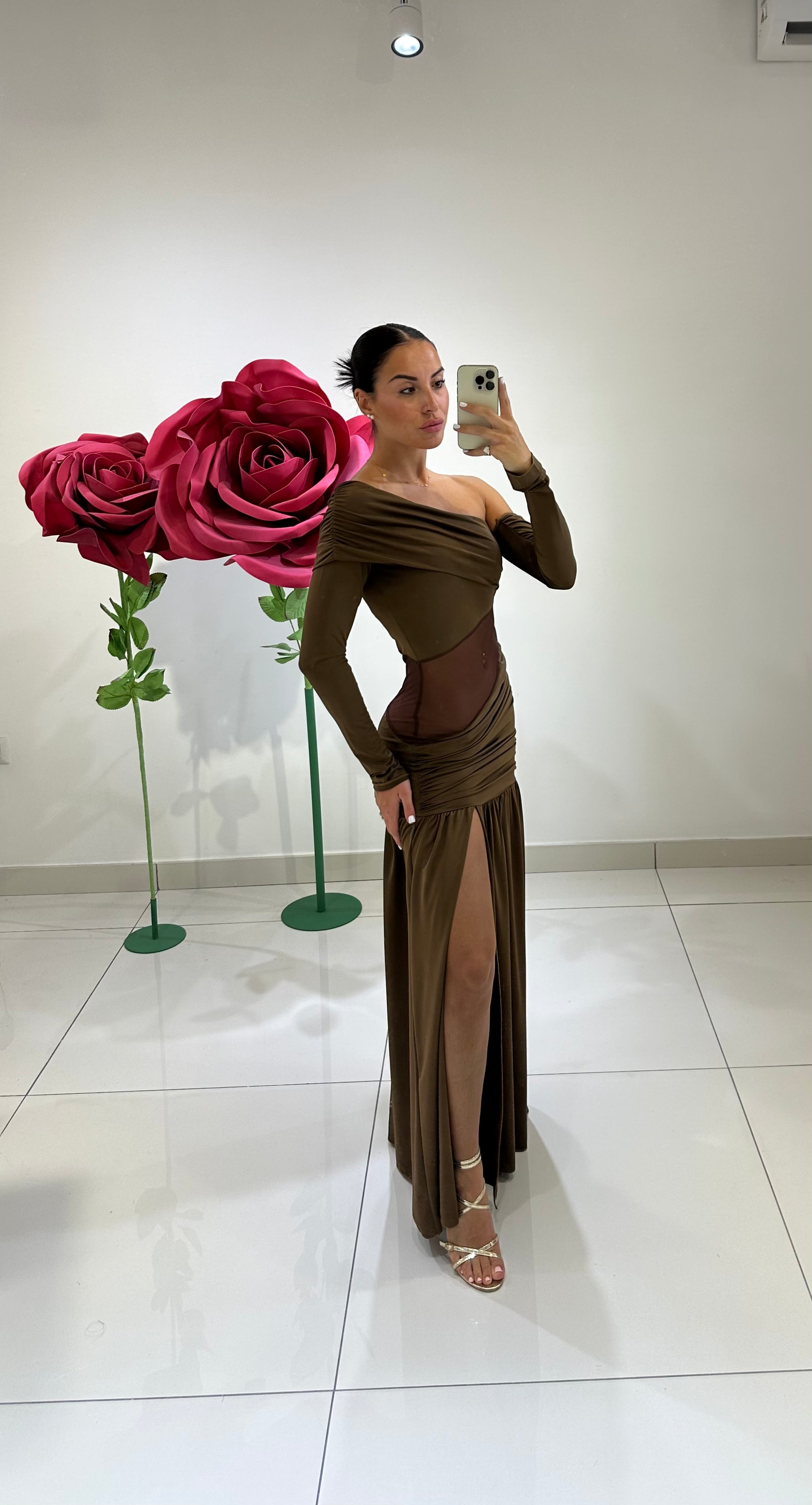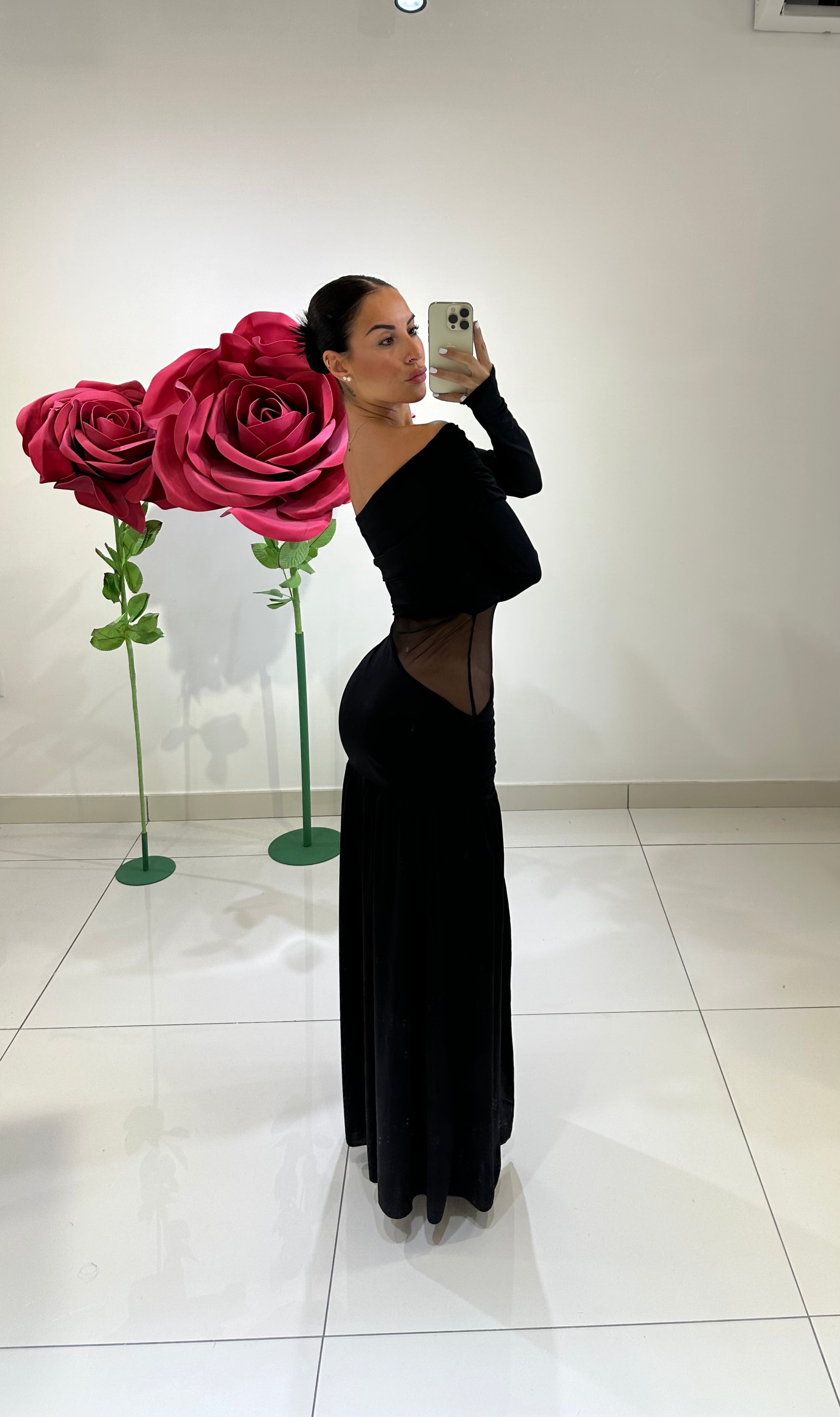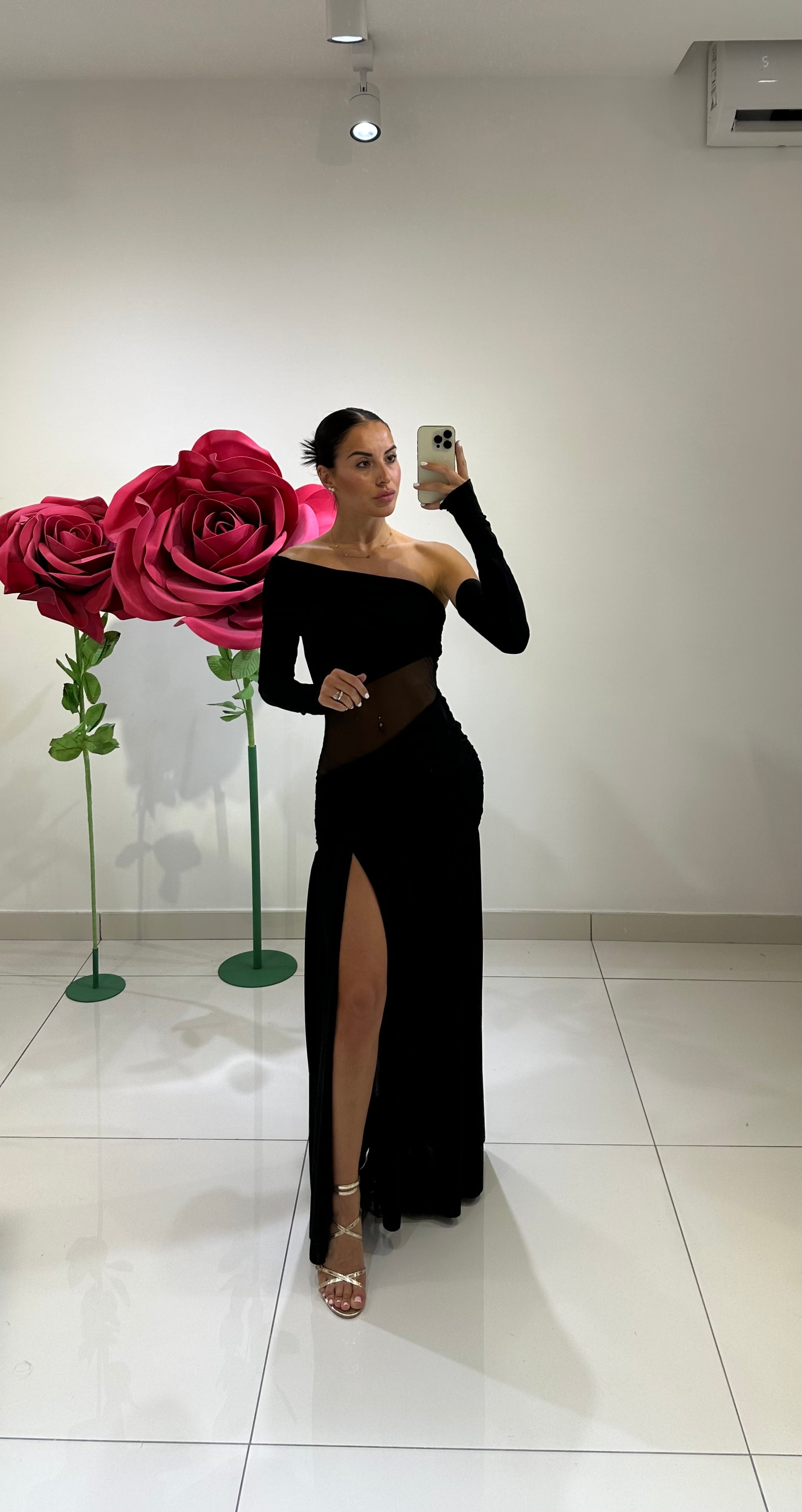 ABITO IN LYCRA, MONOSPALLA CON RISVOLTO SUL DÉCOLLETÉ, MANICOTTO REMOVIBILE. PARTE CENTRALE DETTAGLIATA DA TULLE, GONNA GONA DRAPPEGGIATA CON SPACCO. IN VARI COLORI