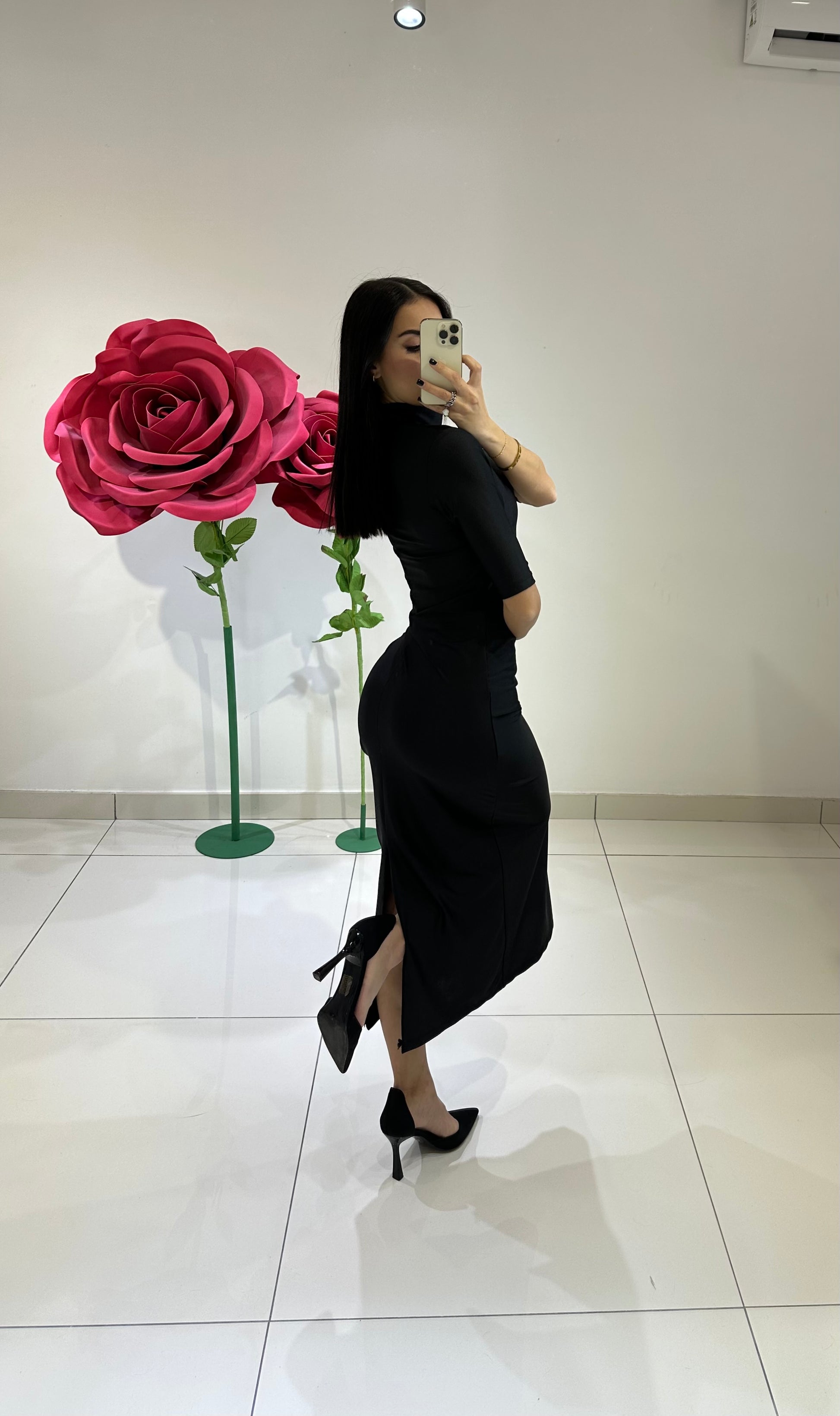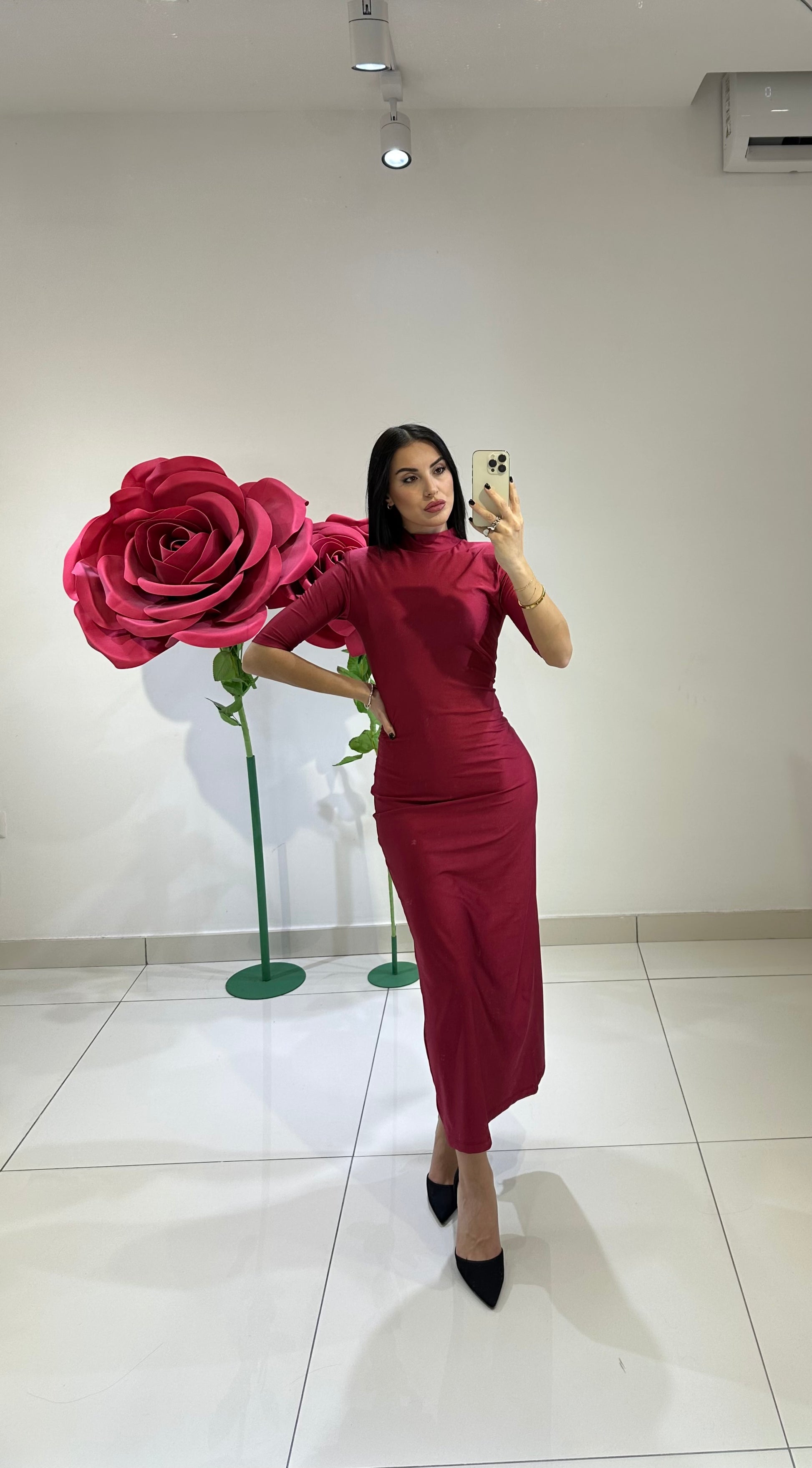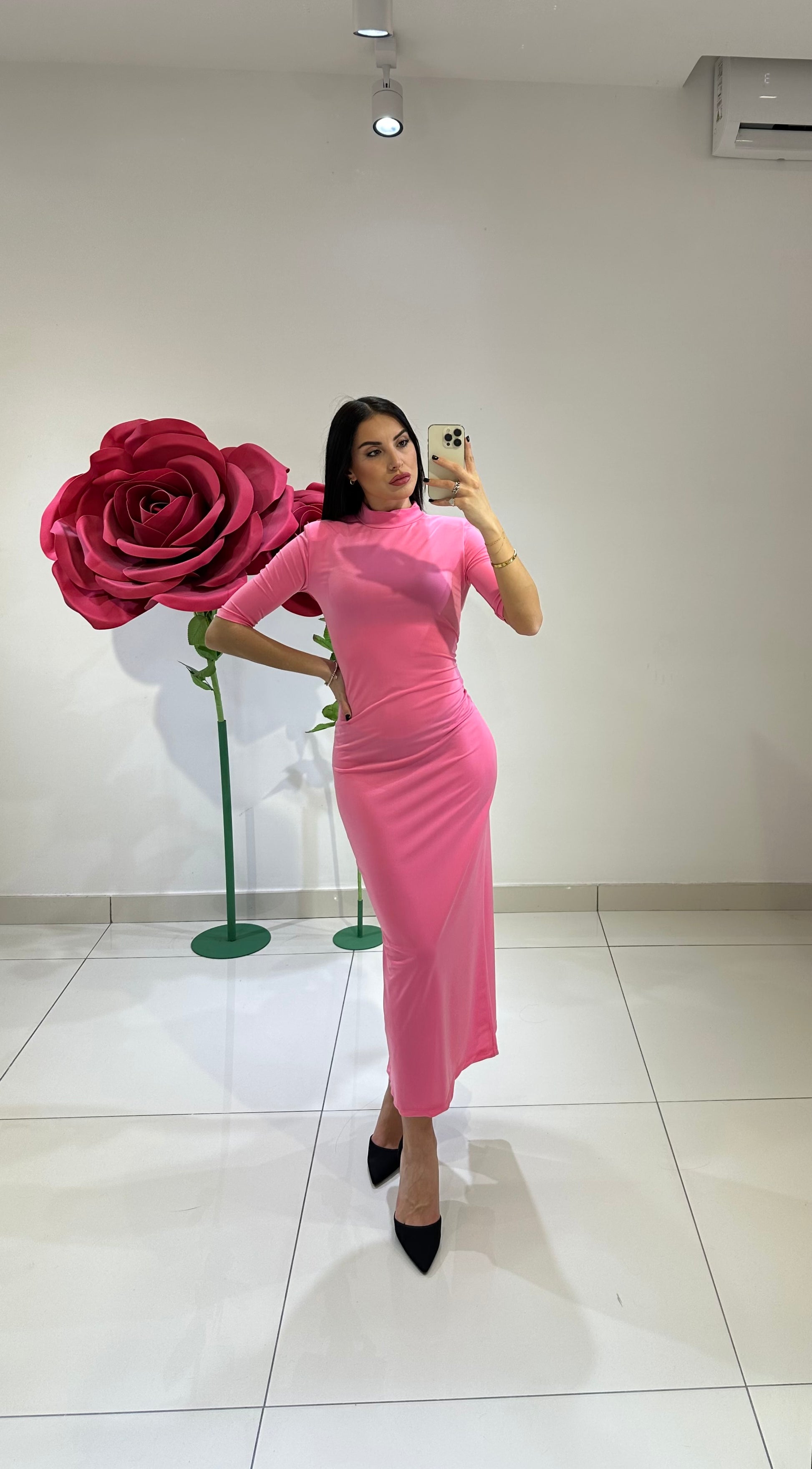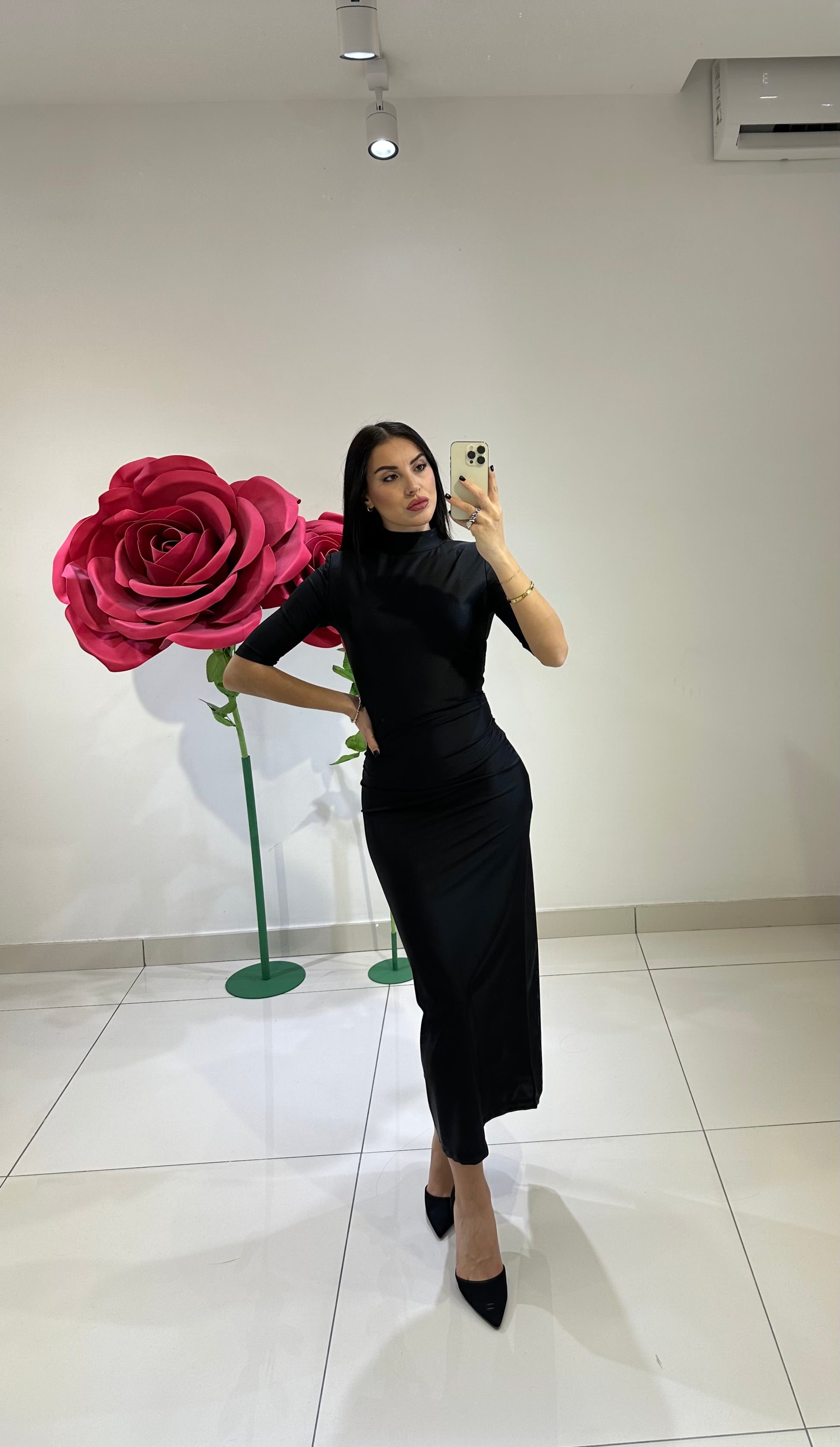 ABITO IN LYCRA CON MEZZO COLLO, MANICA A TRE QUARTI CON SPALLINE IMBOTTITE, GONNA ALLA CAVIGLIA CON SPACCO SUL RETRO. IN VARI COLORI