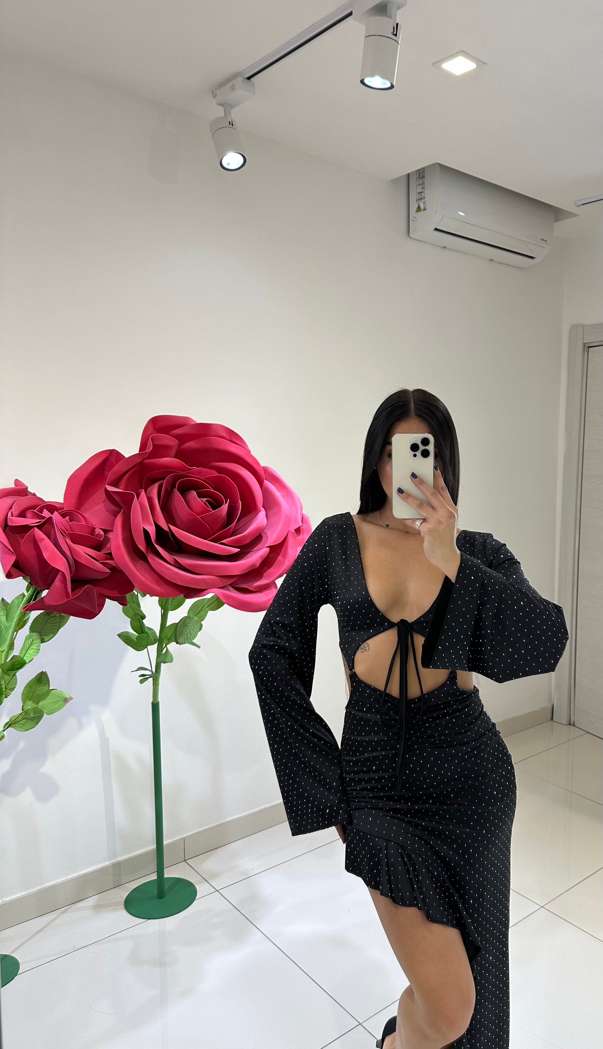 ABITO LUNGO IN LYCRA, FULL STRASS, MANICA LUNGA AMPI AL FONDO, APERTURE CON DAVANTI E SUL RETRO, AMPIO SPACCO LATERALE DETTAGLIO DA VOLANT.