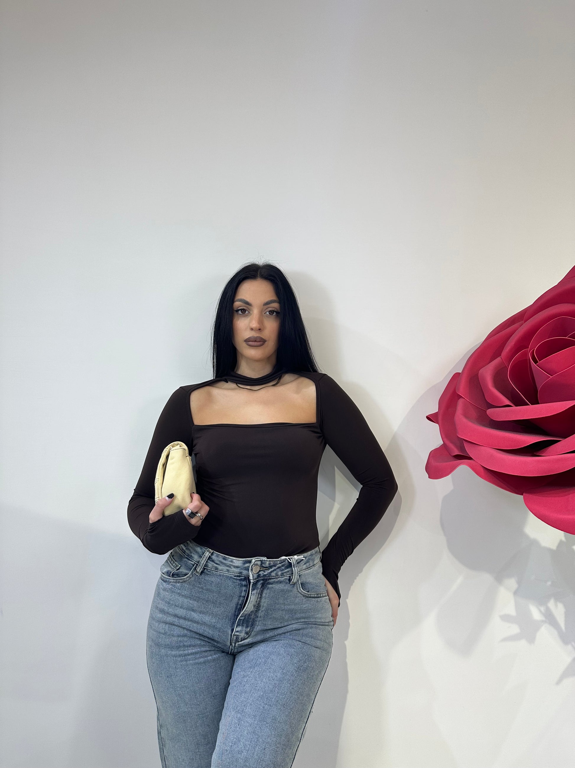 BODY CON AMPIO SCOLLO E CHOKER ,MANICA MEZZO GUANTO. TESSUTO VEDO NON VEDO, COPPETTE PREFORMATE.