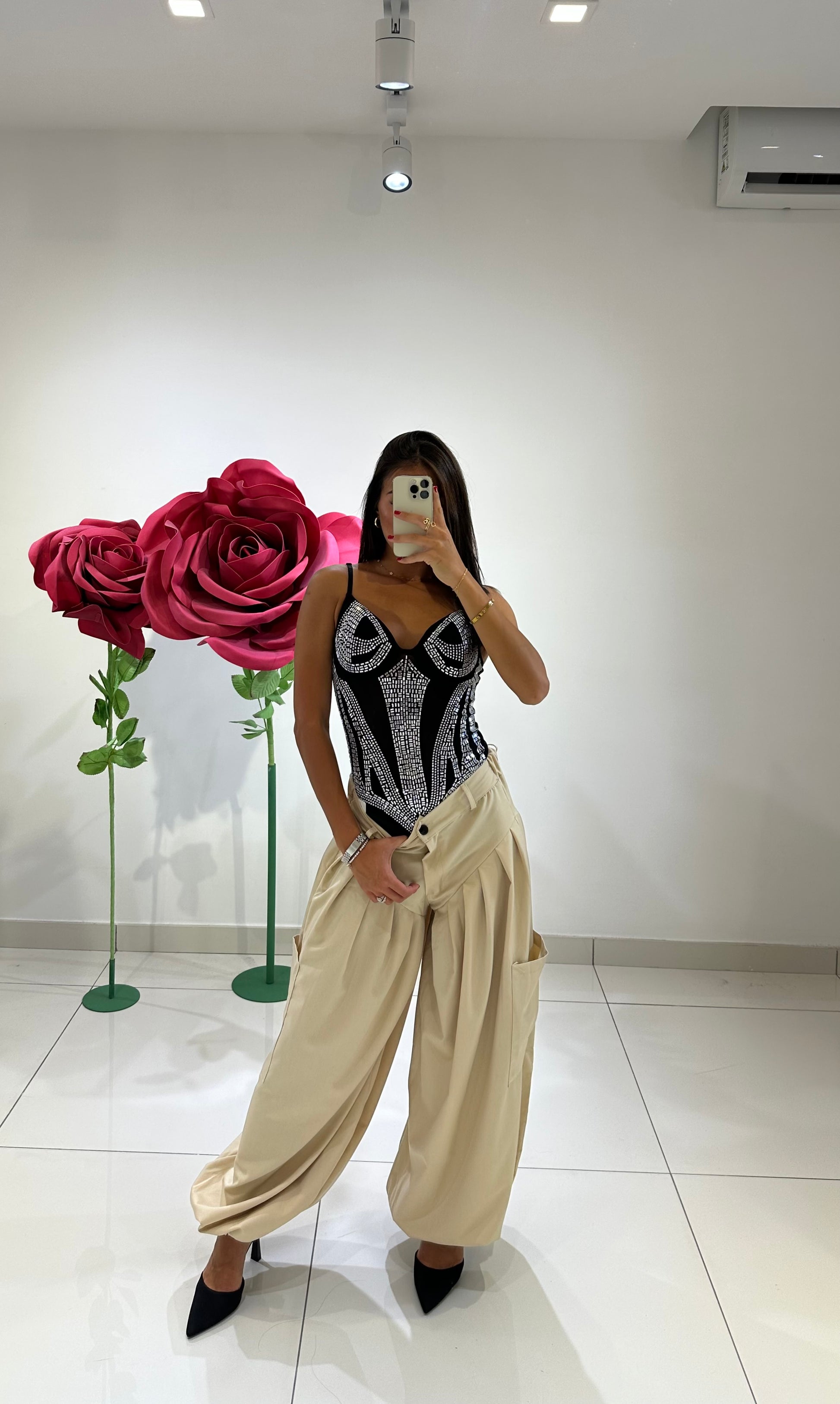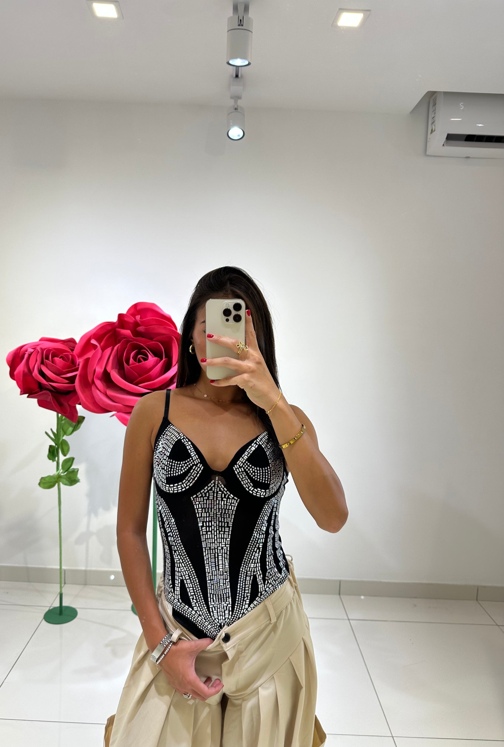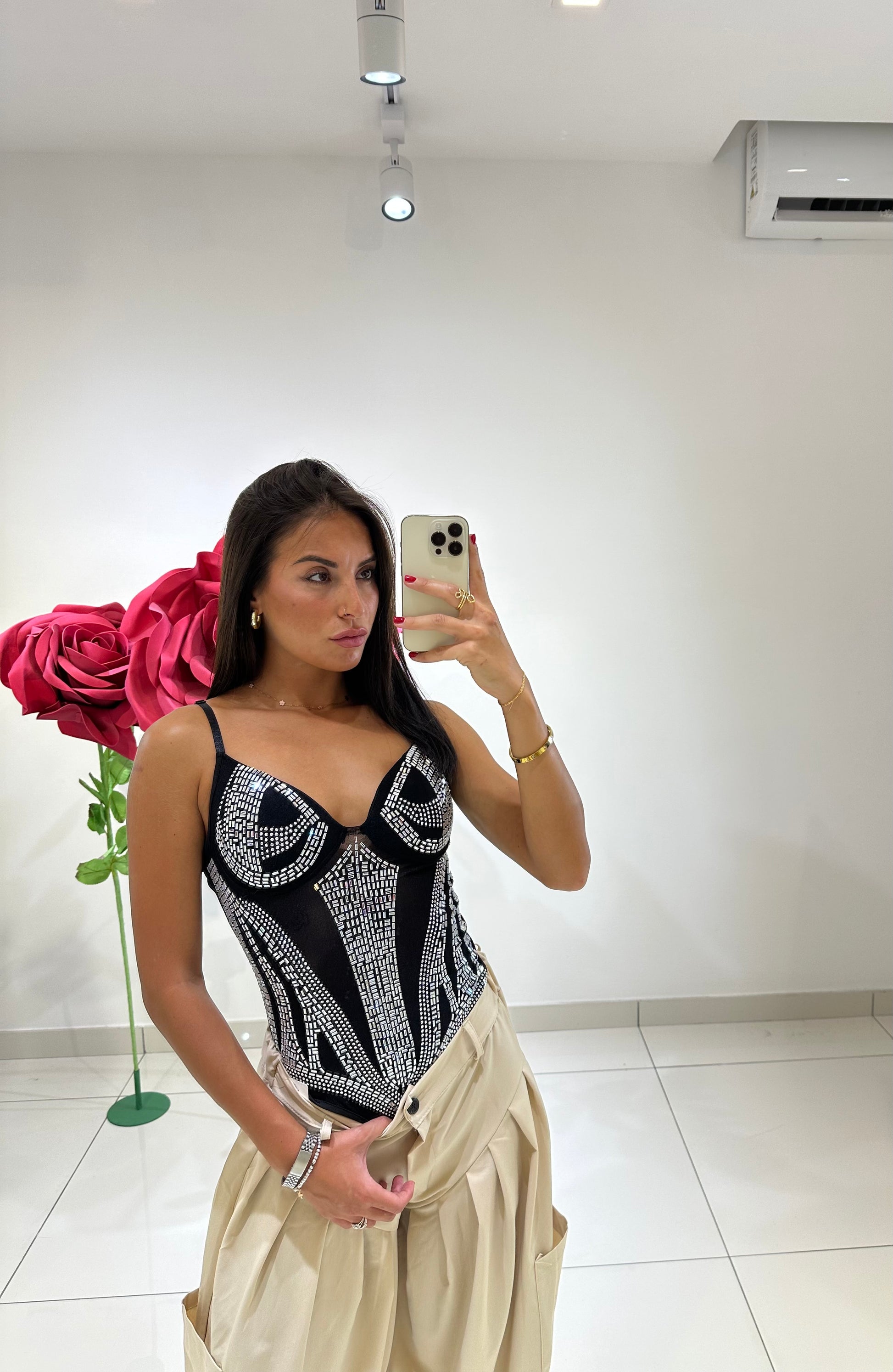BODY IN TULLE IMPREZIOSITO DA STRASS, COPPE PREFORMATE E BRETELLE REGOLABILI