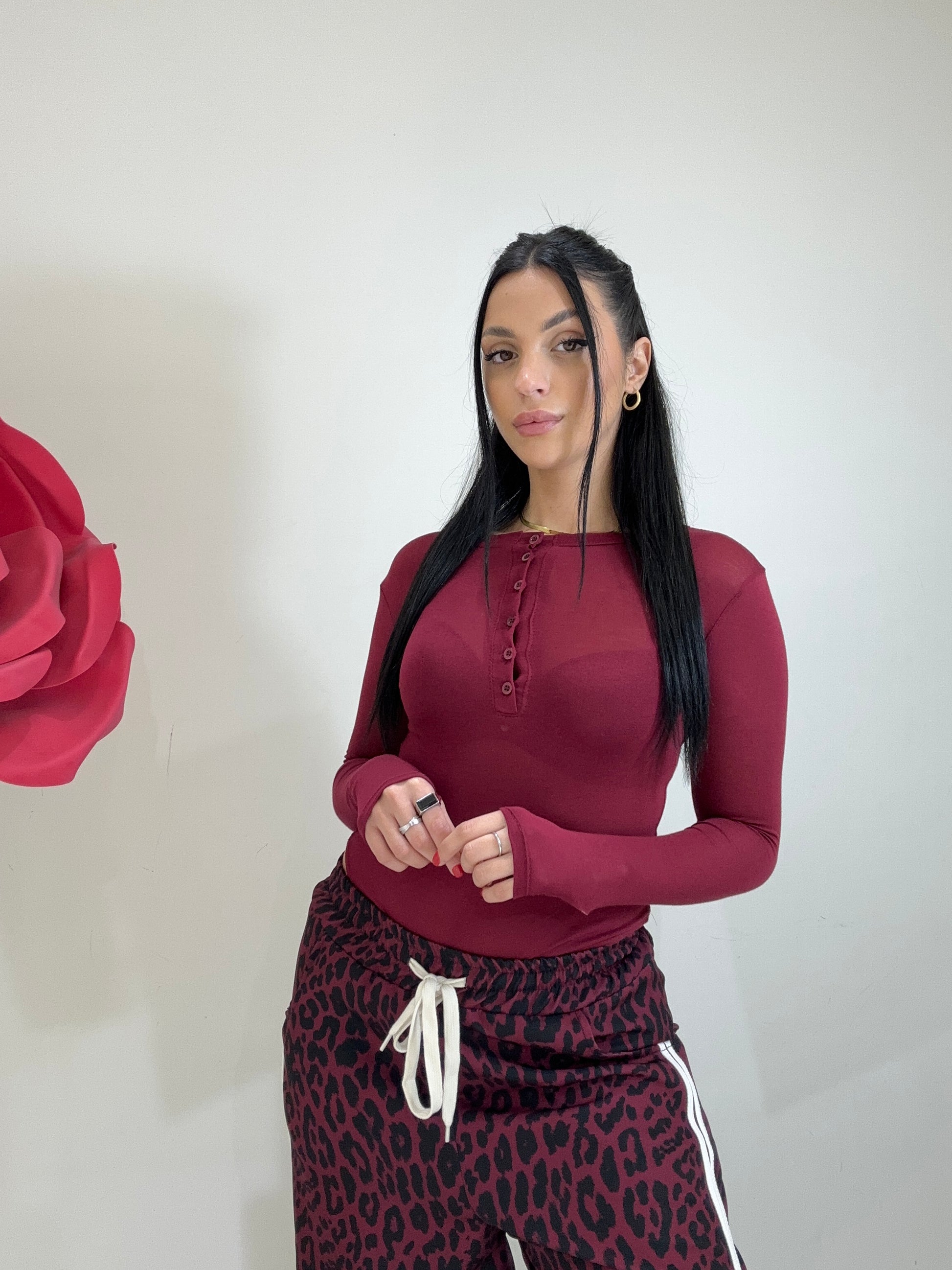 BODY IN COTONE, TESSUTO VEDO NON VEDO DETTAGLIATO DA BOTTONCINI REGOLABILI E MANICA CHE TERMINA A MEZZO GUANTO. IN VARI COLORI.