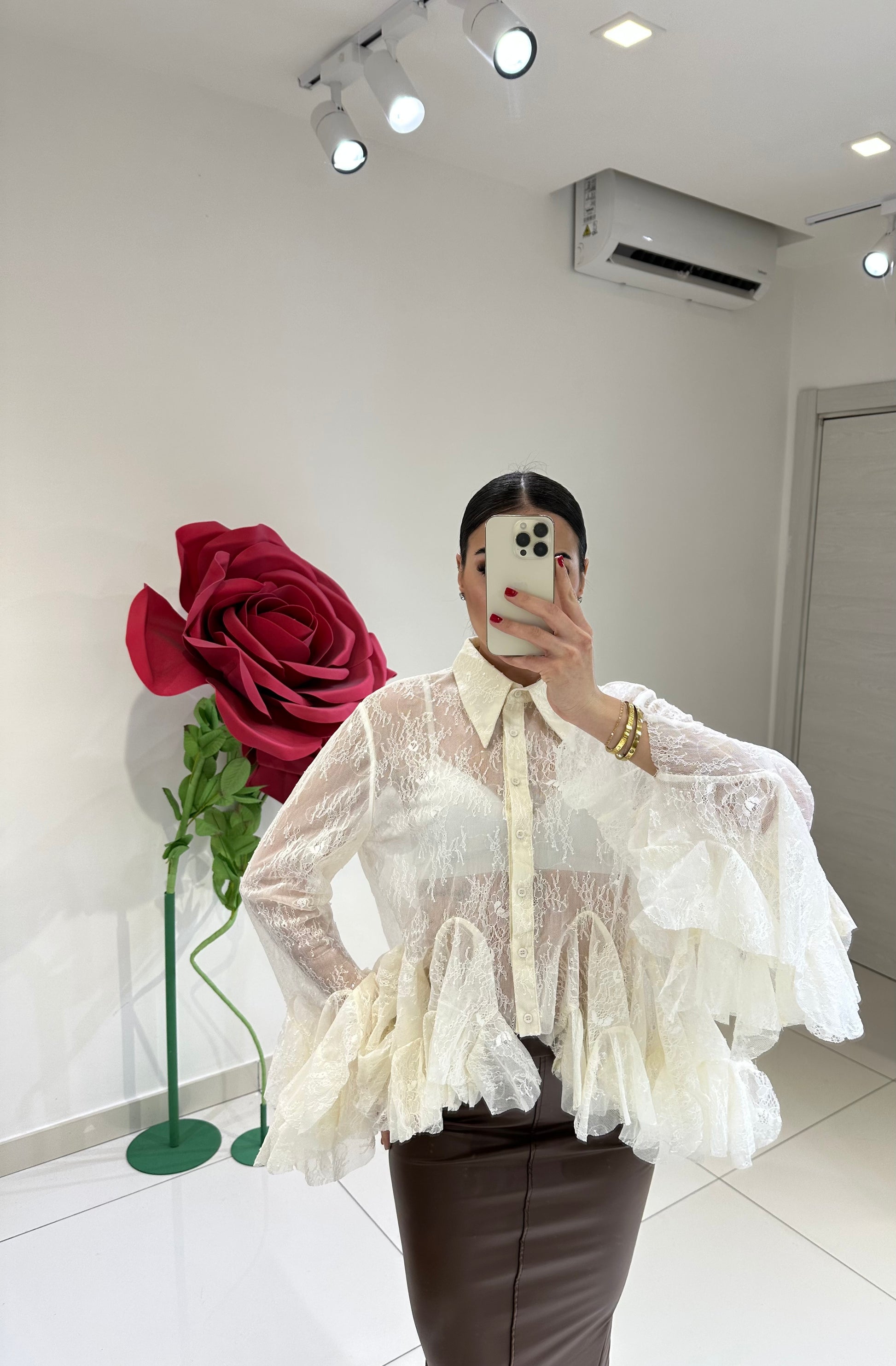 CAMICIA IN TULLE CON RICAMO FIORI IMPREZIOSITO DA PAILLETTES, CON DETTAGLIO VOLANT AL FONDO E ALLA FINE DELLA MANICA LUNGA. MORBIDA VESTIBILITÀ
