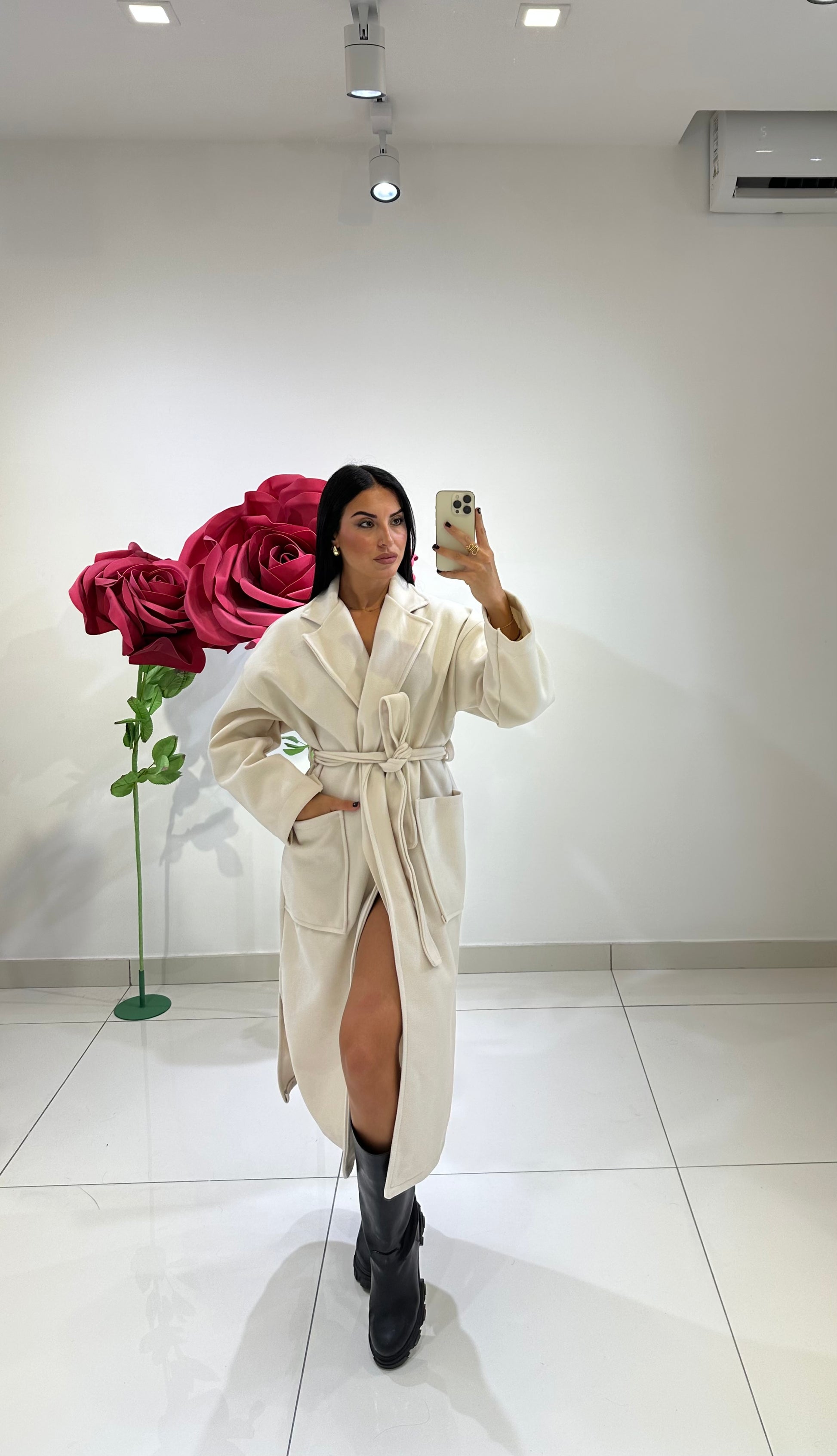 CAPPOTTO CON TASCHE CUCITE ESTERNAMENTE, CINTURA INCLUSA COME CHIUSURA. IN VARI COLORI