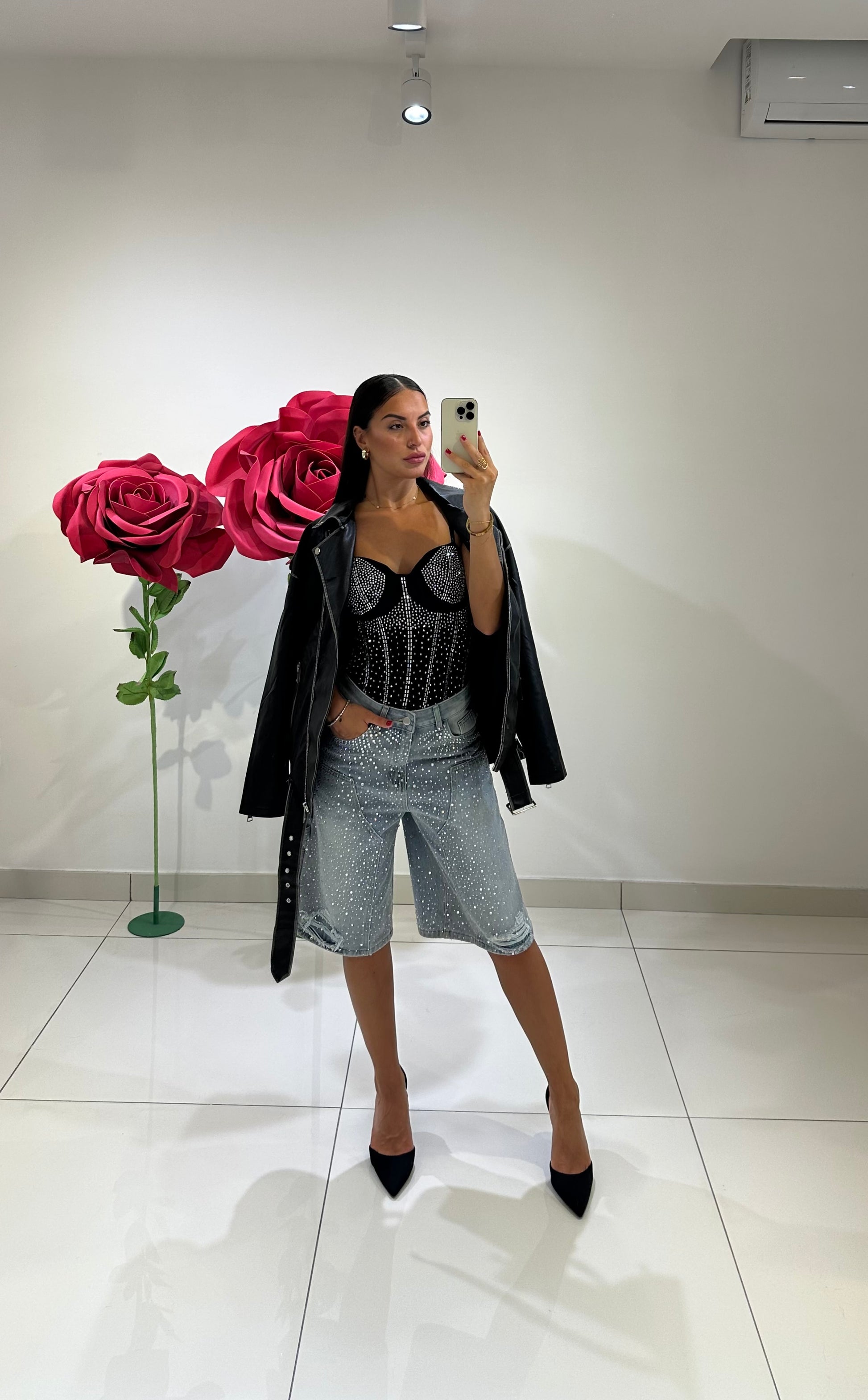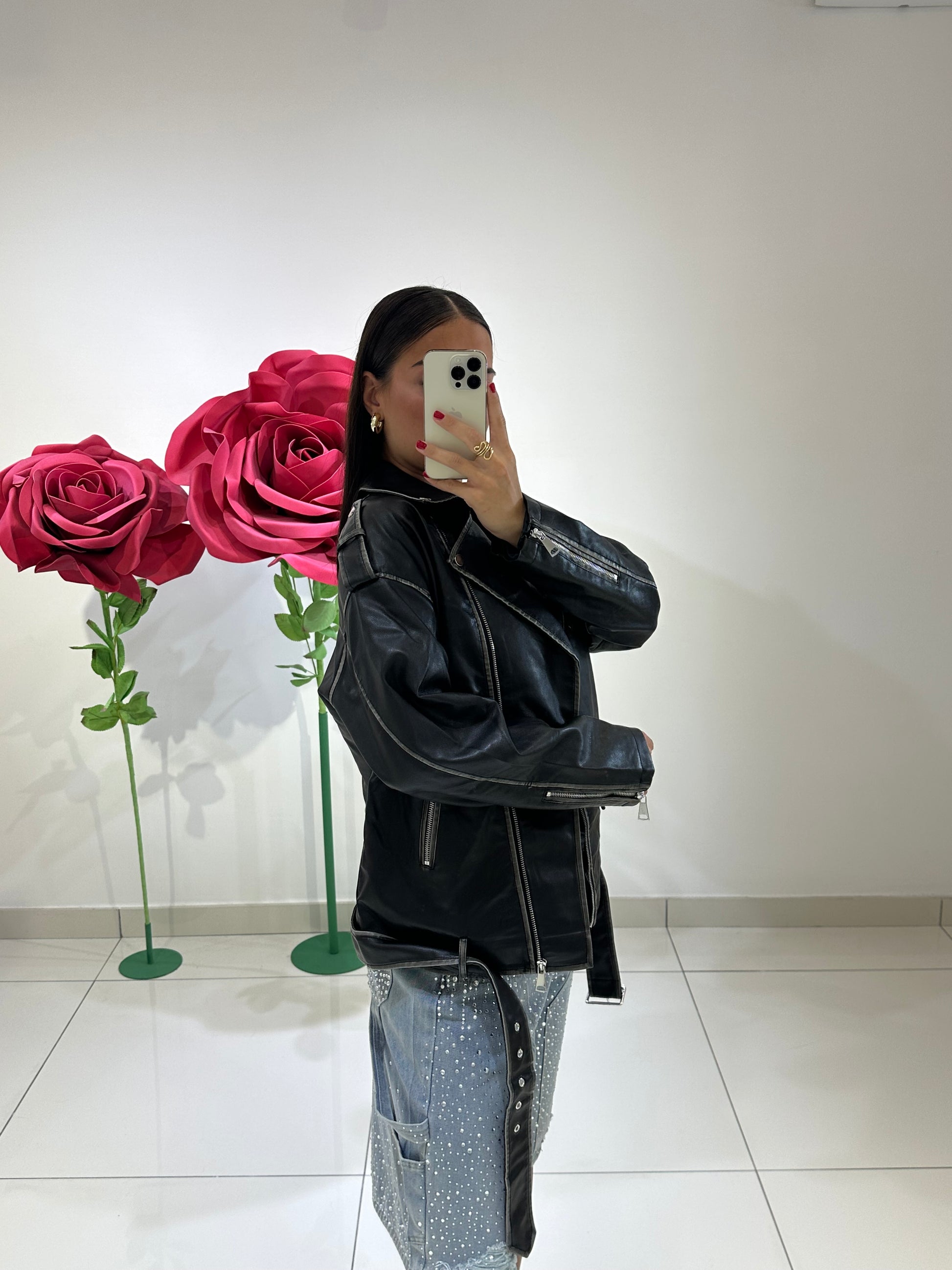 CHIODO IN ECOPELLE, VESTIBILITÀ OVER, FODERATO ALL‘INTERNO, CINTURA INCLUSA