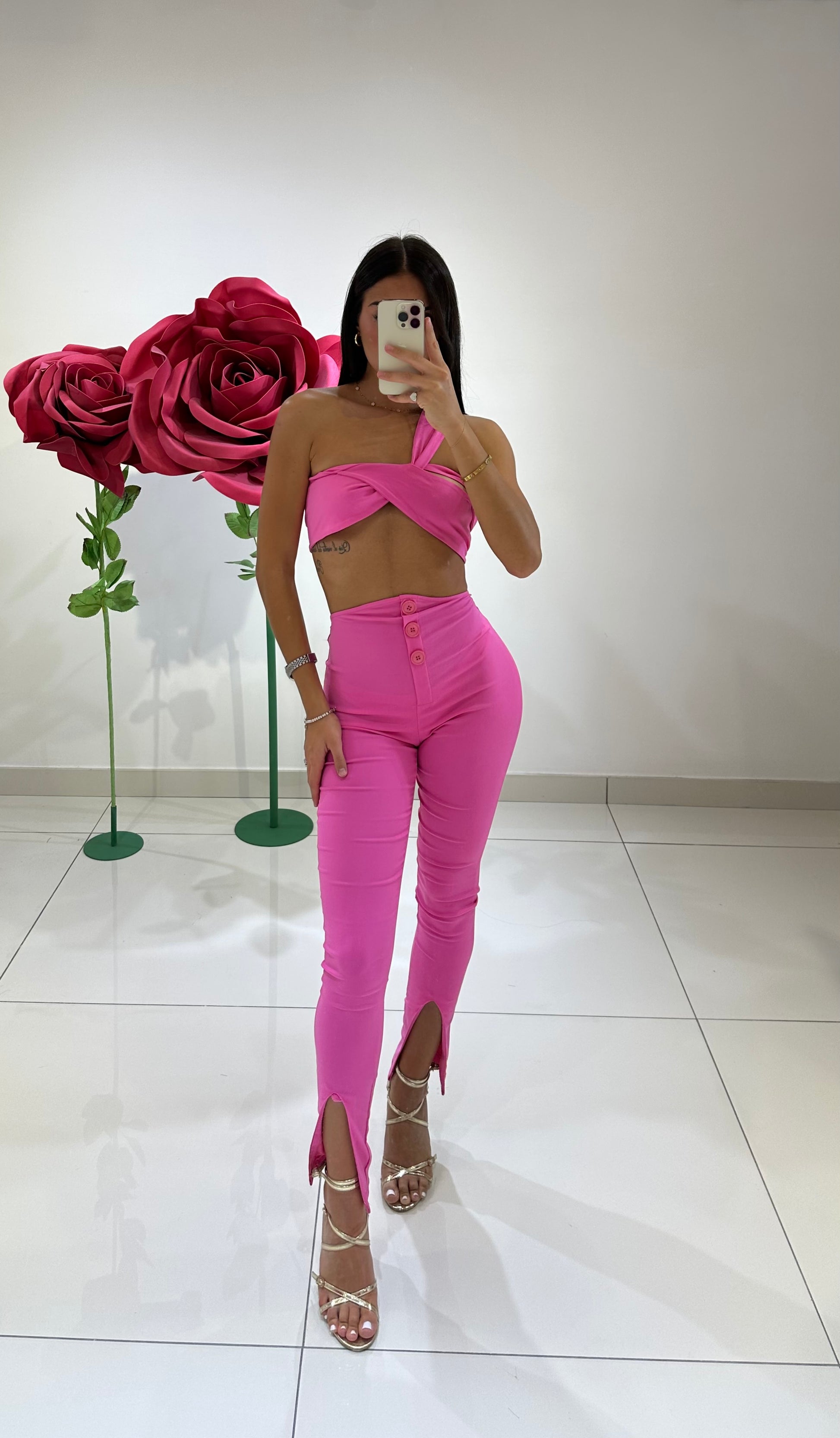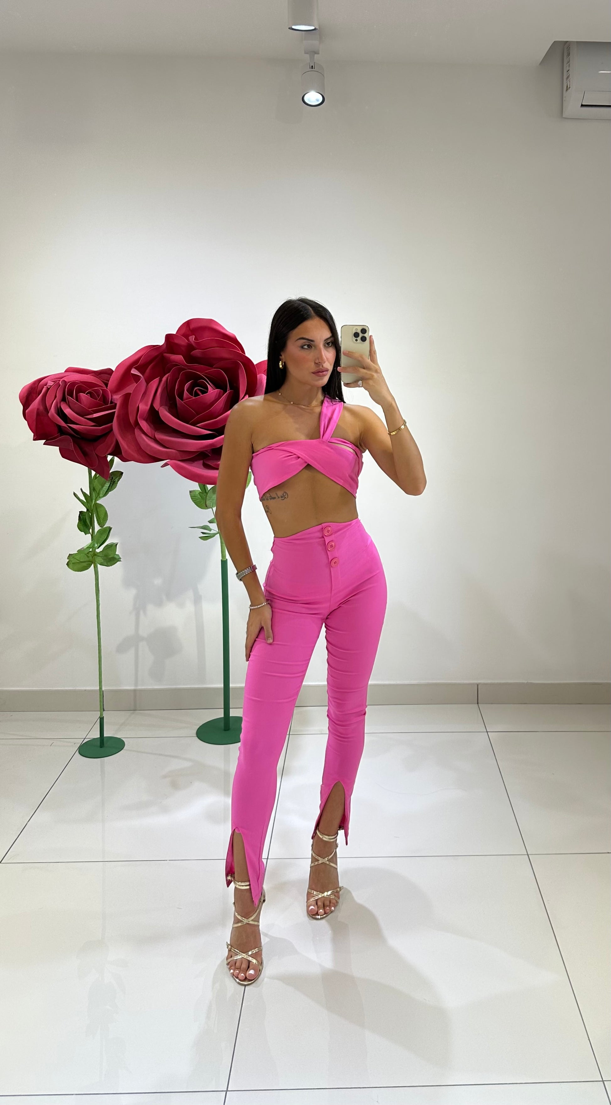 COORDSET CON TOP MONOSPALLA, PANTALONE A SIGARETTA, VITA ALTA E SPACCHI SULLE CAVIGLIE, VA A TAGLIE