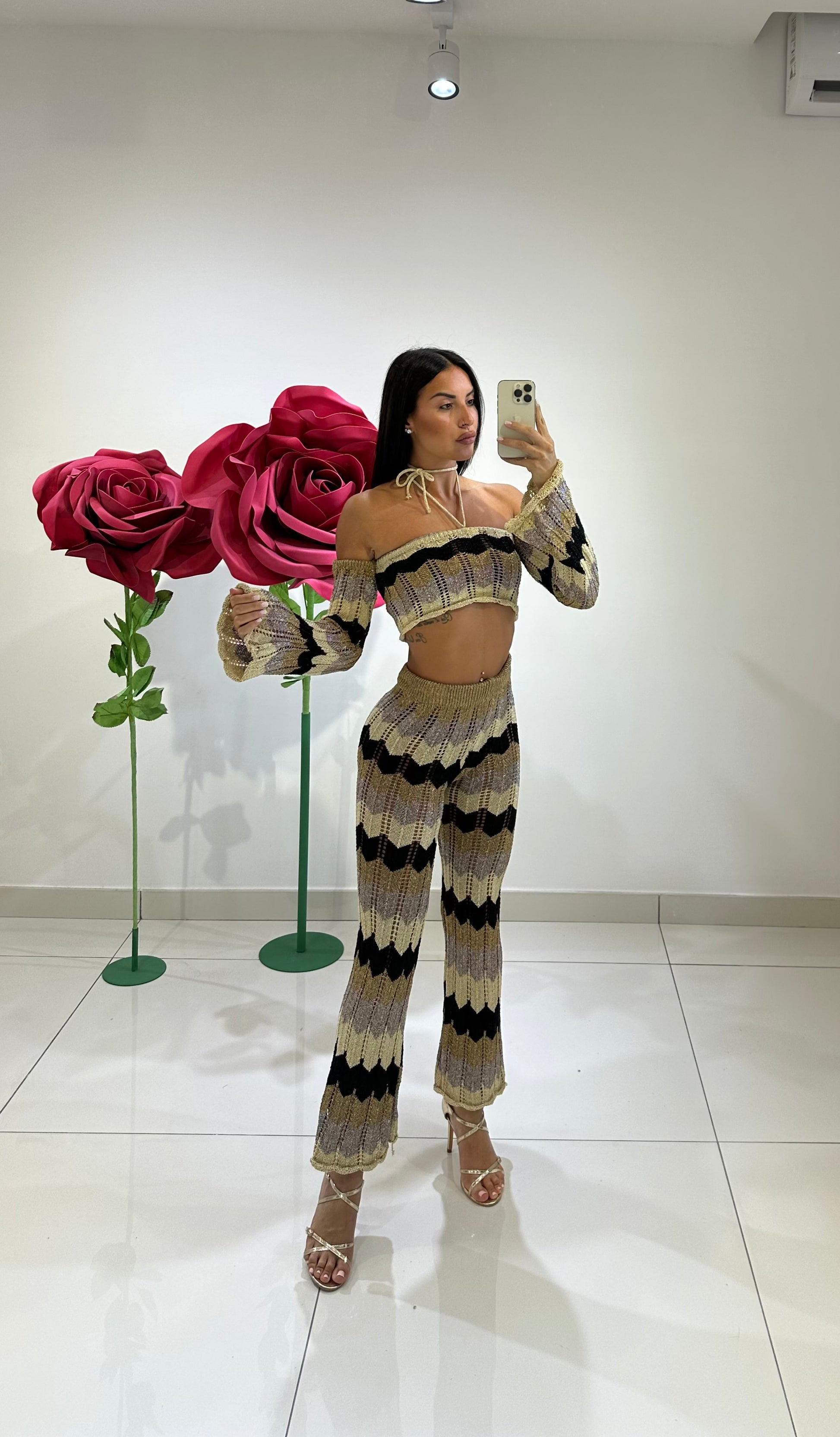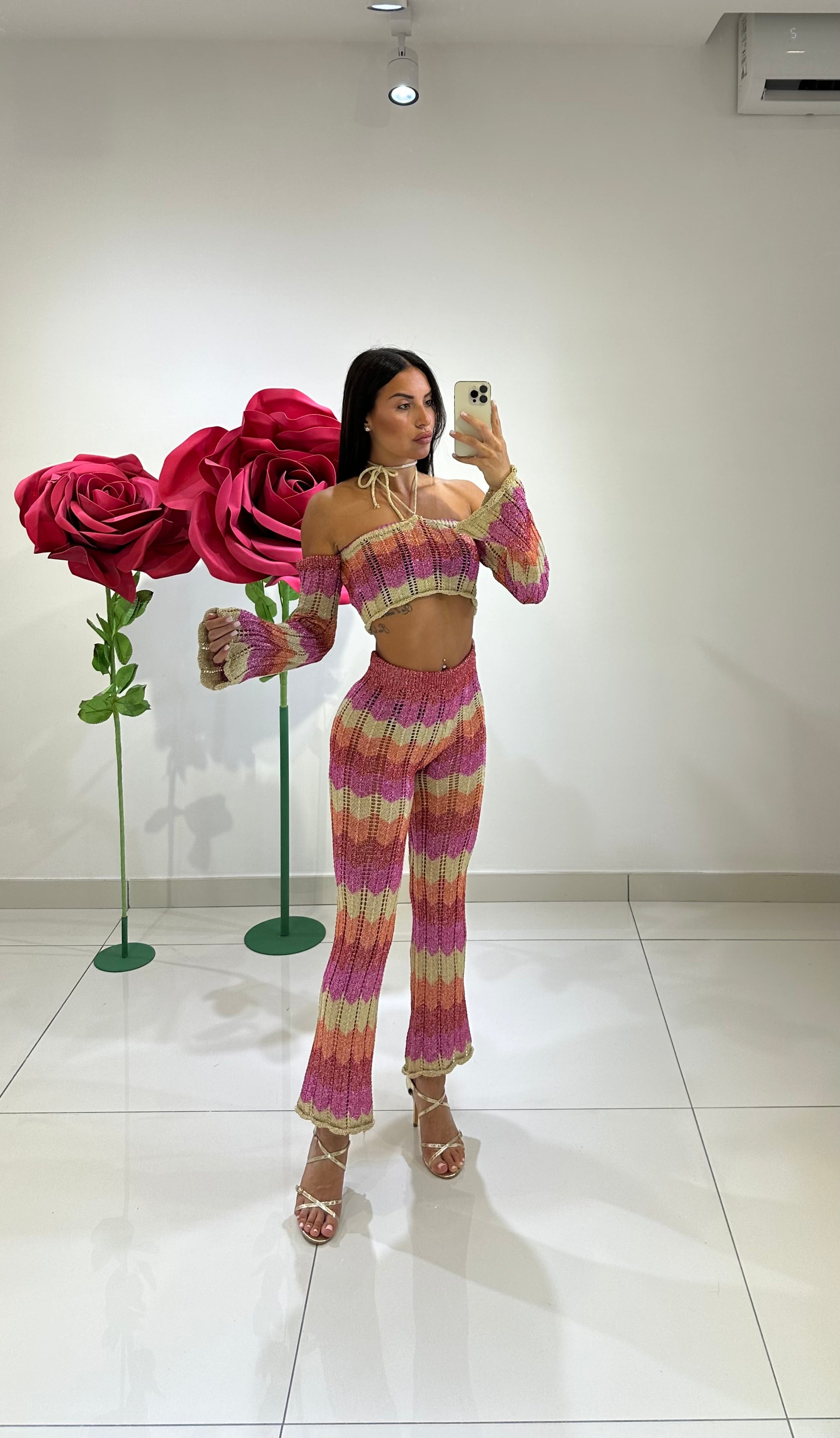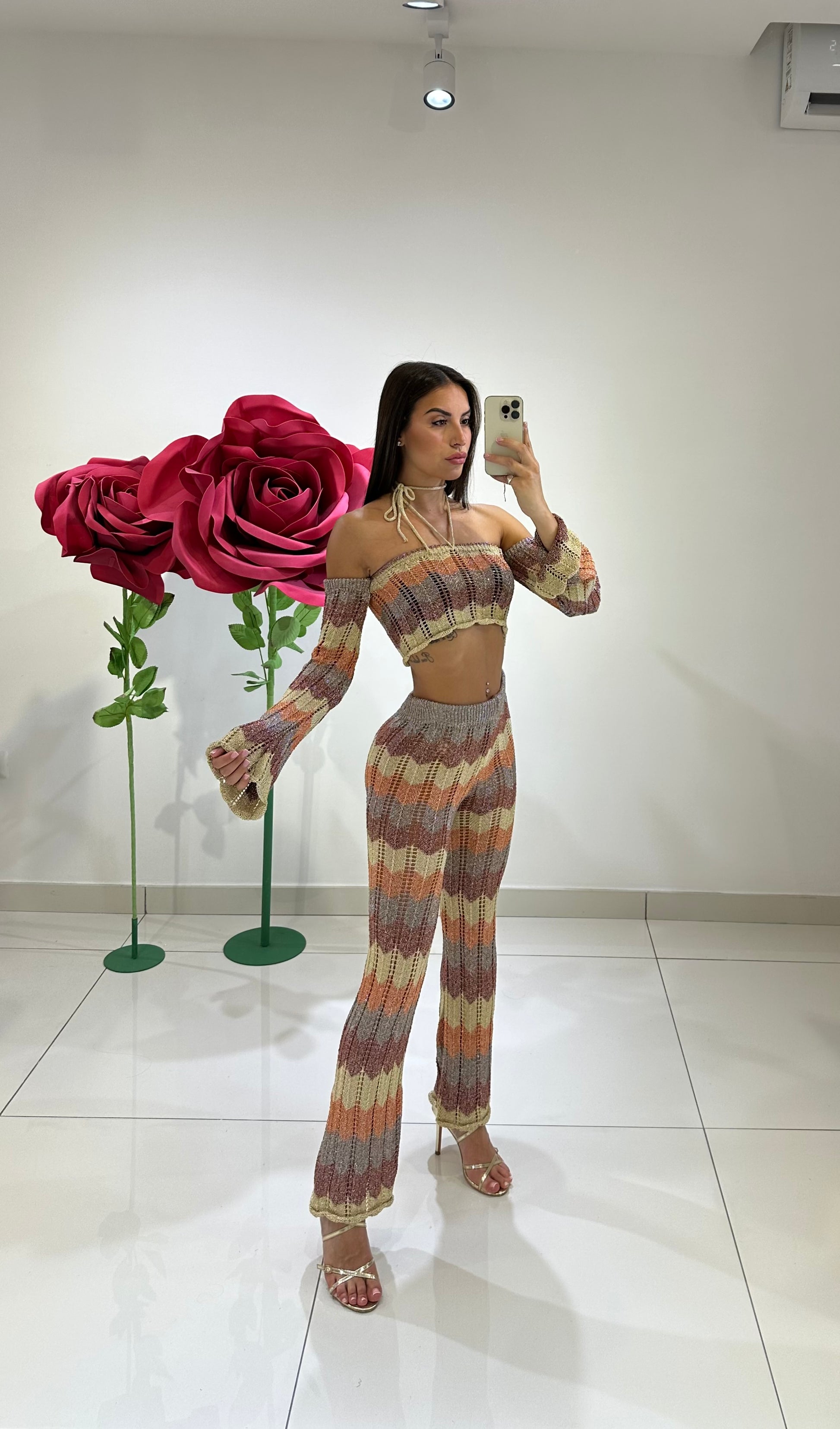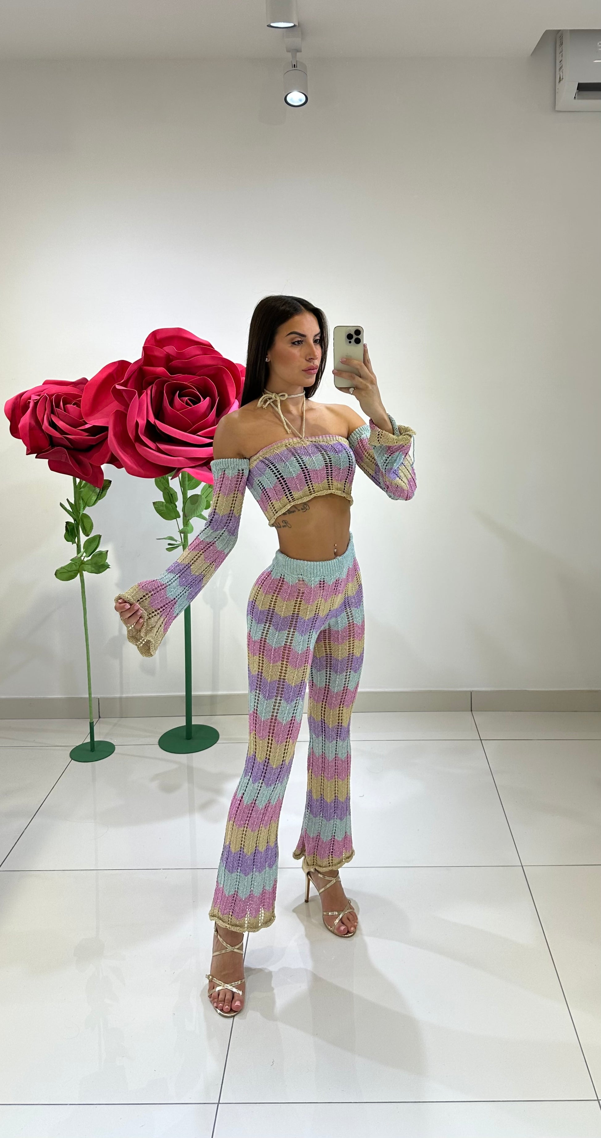 COORDSET TRAFORATO IN LUREX MULTICOLOR, TOP MANICA LUNGA SPEZZATA E PANTALONE A ZAMPA VITA ALTA, IN VARI COLORI