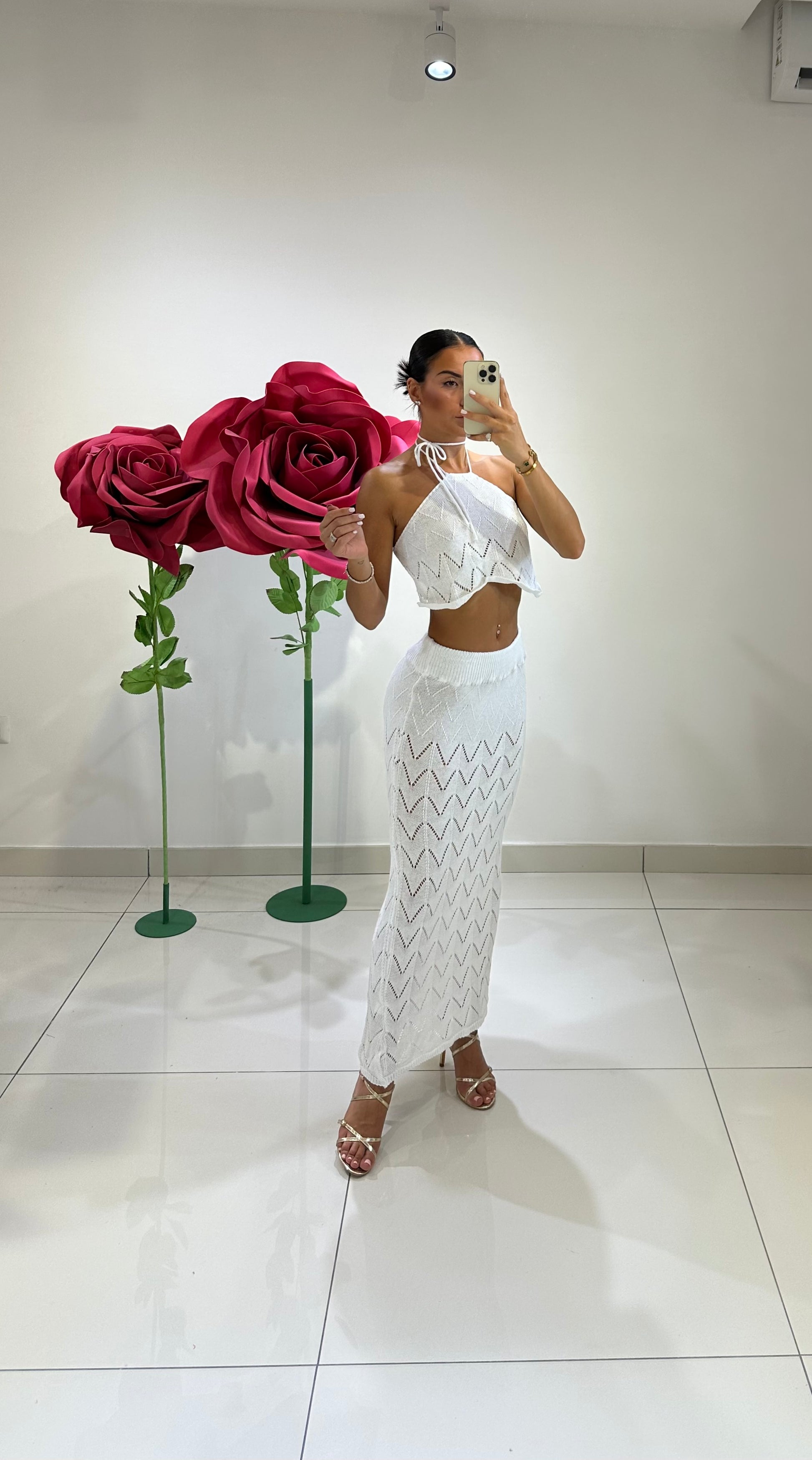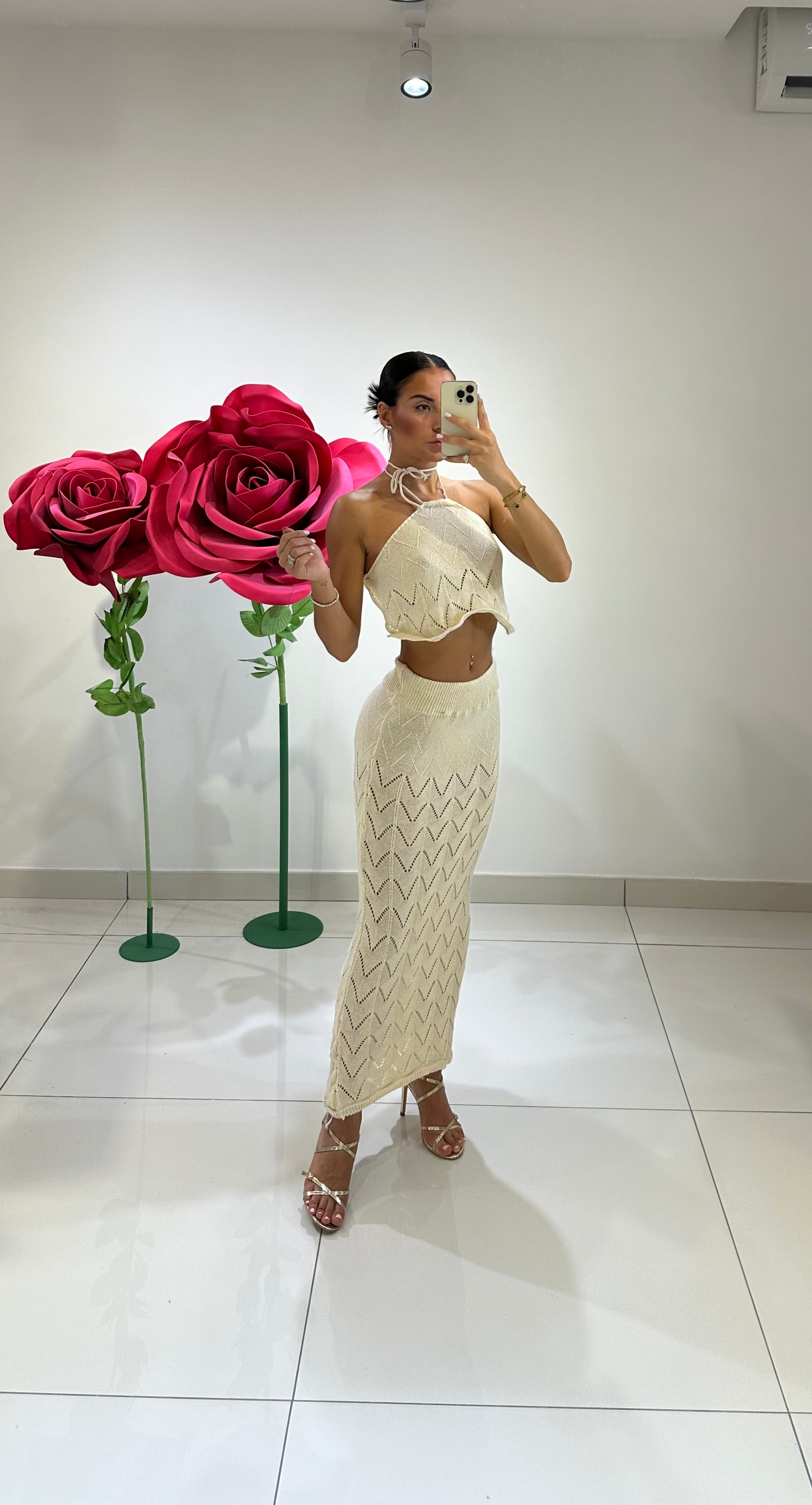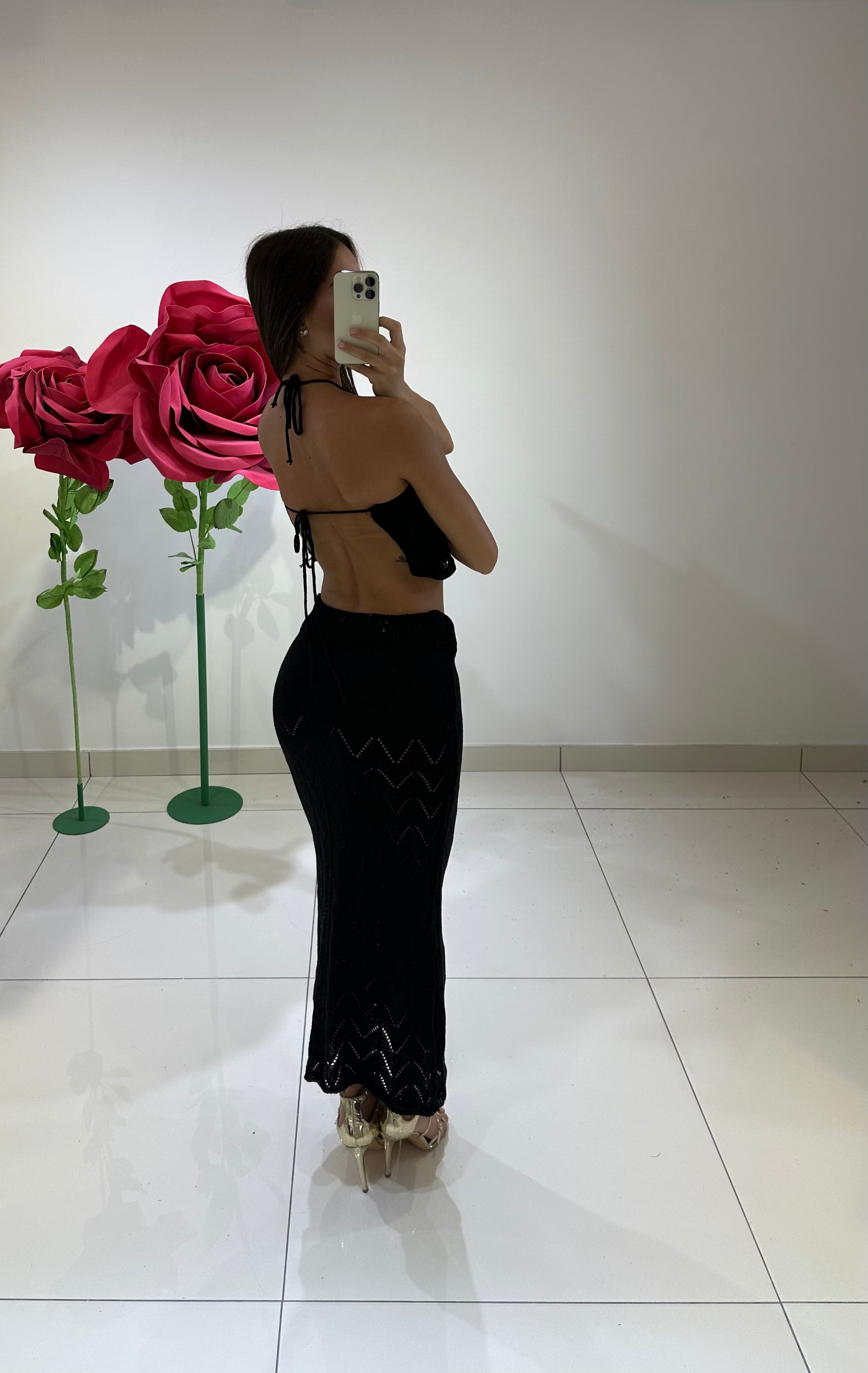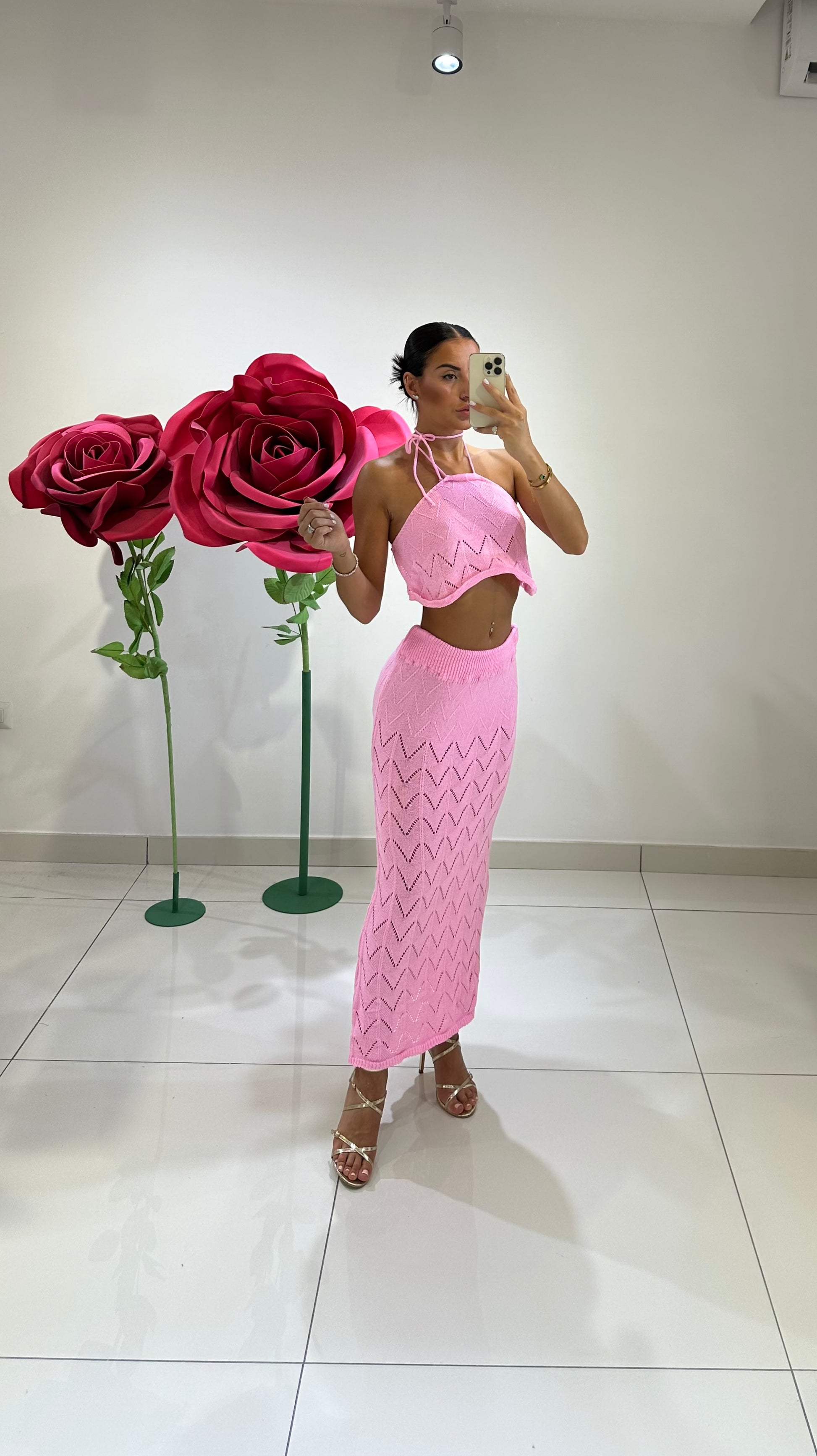 COORDSET IN MAGLIA TUTTA TRAFORATA, TOP SCOLLO ALL’AMERICANA CON SCHIENA SCOPERTA, GONNA LUNGA VITA ALTA CON ELASTICO, IN VARI COLORI