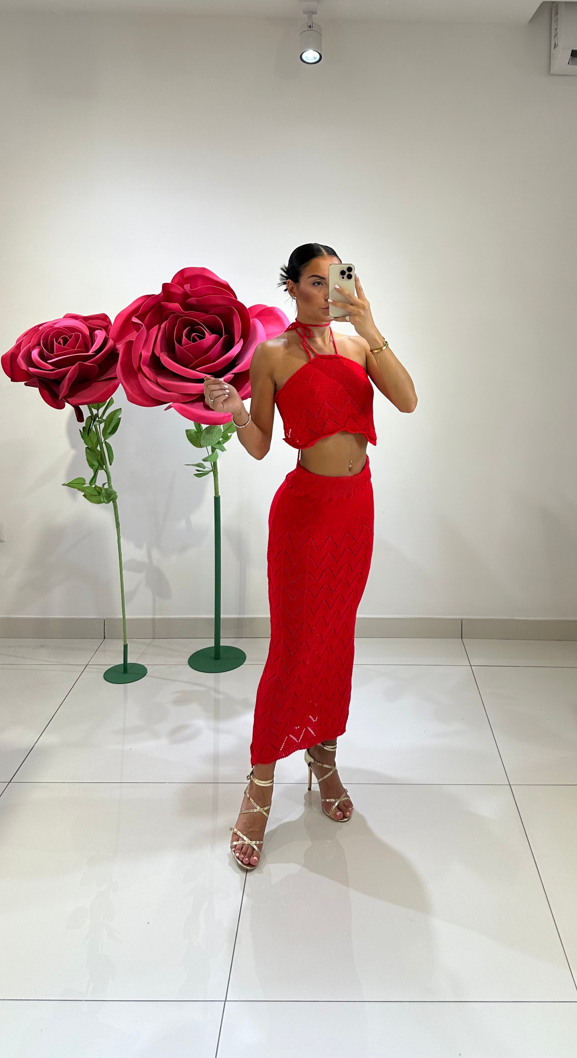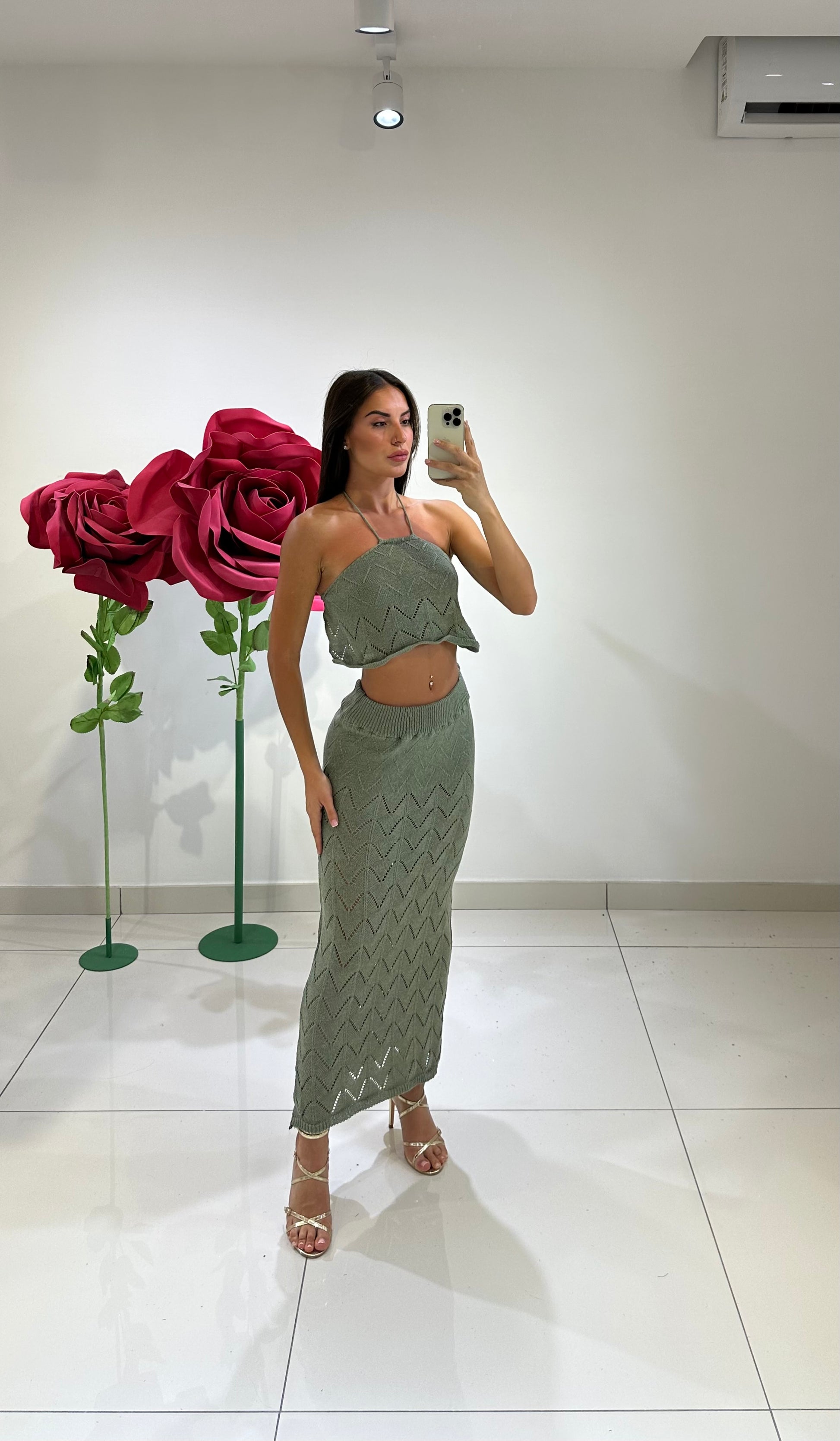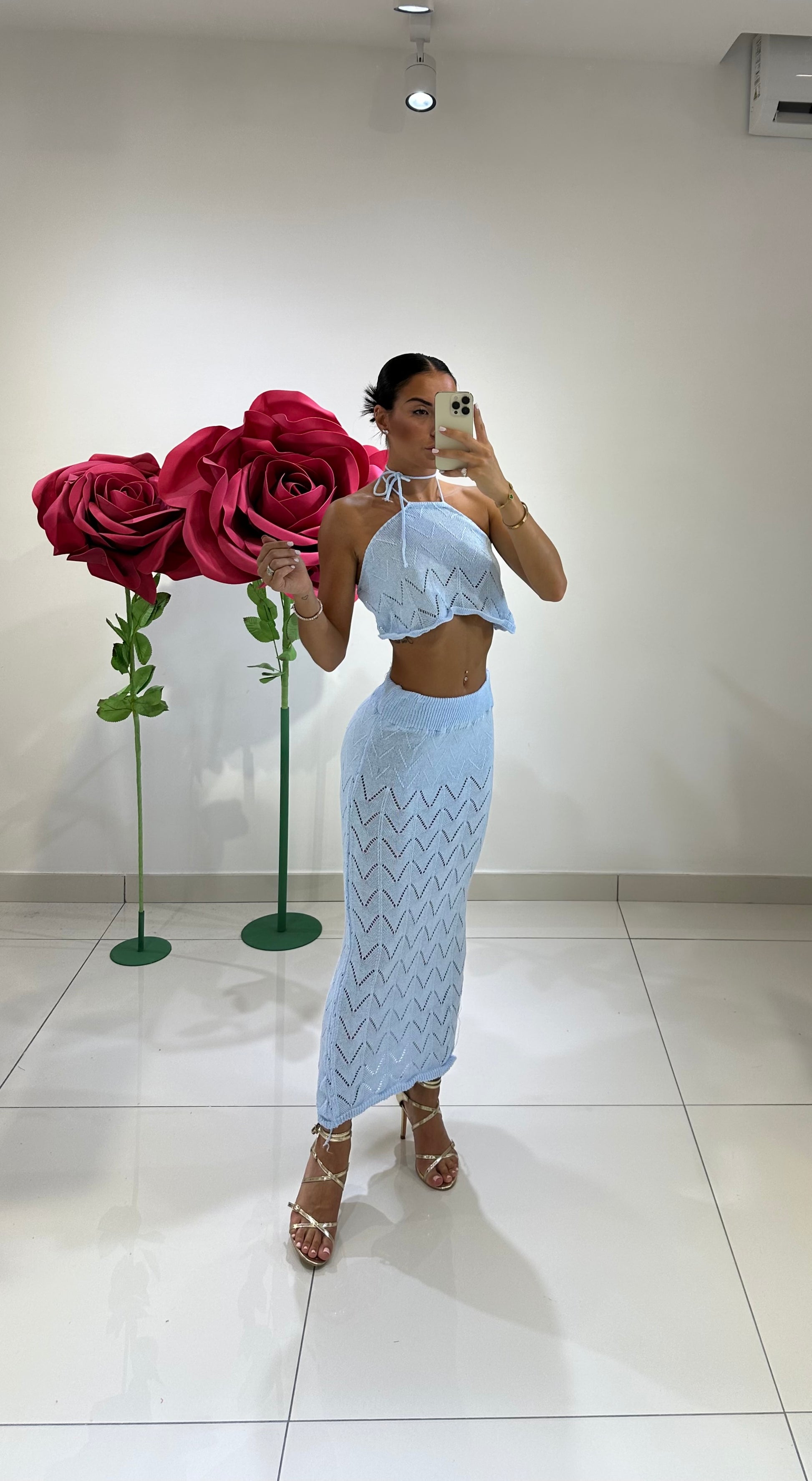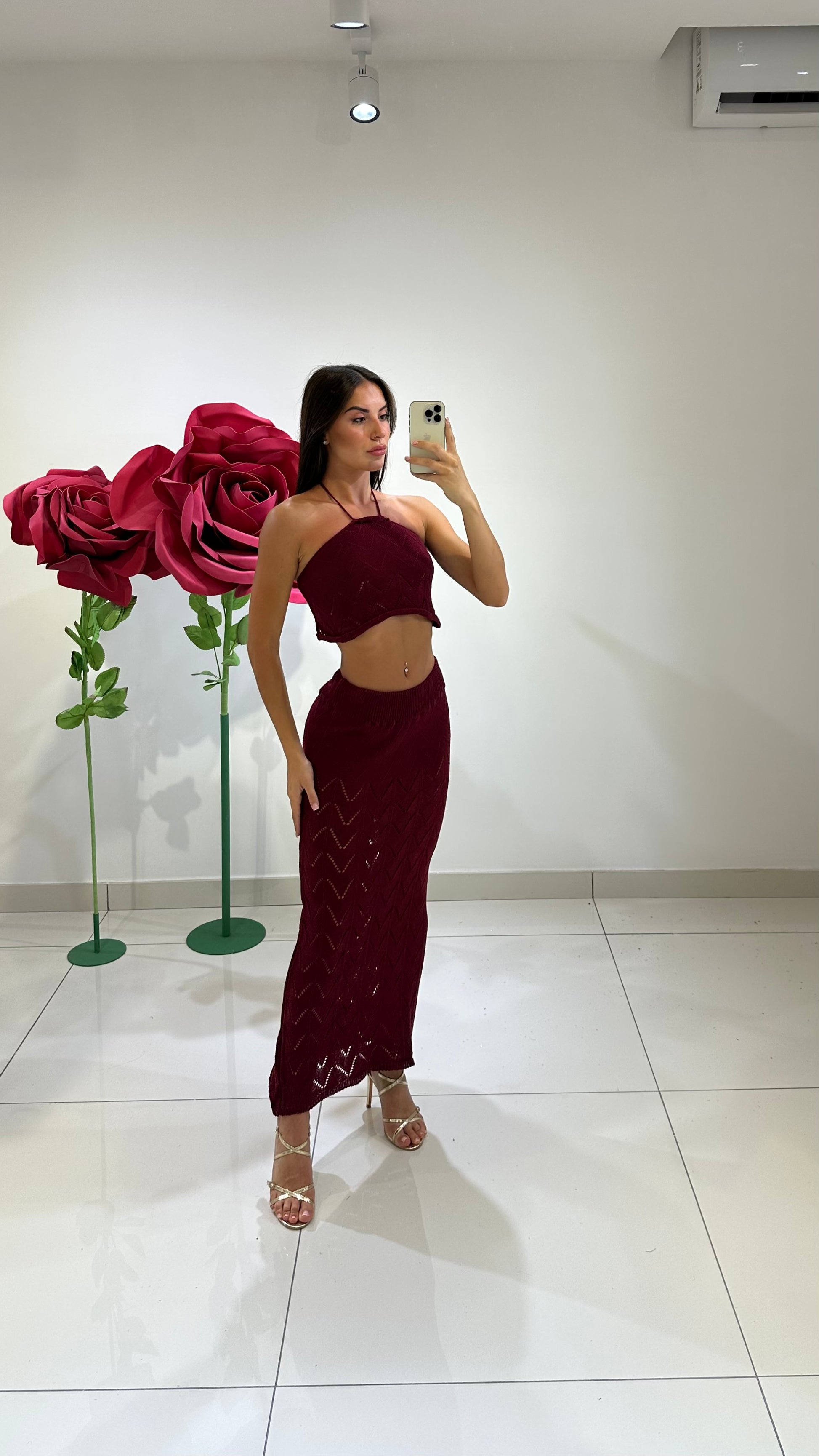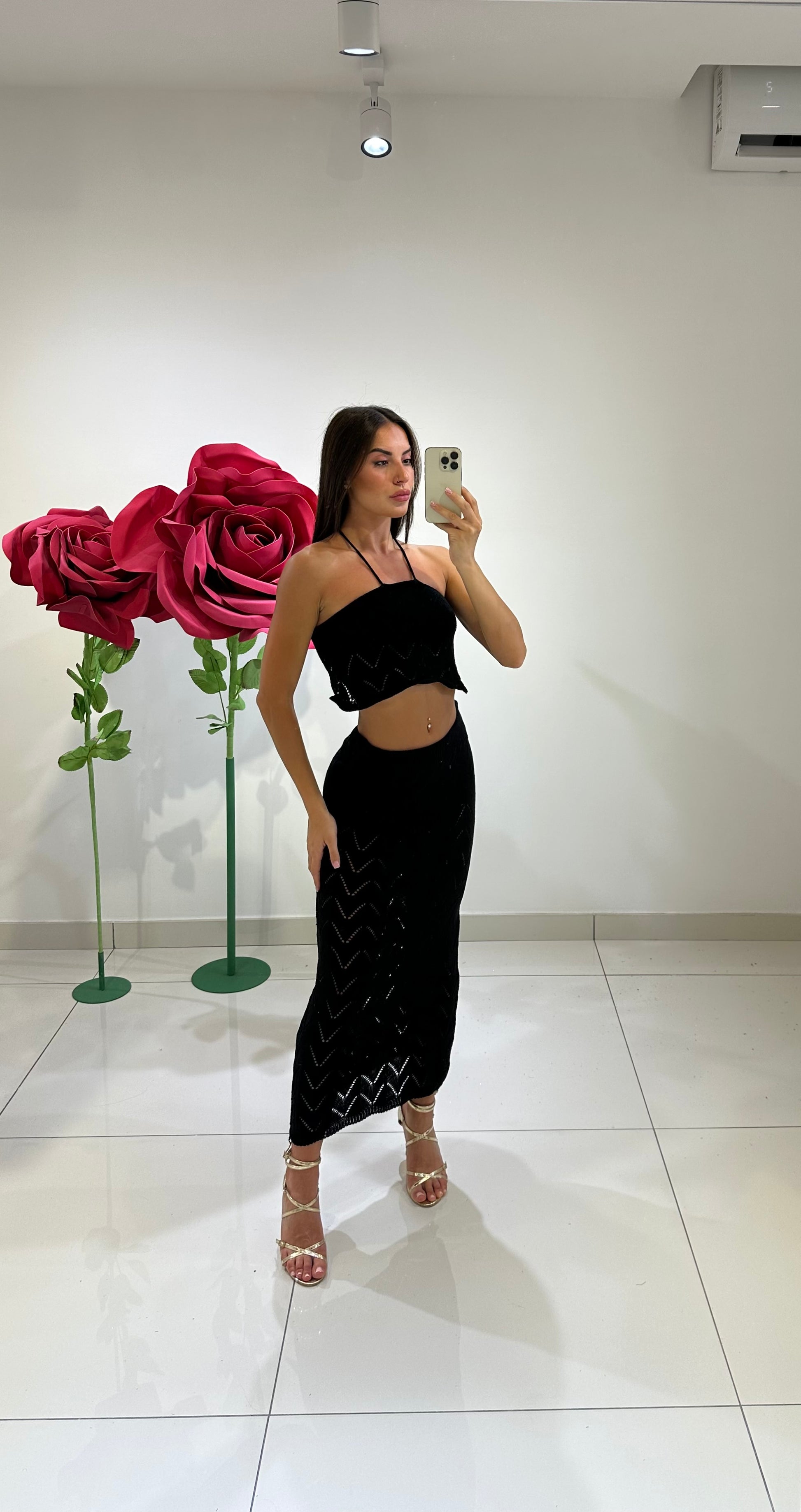 COORDSET IN MAGLIA TUTTA TRAFORATA, TOP SCOLLO ALL’AMERICANA CON SCHIENA SCOPERTA, GONNA LUNGA VITA ALTA CON ELASTICO, IN VARI COLORI