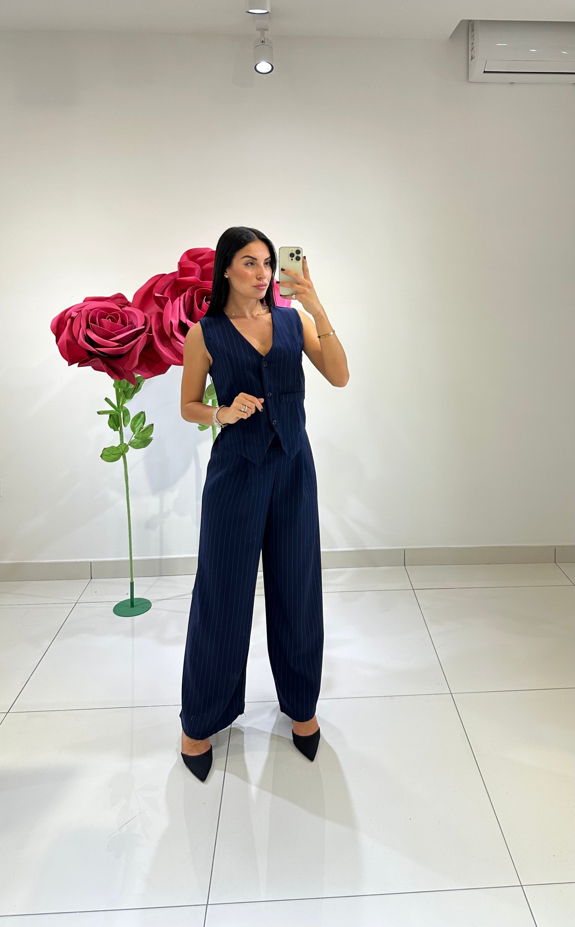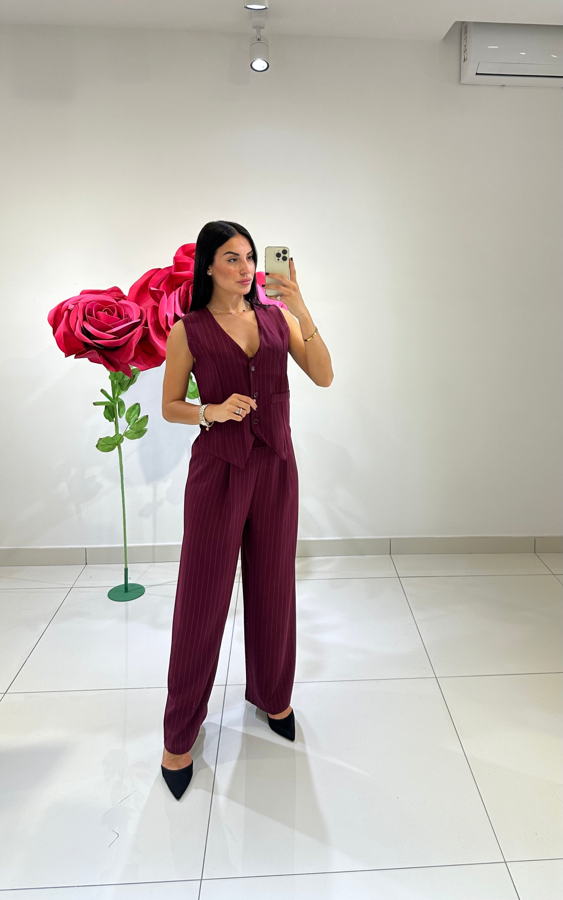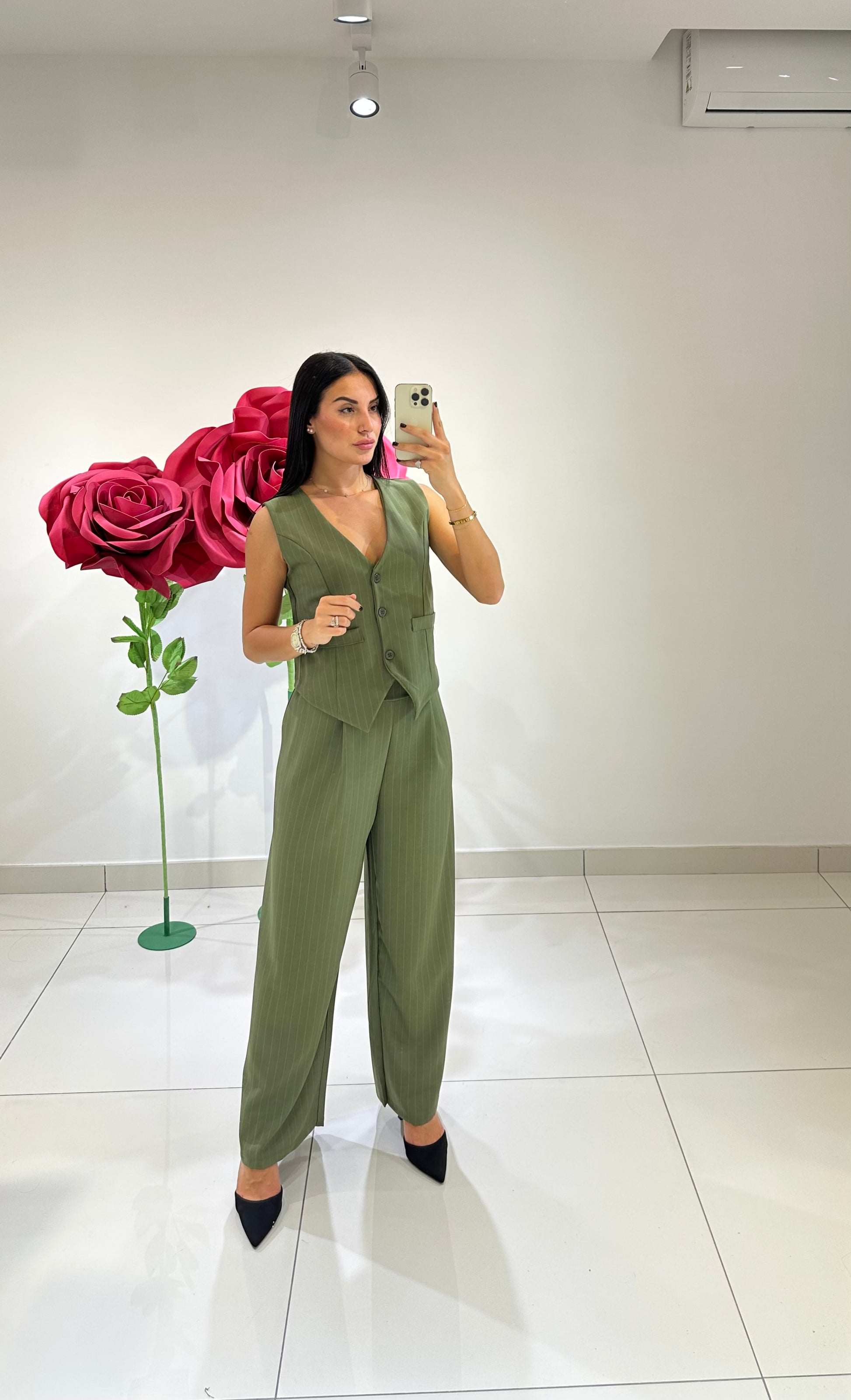 COORDSET GESSATO COMPOSTO DA GILLET CON TASCHE FINTE SUI LATI, PANTALONE GAMBA DRITTA, VITA ALTA CON ELASTICO SUL RETRO. IN VARI COLORI