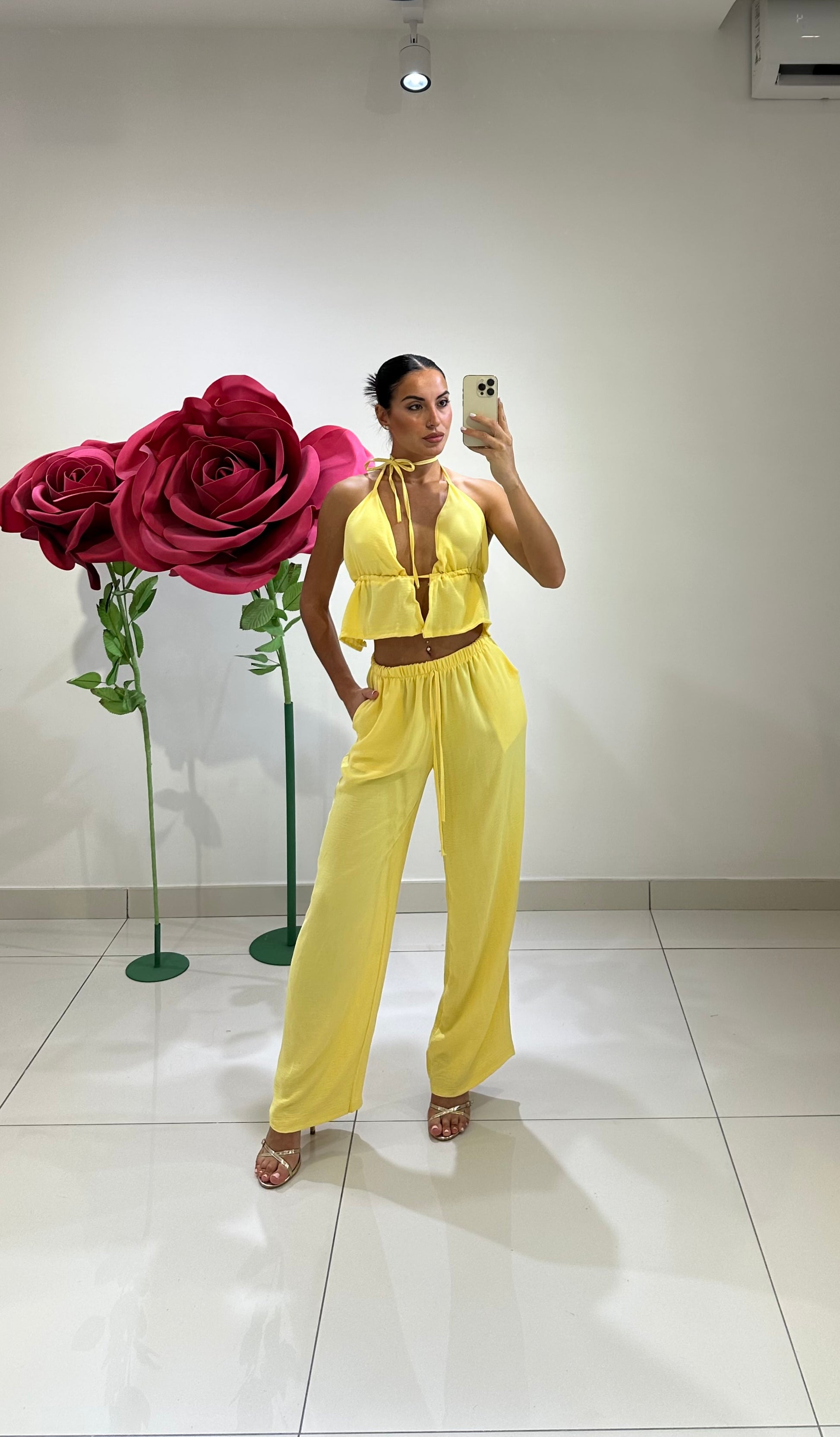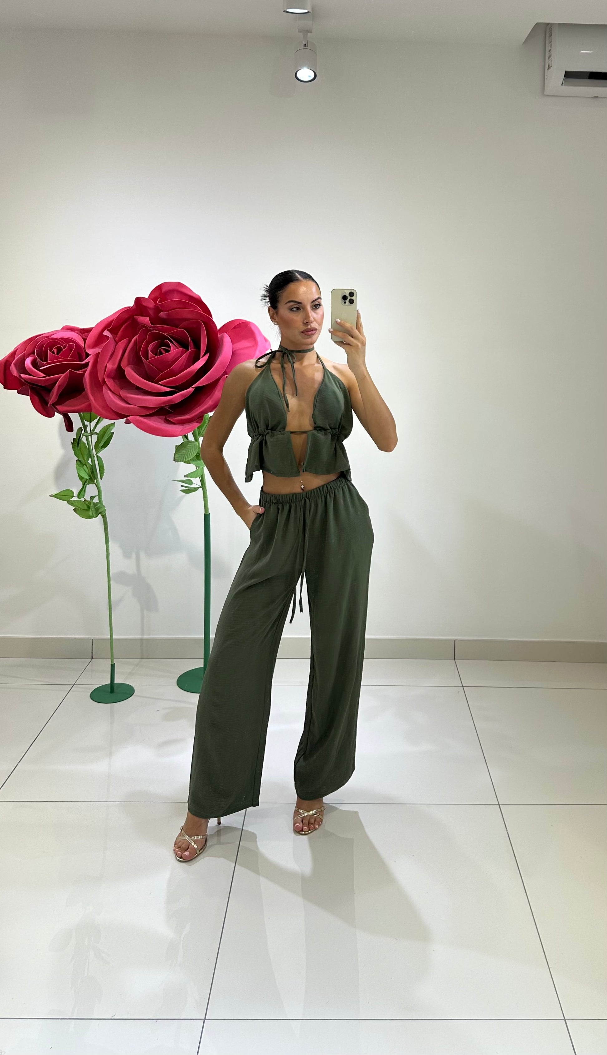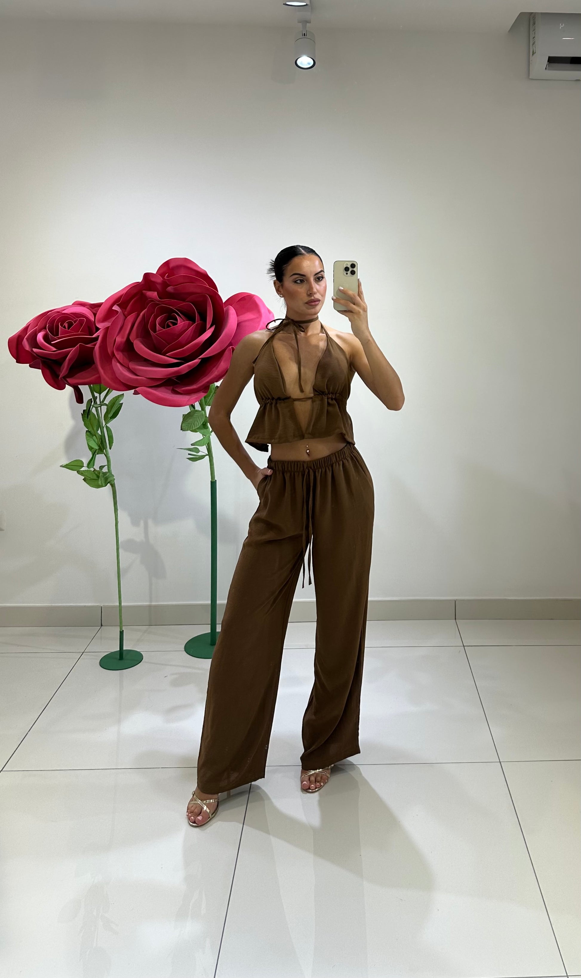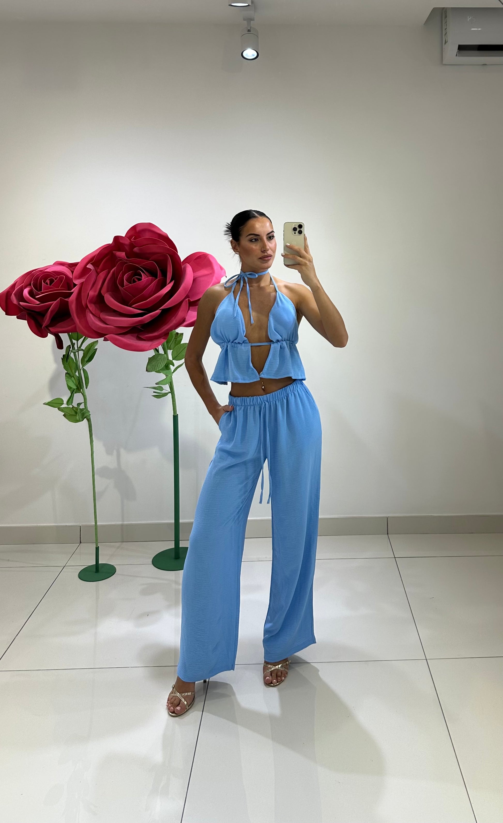 COORDSET CON TOP APERTURA REGOLABILE AVANTI CON COPPE E SCHIENA SCOPERTA, PANTALONE PALAZZO VITA ALTA CON ELASTICO. IN VARI COLORI