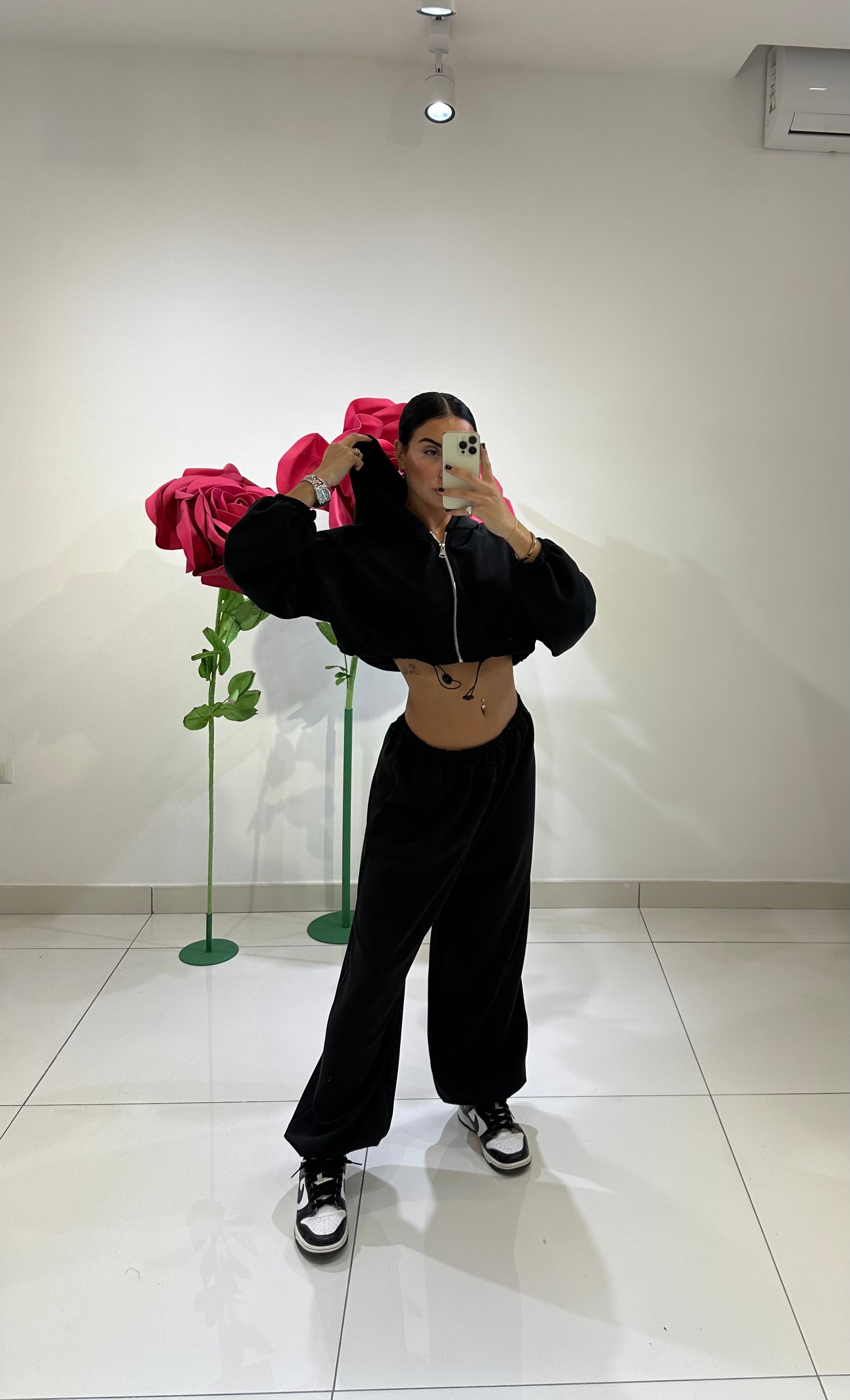 COORDSET DI TUTA CON FELPA CROP CON CAPPUCCIO E CULISSE REGOLABILE SUI FIANCHI. PANTA TUTA OVER. IN VARI COLORI