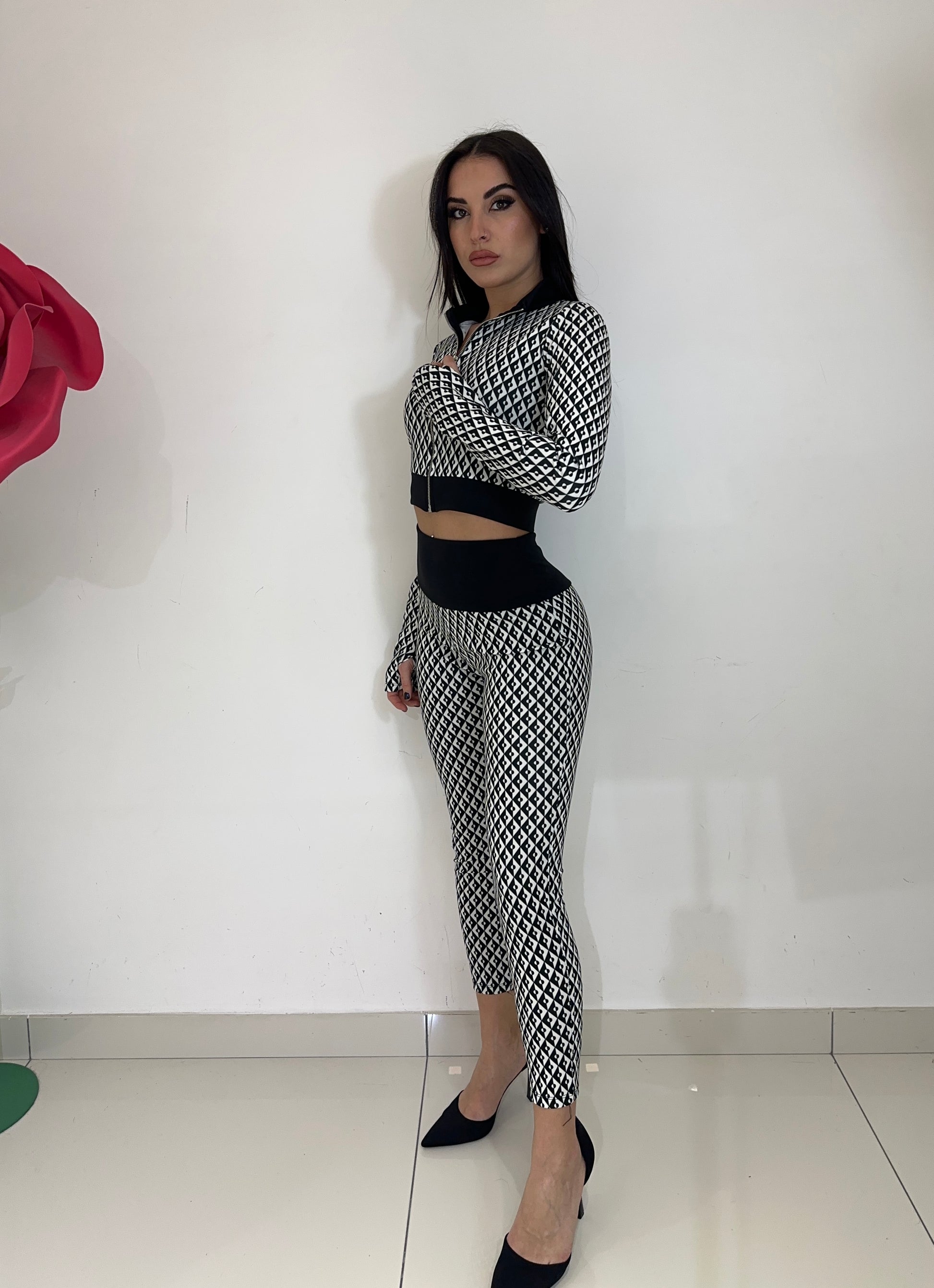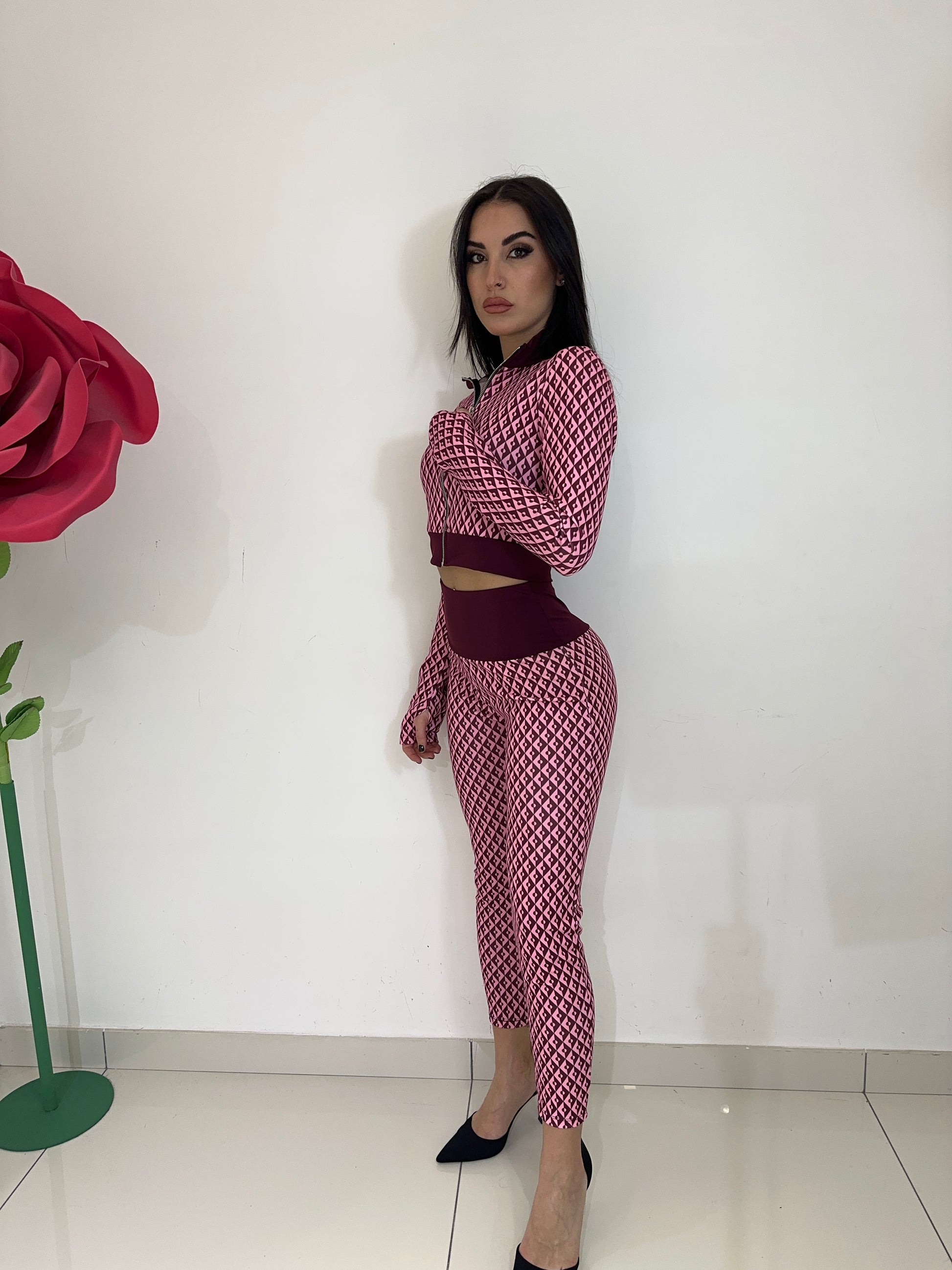 COORDSET DAL TESSUTO ELASTICO COMPOSTO DA MAGLIA CROP CON MANICA LUNGA A GUANTO E LEGGINS VITA ALTA CON FASCIA ALTA IN CONTRASTO DI COLORE. IN VARI COLORI