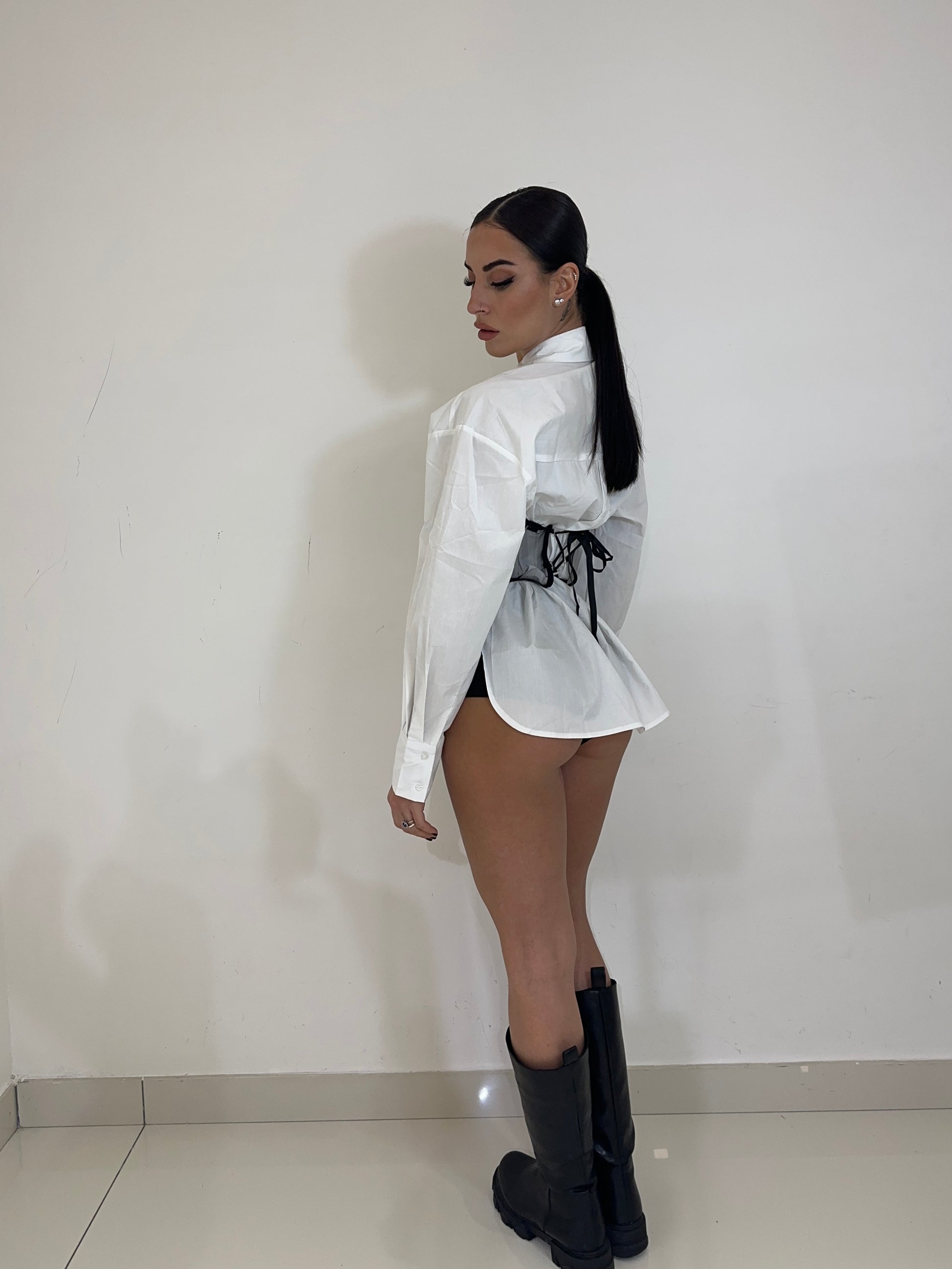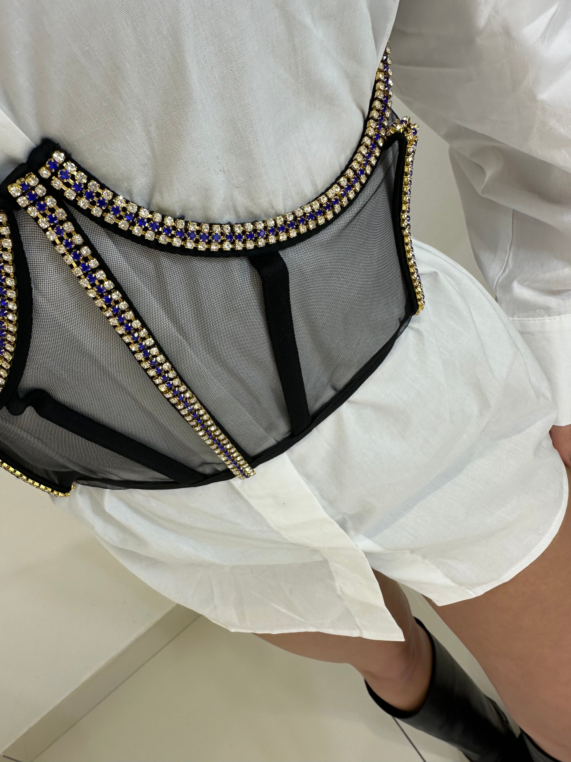 SET COMPOSTO DA CAMICIA OVER E CORSETTO STRUTTURATO, EFFETTO VELATO DA TULLE, IMPREZIOSITO DA STRASS, STRINGHE REGOLABILI SUL RETRO.