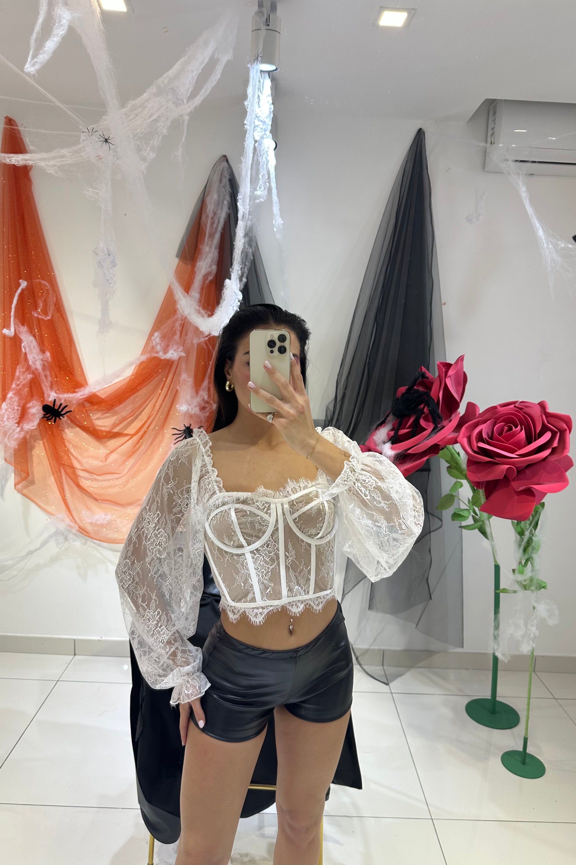 CORSETTO IN PIZZO CON COPPE INCLUSE E FERRETTI, MANICA A SBUFFO VELATA. IN VARI COLORI