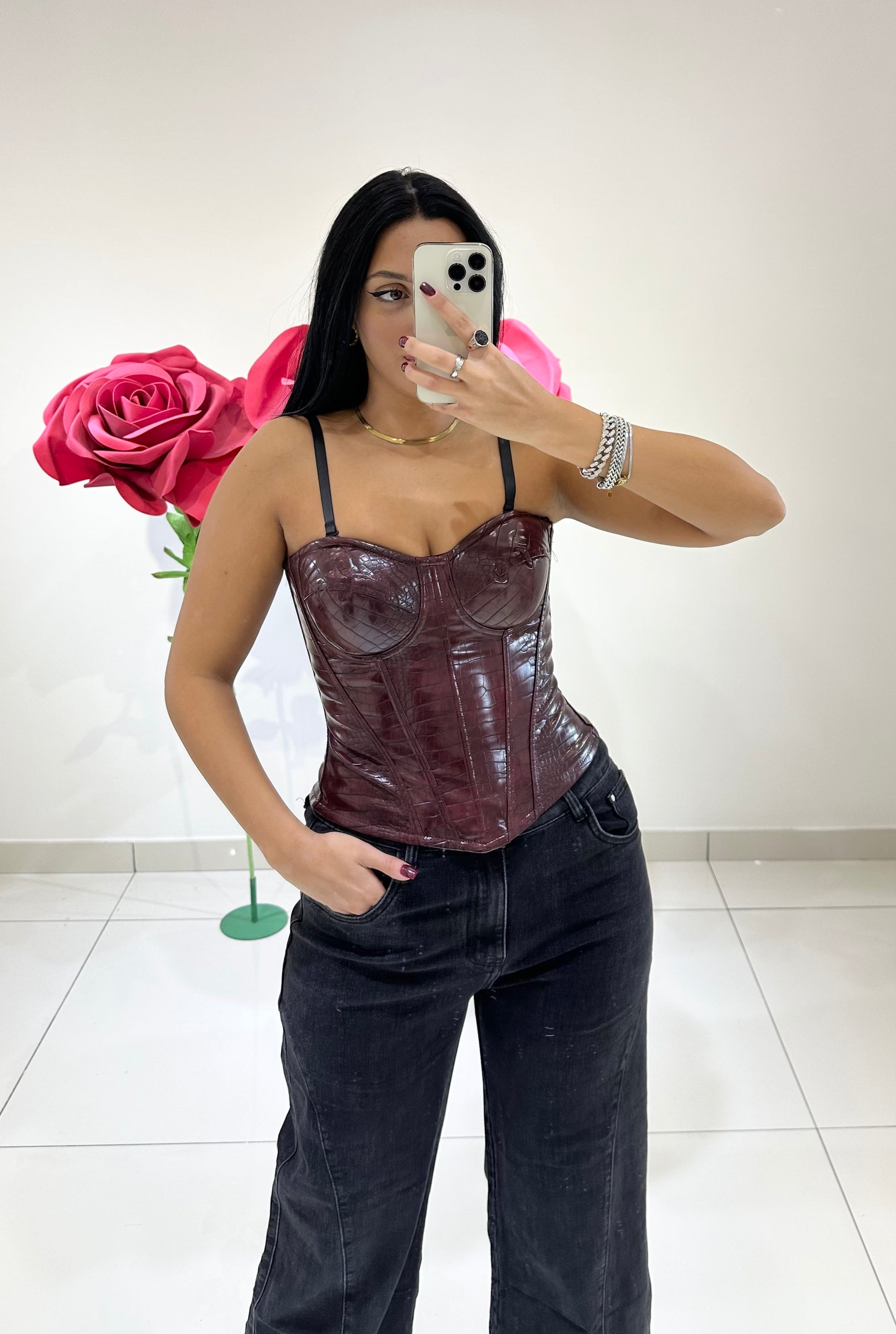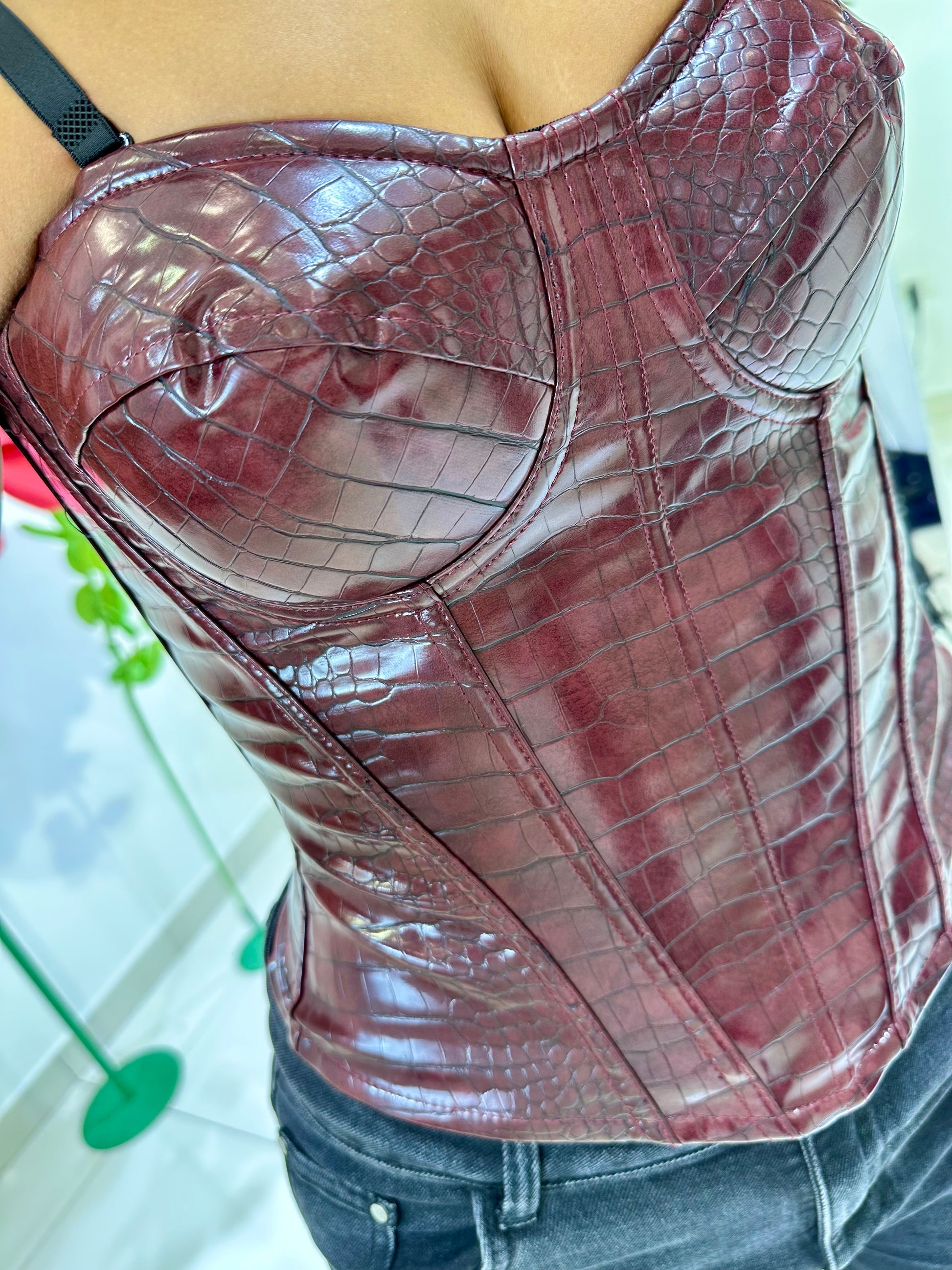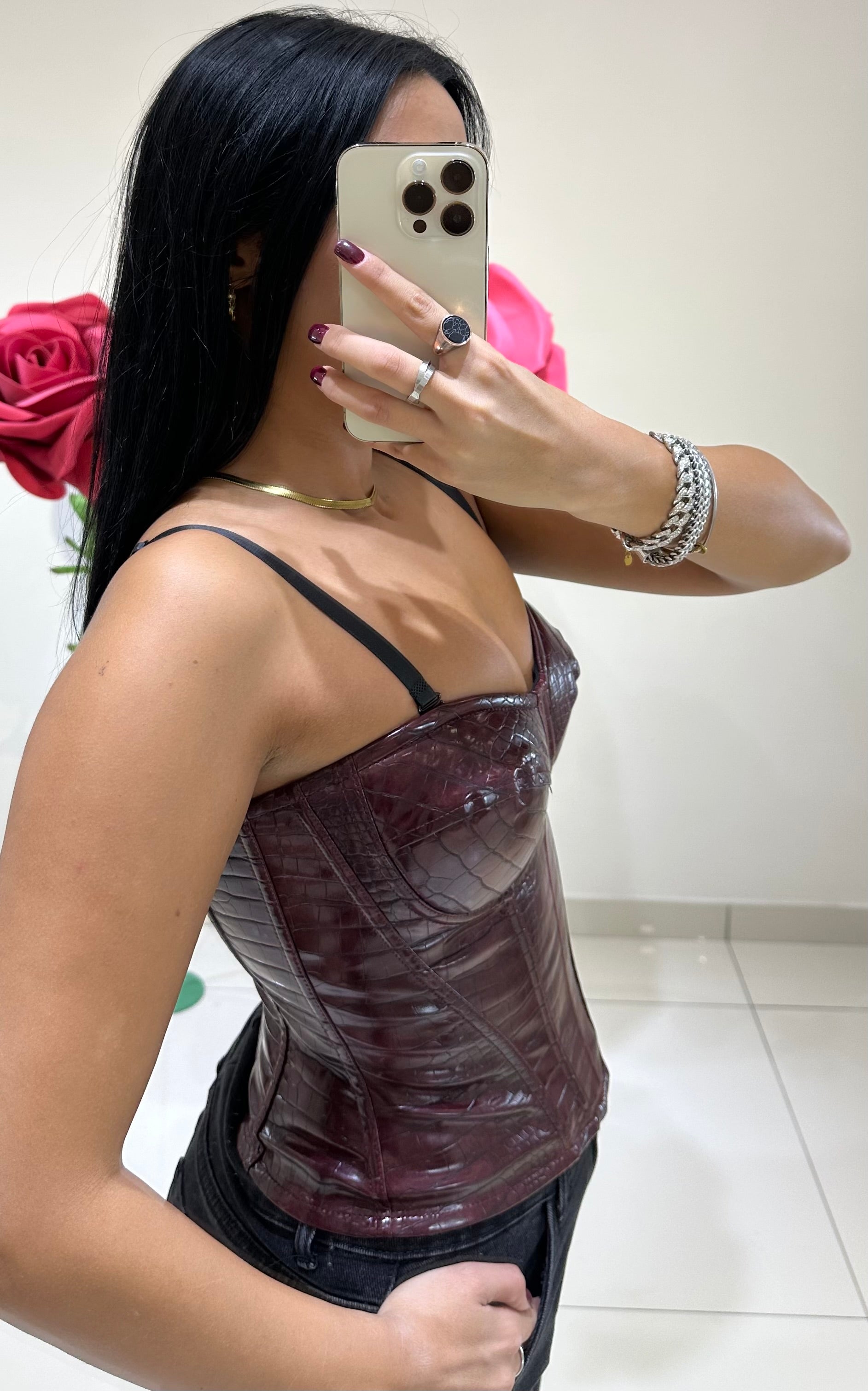 CORSETTO IN ECOPELLE, EFFETTO PITONATO LUCIDO, COPPE EFFETTO PUSH UP, SPALLINE REGOLABILI , CHIUSURA CON ZIP SUL RETRO.