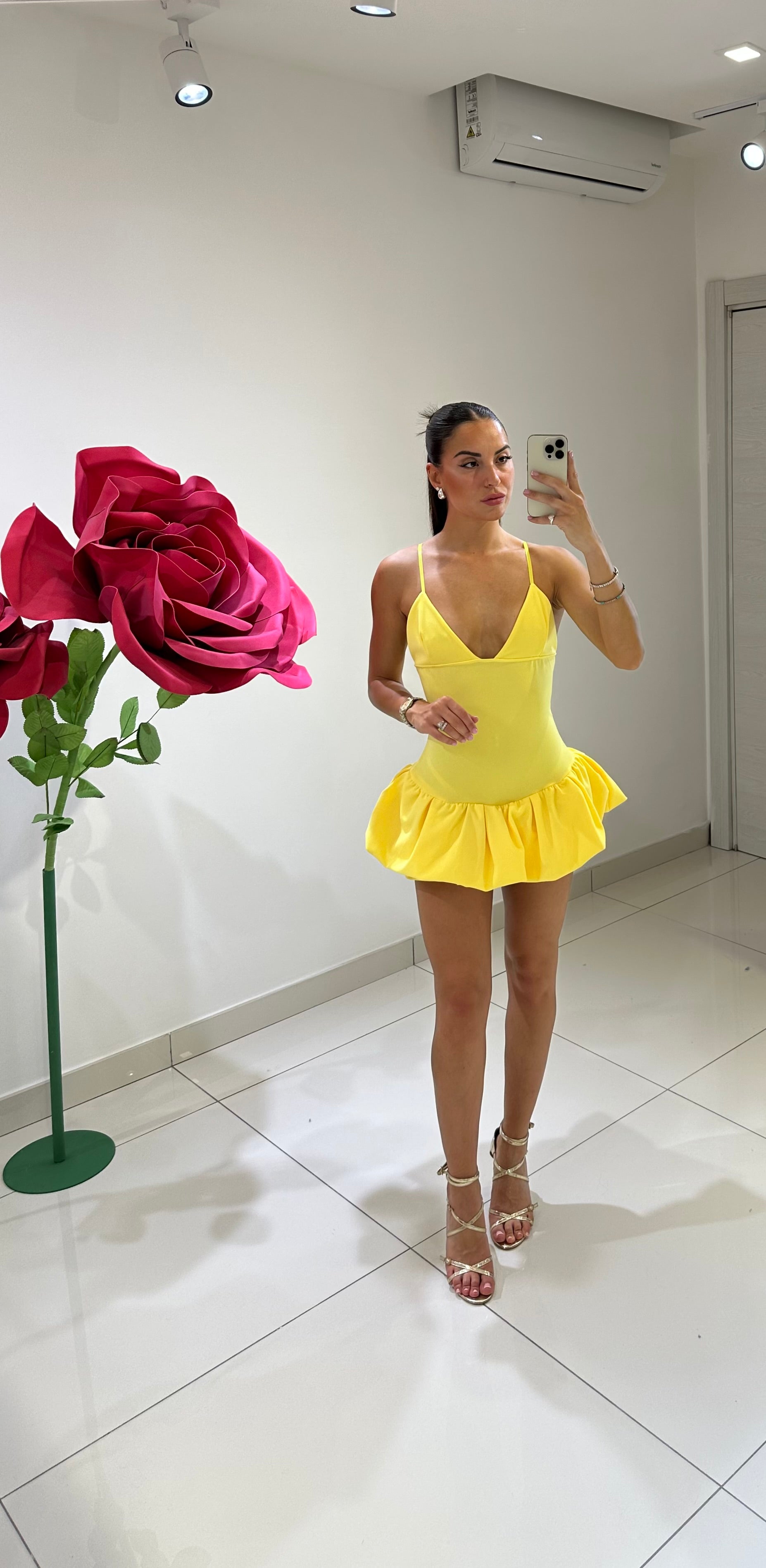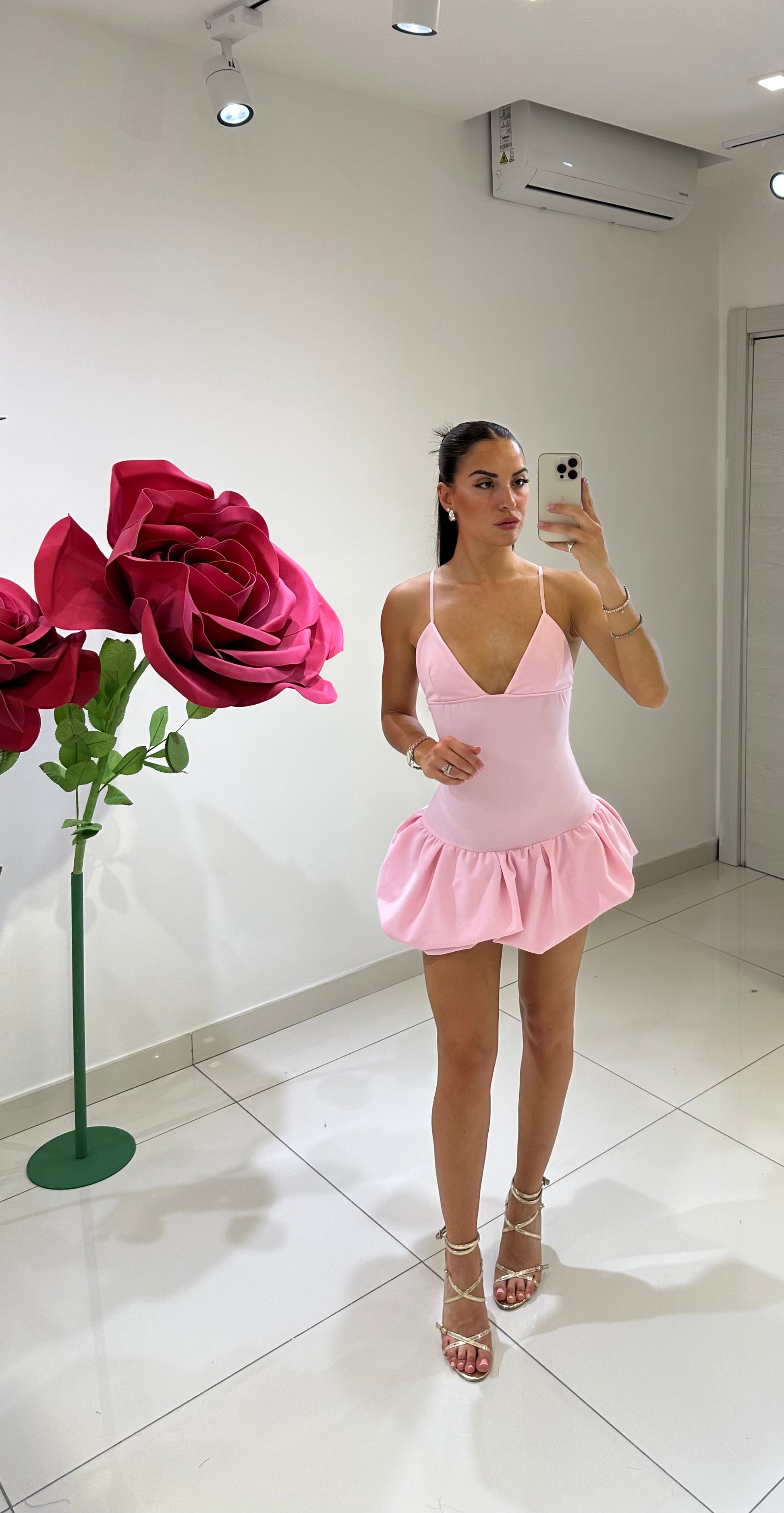 DRESS CON GONNA A PALLONCINO E CULOTTE SOTTO, SCOLLO A V, IN VARI COLORI