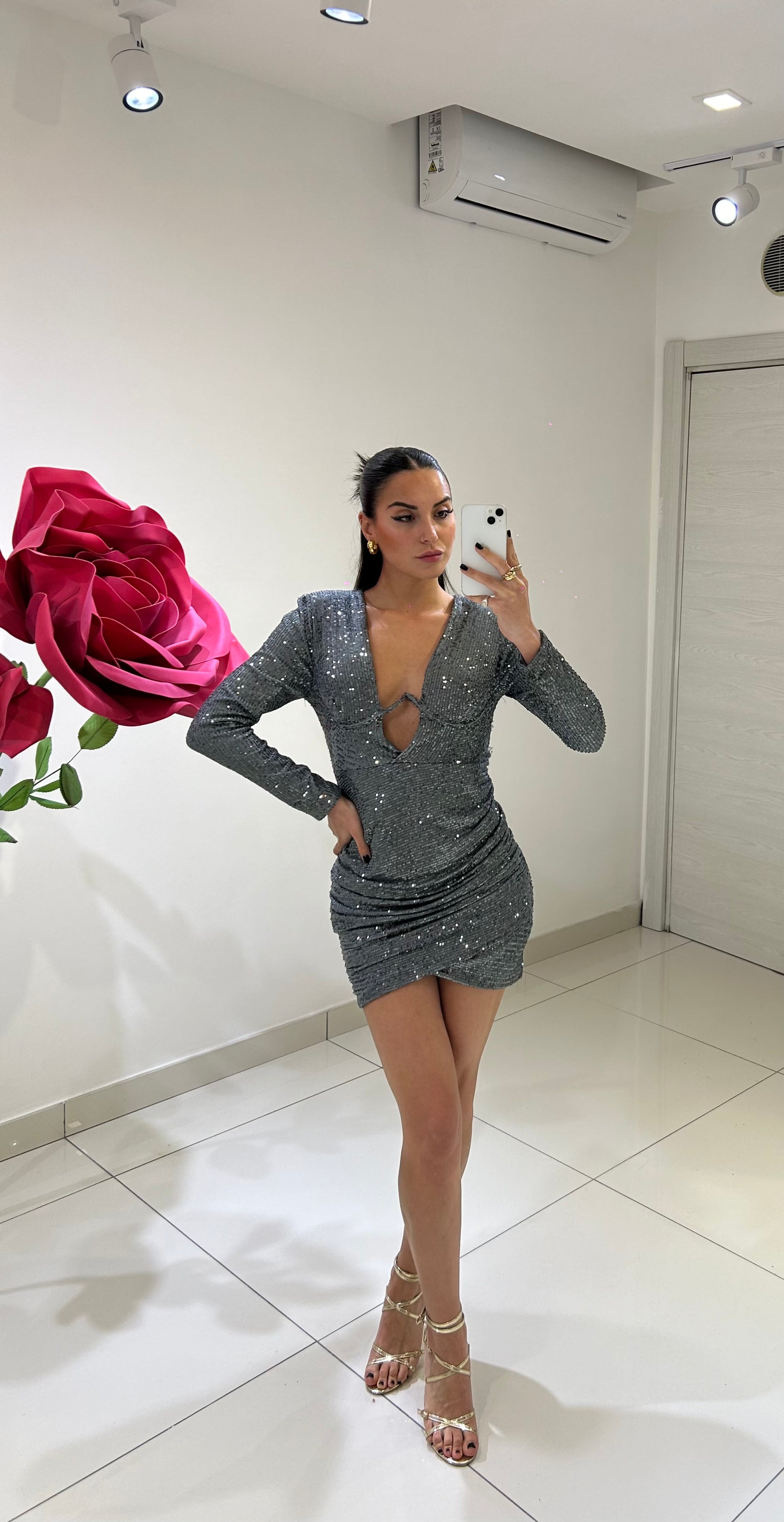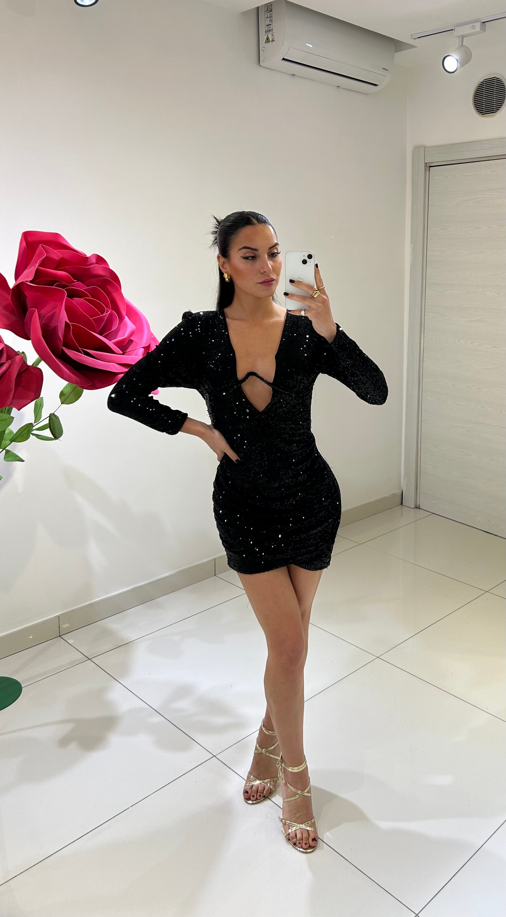 DRESS FULL PAILLETTES CON ALERTIRA SUL DAVANTI COPPE PREFORMATE E DRAPPEGGIO SULLA GONNA, IN VARI COLORI