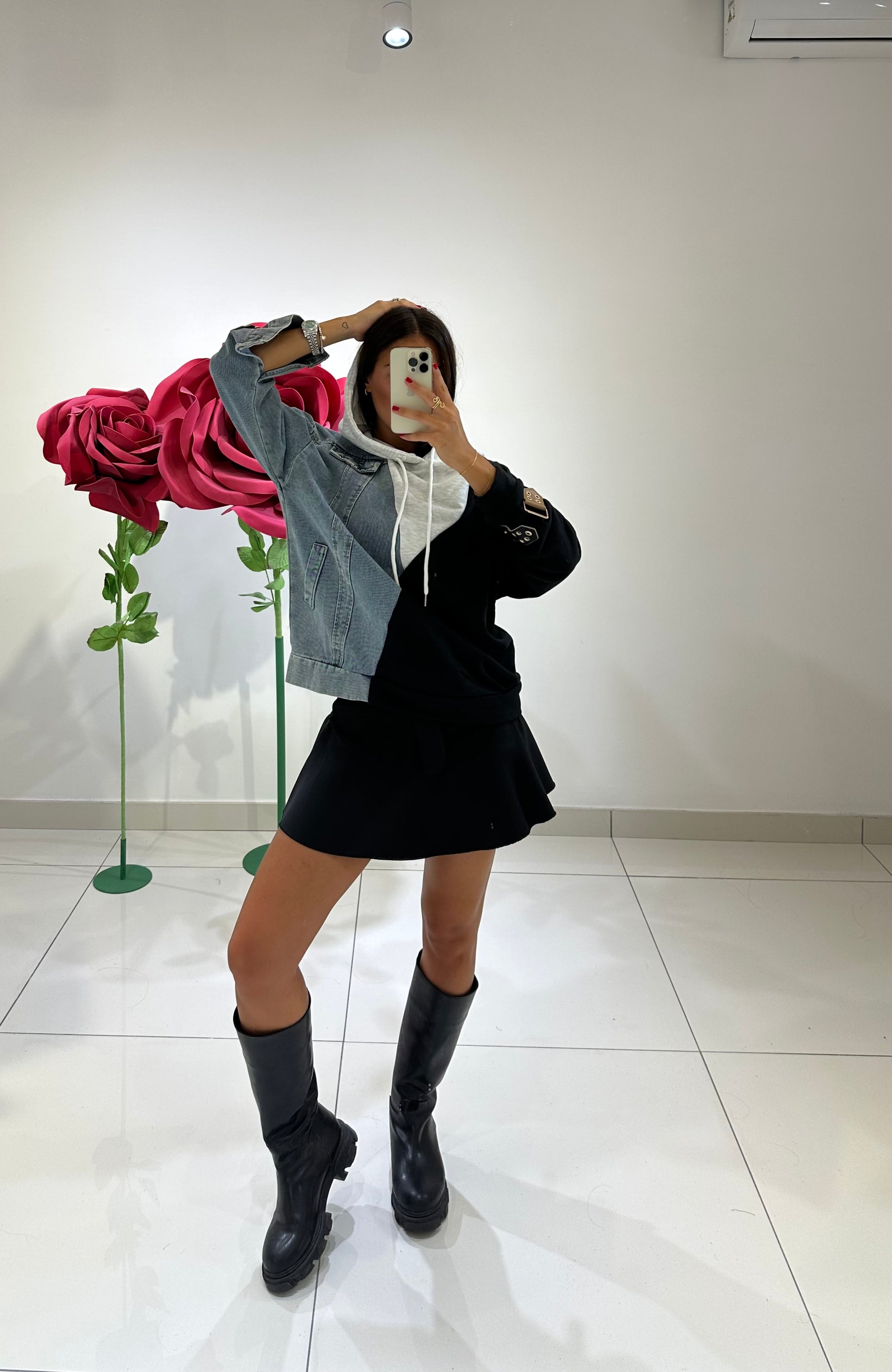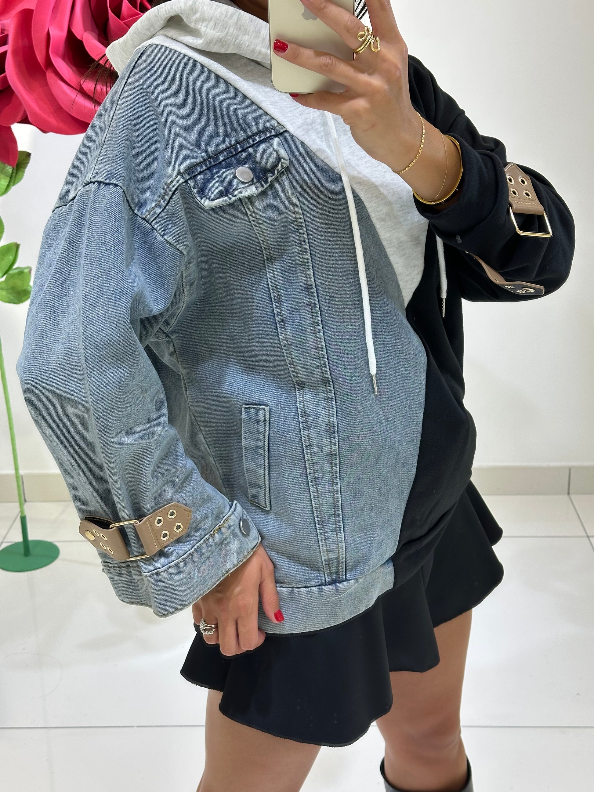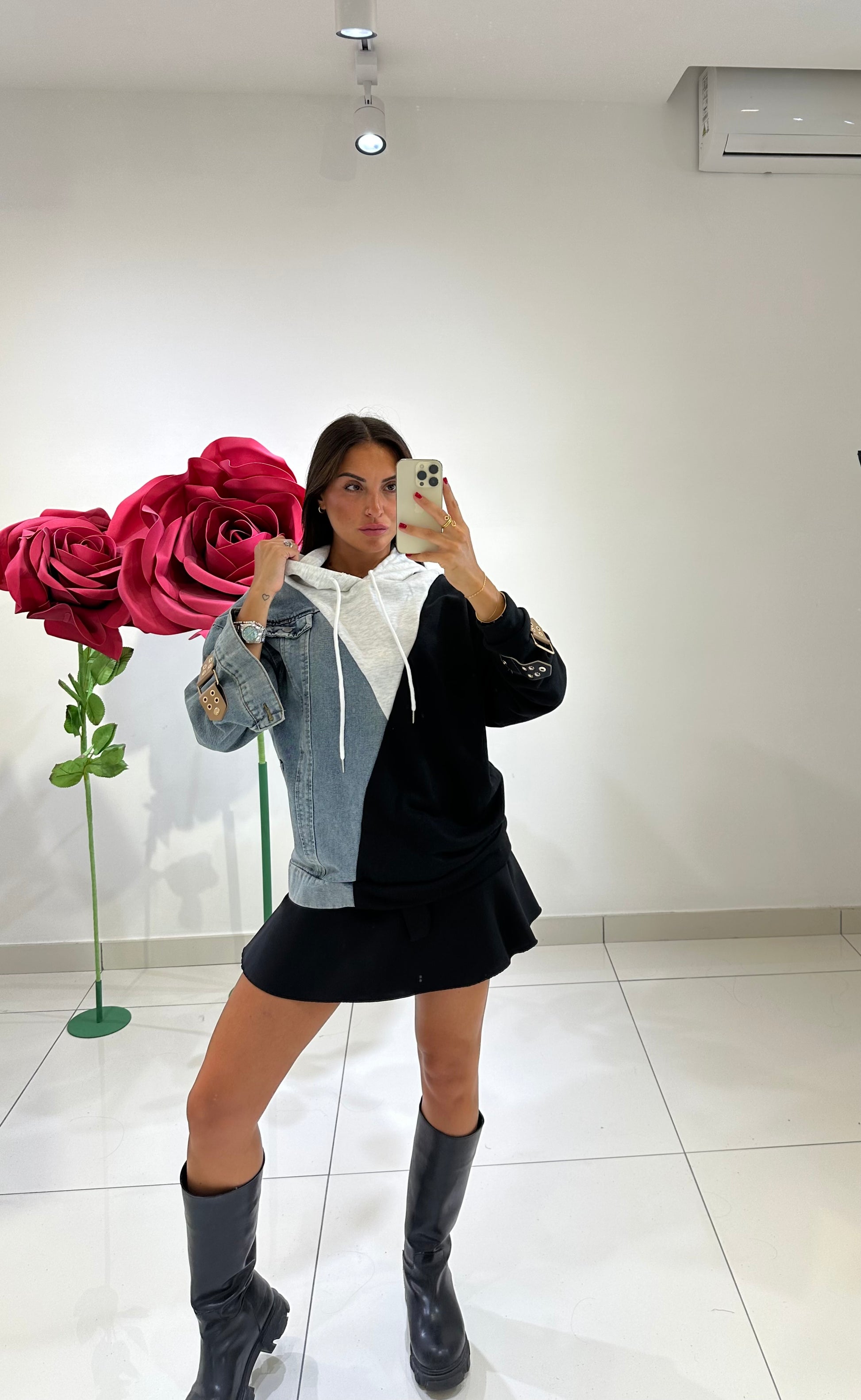 FELPA OVER IN TESSUTO E DENIM, DOPPIO COLORE CON APPLICAZIONI DI FIBIE E STASCHE