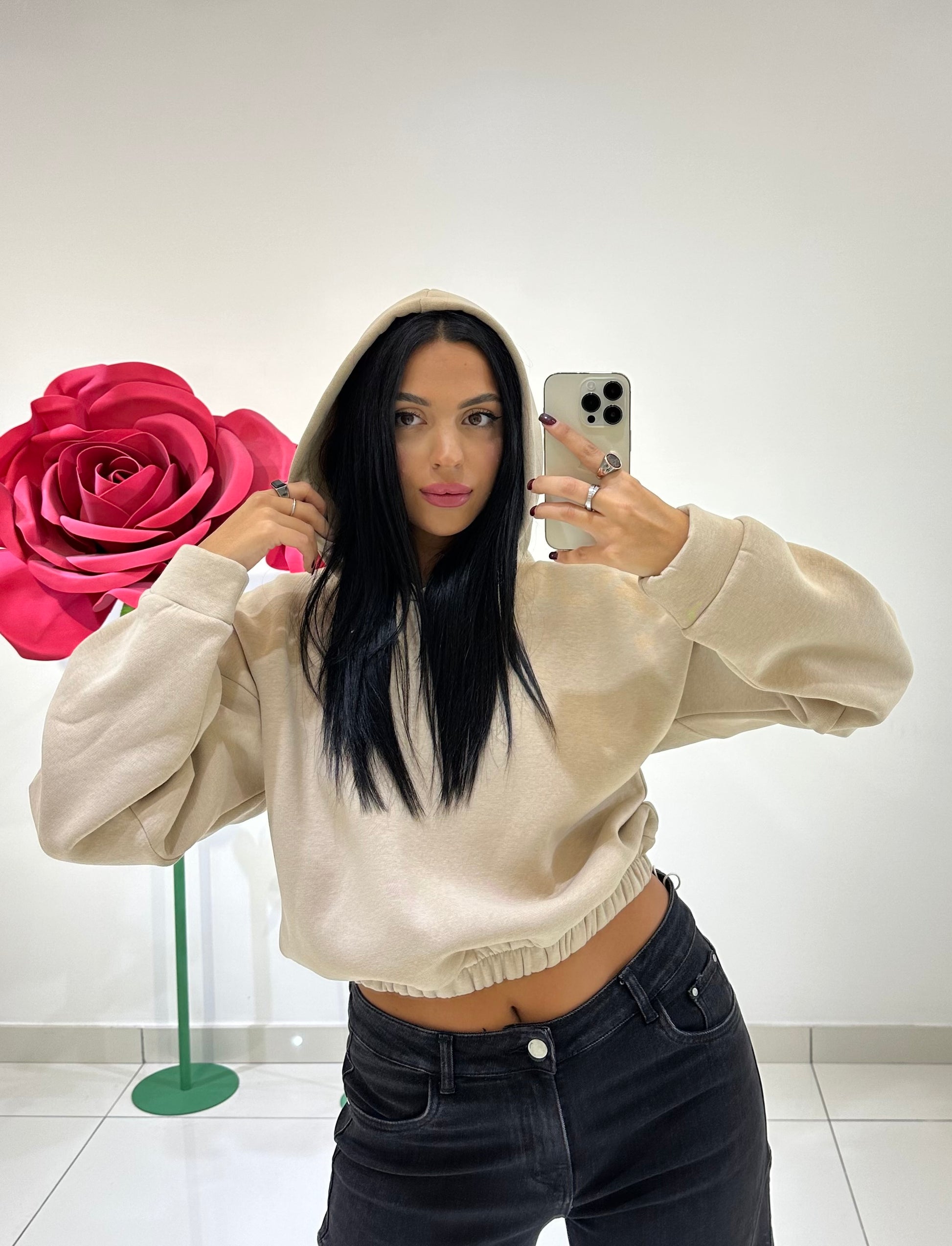 FELPA OVER CROP, CON ELASTICO IN VITA E CAPPUCCIO ,FELPATA ALL’INTERNO. VARI COLORI.