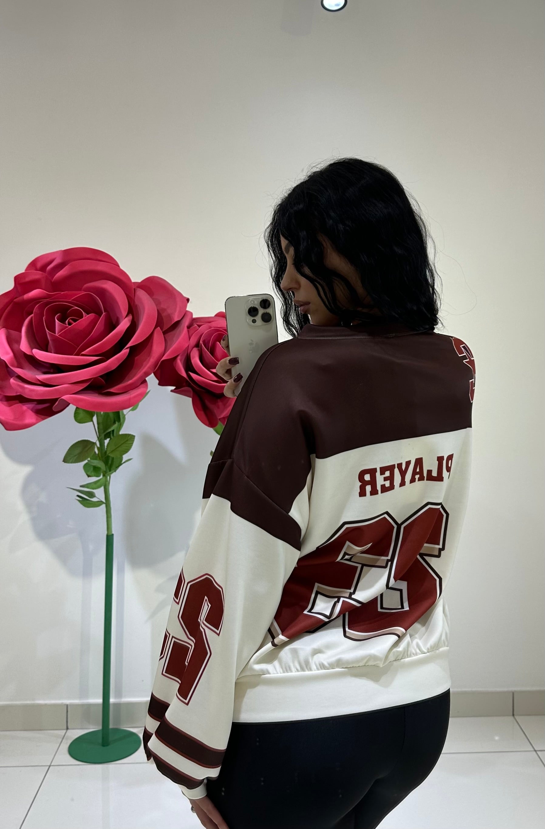 FELPA CON SCOLLO A V, TAGLIO OVER, DETTAGLIATA DA GRAFICHE, SPALLA BASSA.VARI COLORI.
