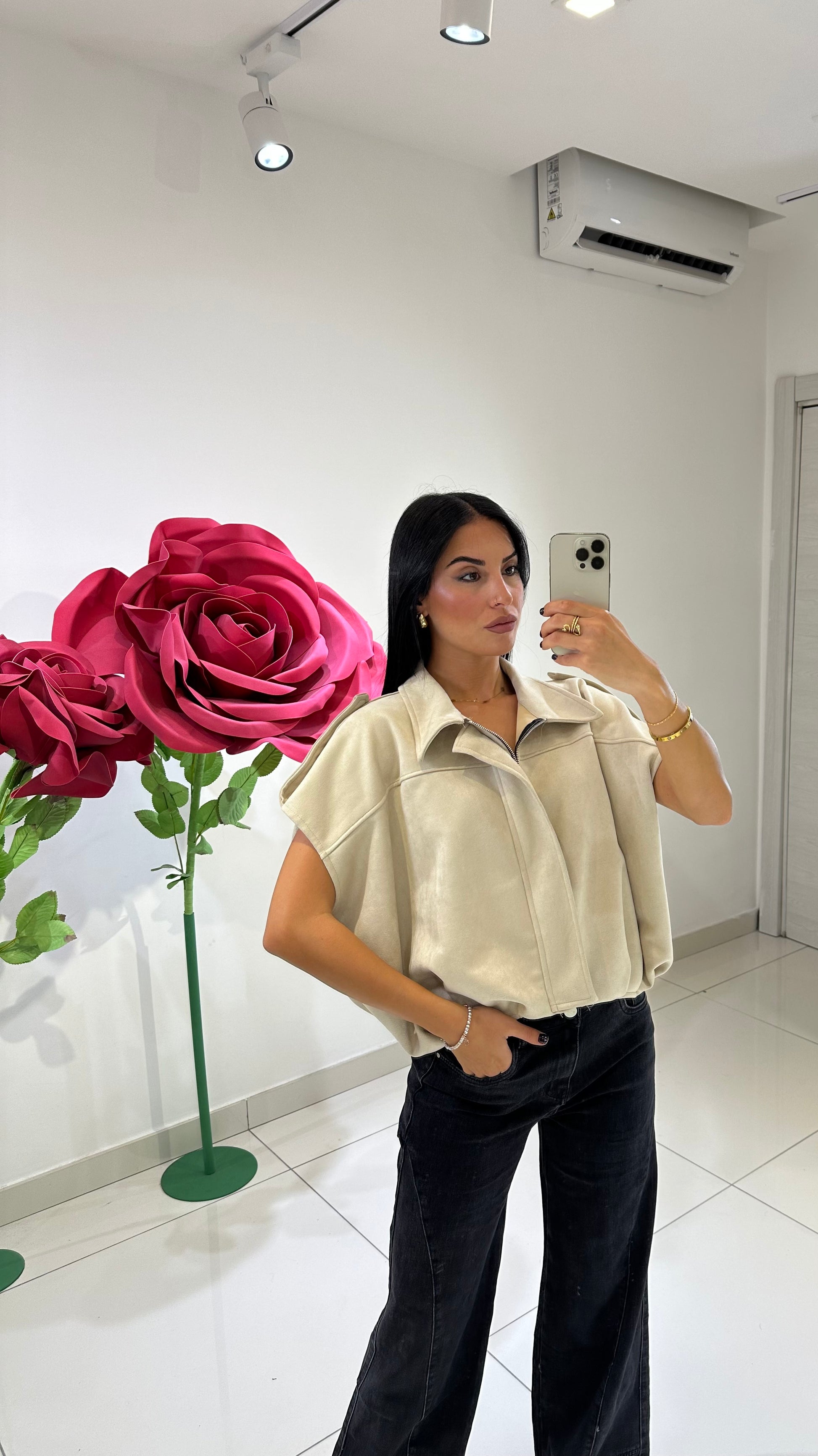 GILET CROP IN CAMOSCIO, ZIP CENTRALE ELASTICO IN VITA, MEZZA MANICA SCESA CON DETTAGLI SULLE SPALLE. IN VARI COLORI