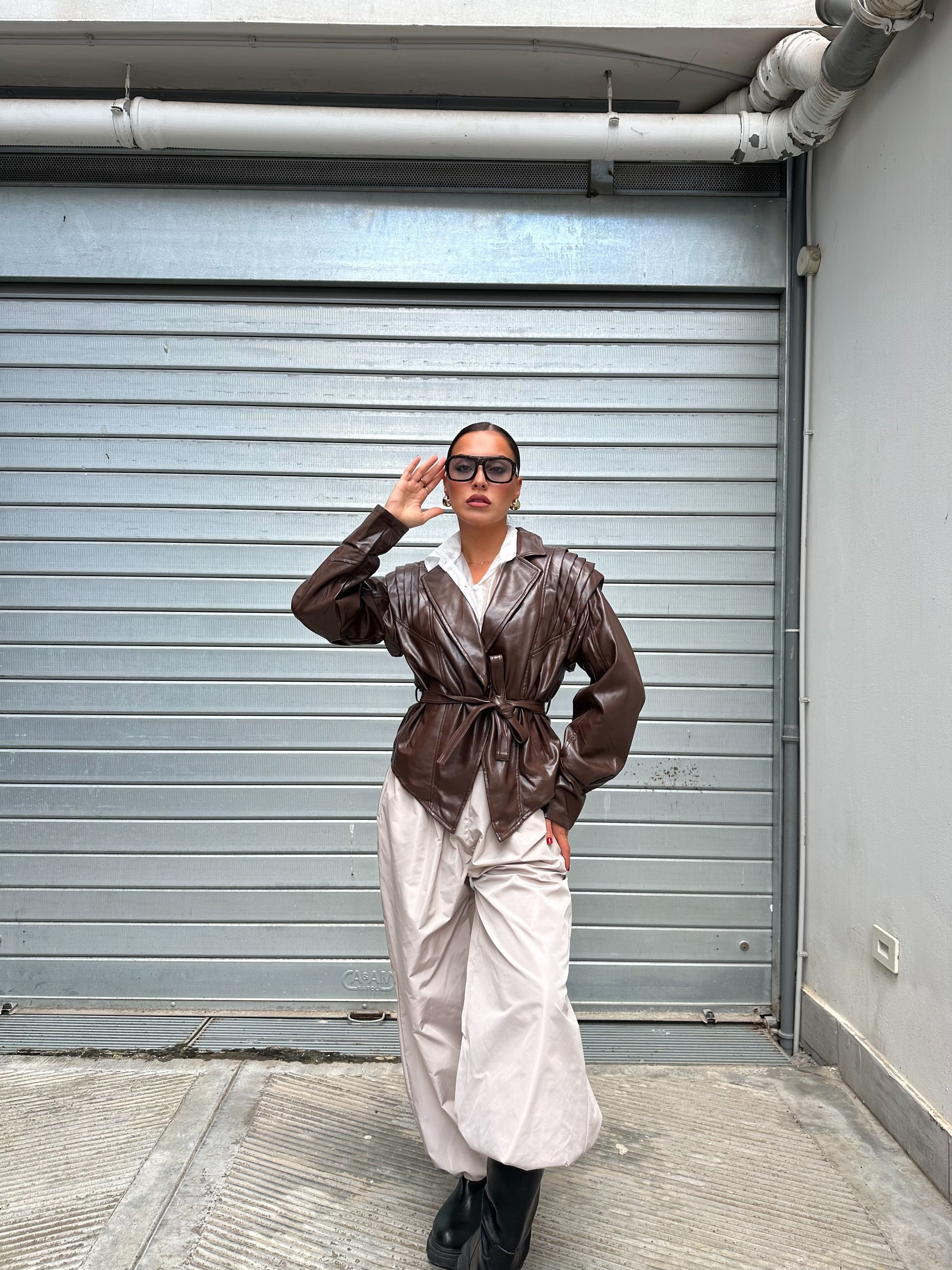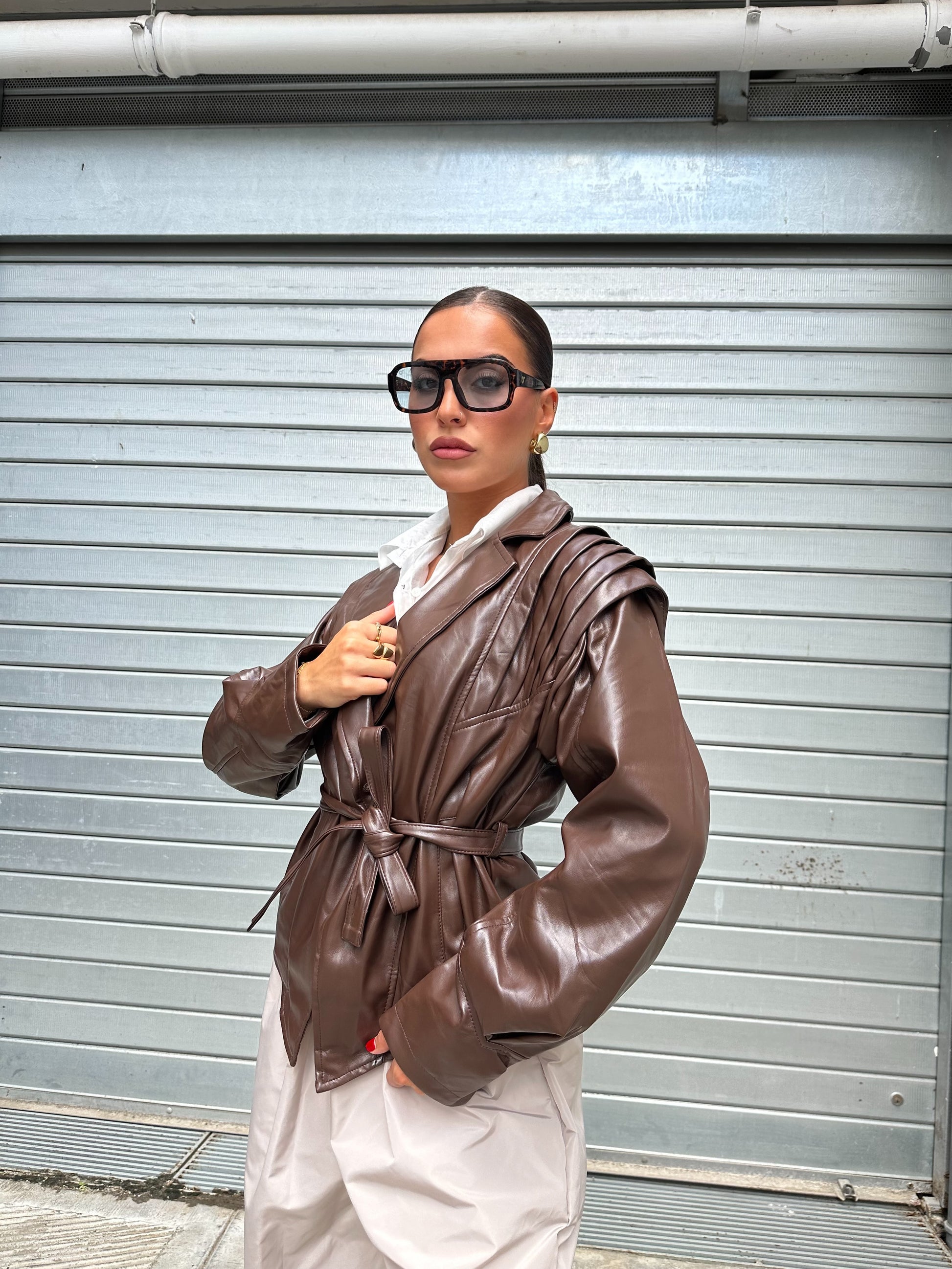 JACKET IN ECO-PELLE FODERATO ALL’INTERNO, CON PIEGHE SULLE SPALLINE, AVVITATA CON UN SOLO BOTTONE, CINTURA INCLUSA. IN VARI COLORI