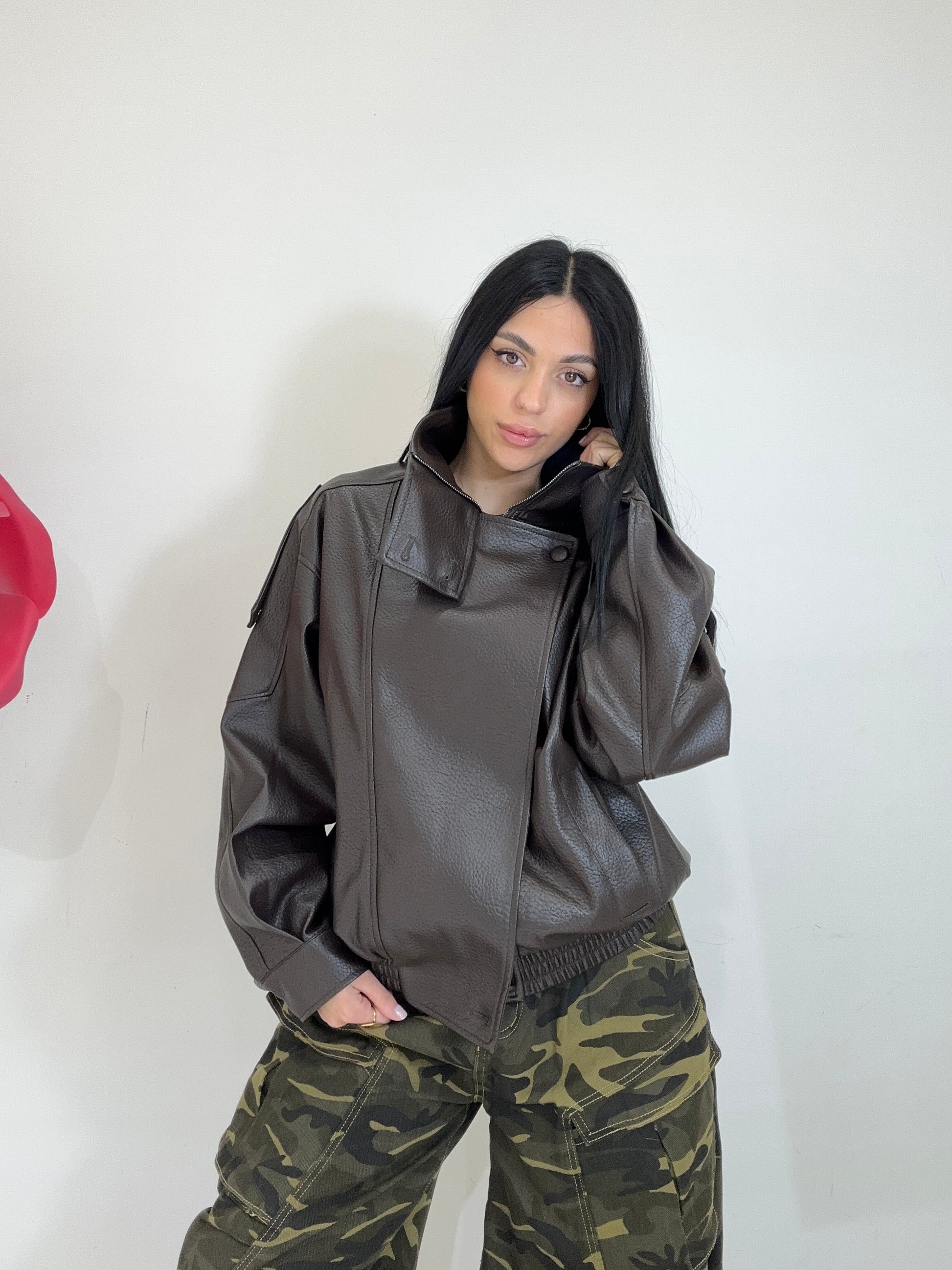 JACKET IN ECOPELLE DETTAGLIATO DA ELASTICO IN VITA E BOTTONI, ZIP COME CHIUSURA.