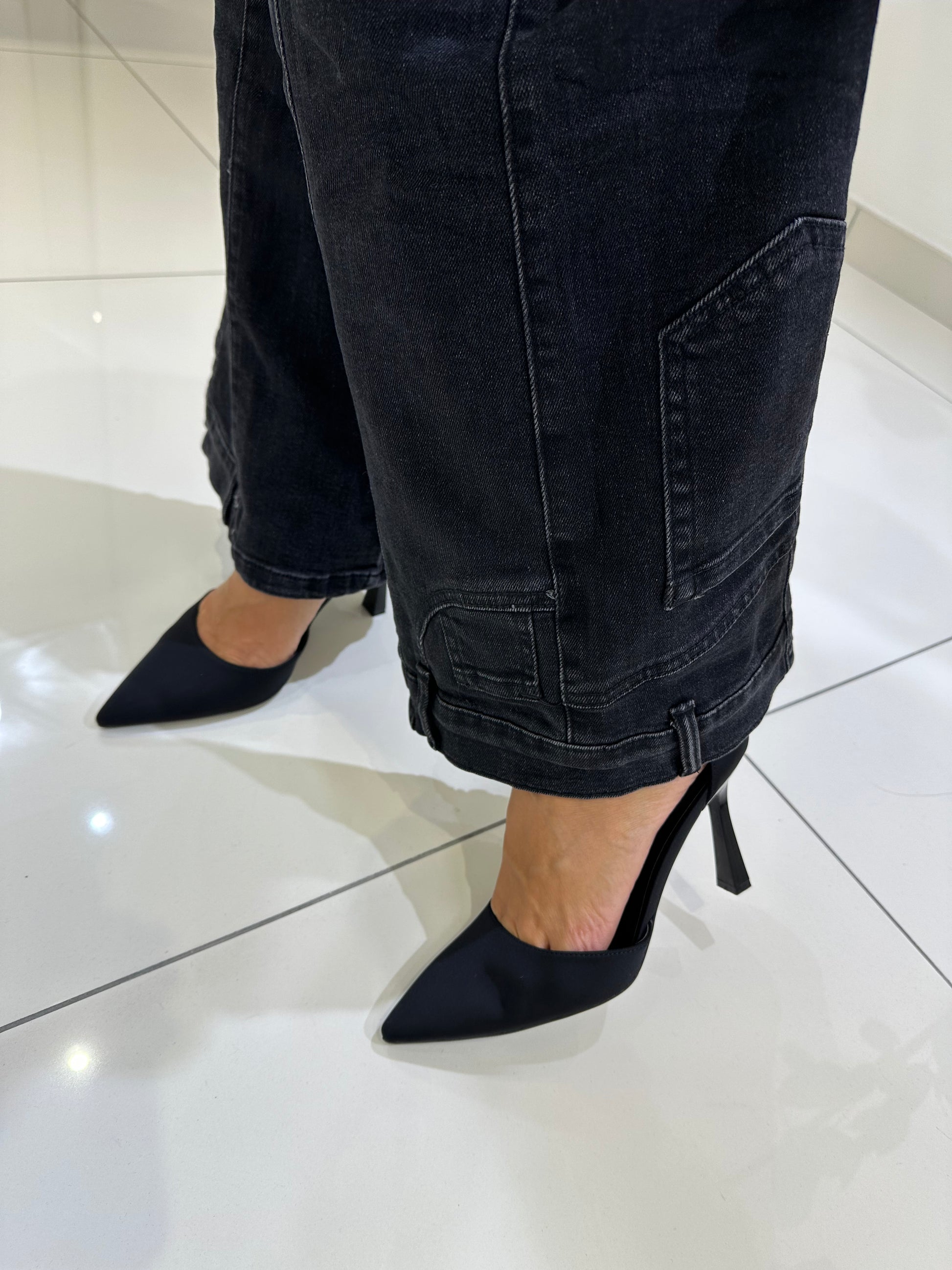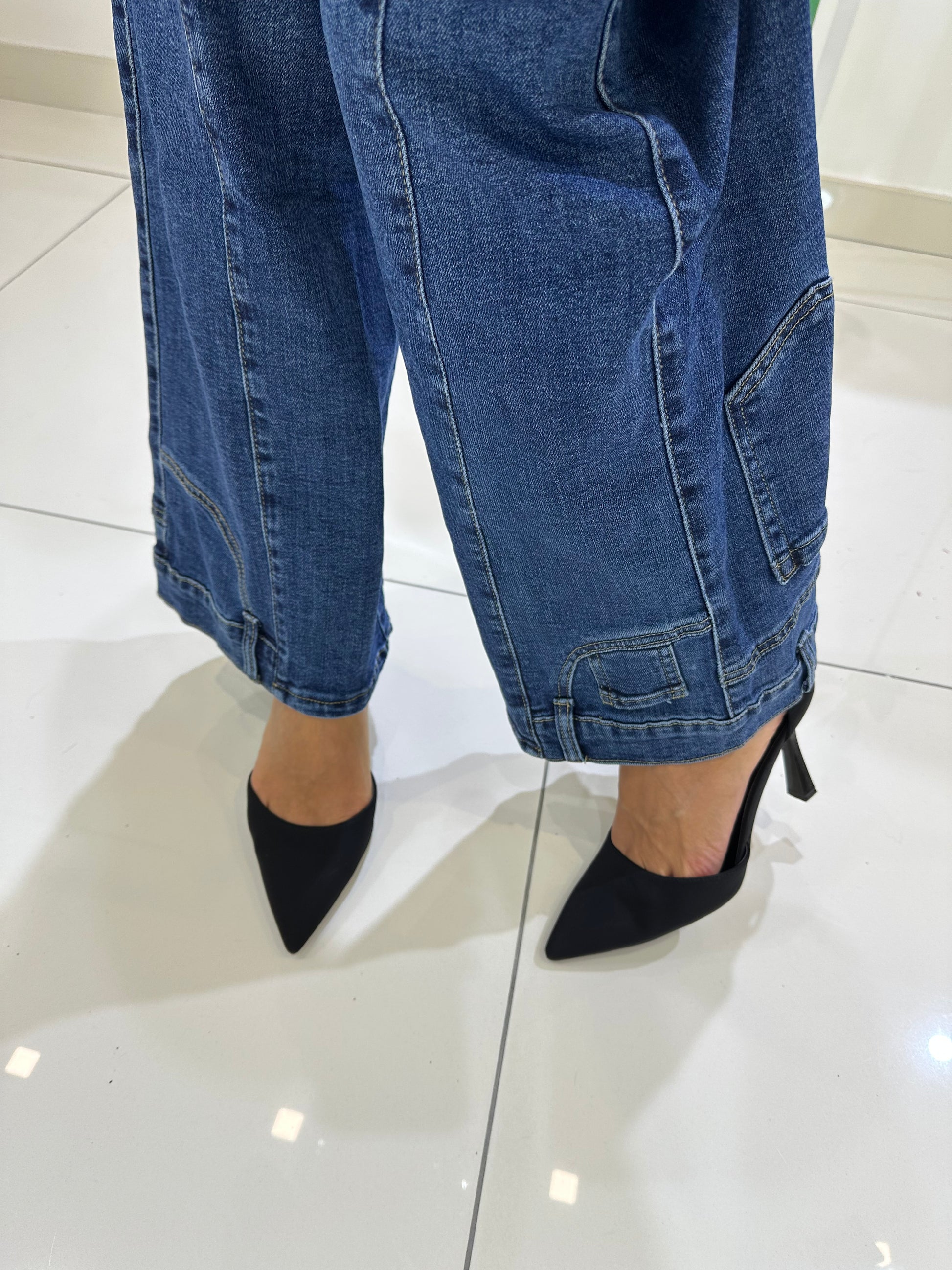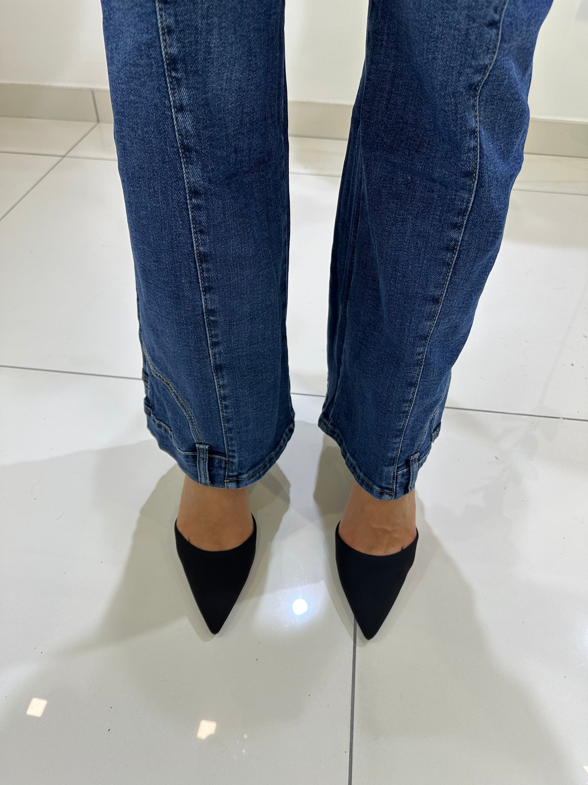 JEANS VITA ALTA, GAMBA DRITTA, TESSUTO ELASTICO, PARTICOLARITÀ AL FONDO. VA A TAGLIE