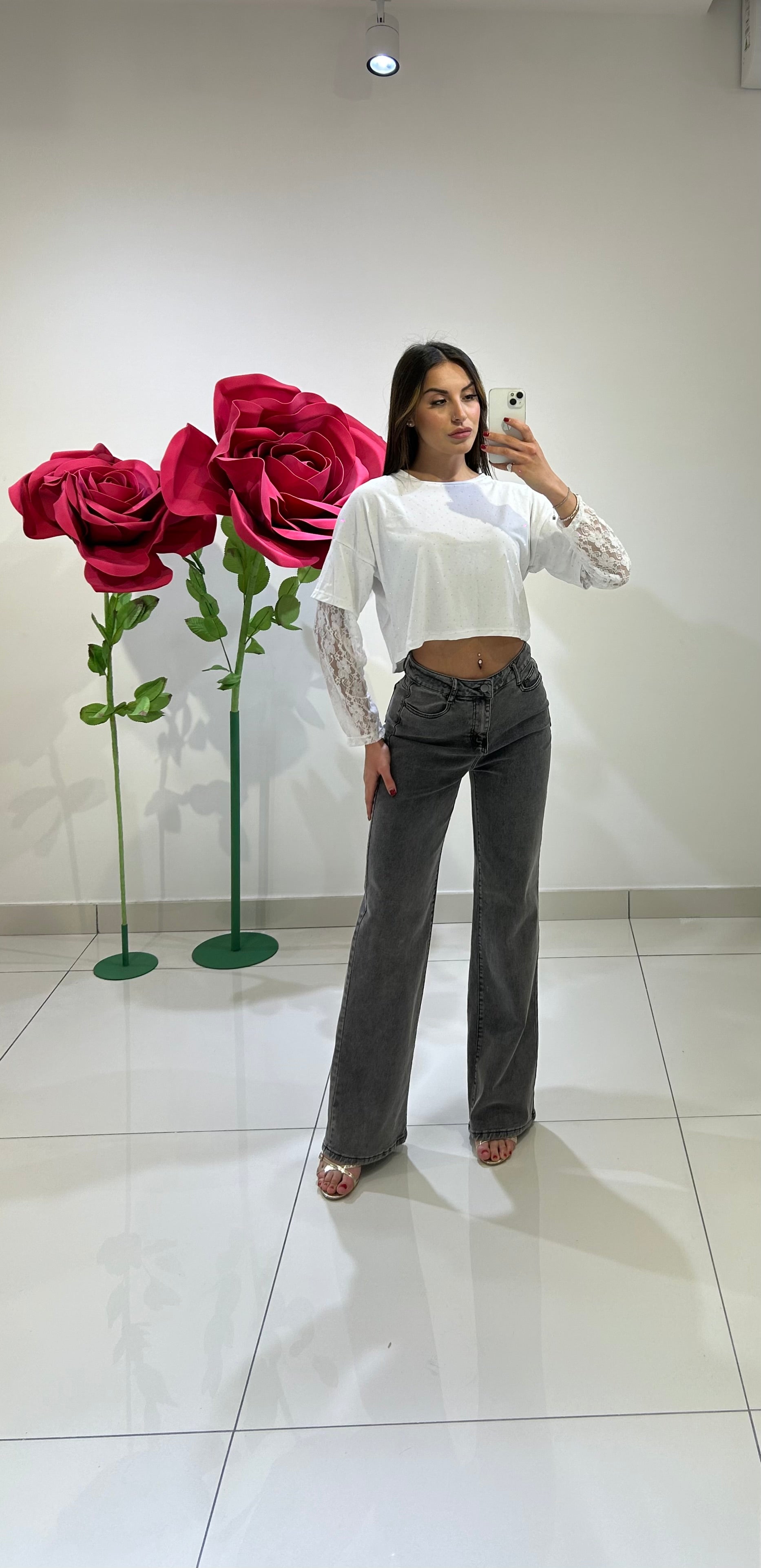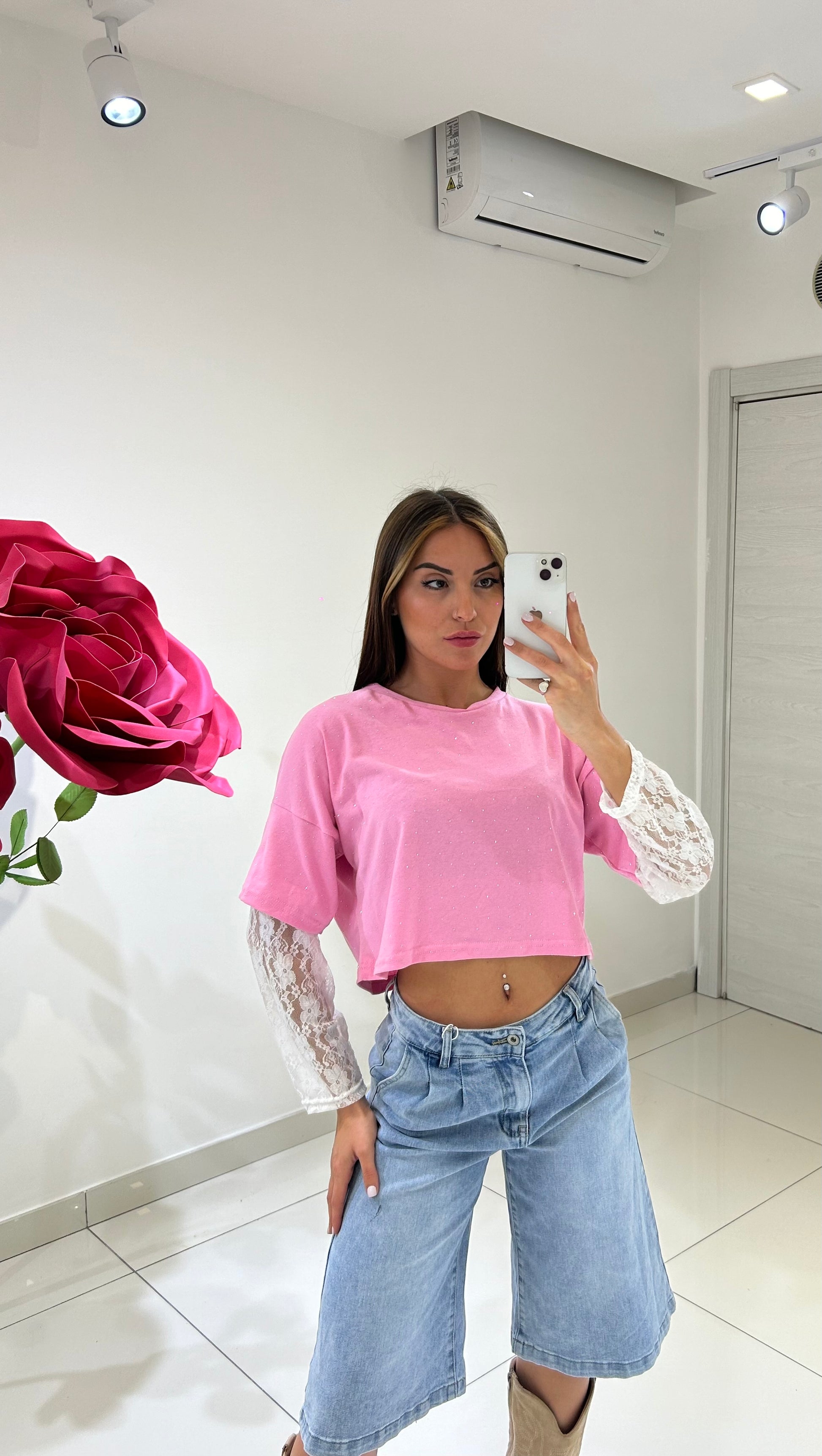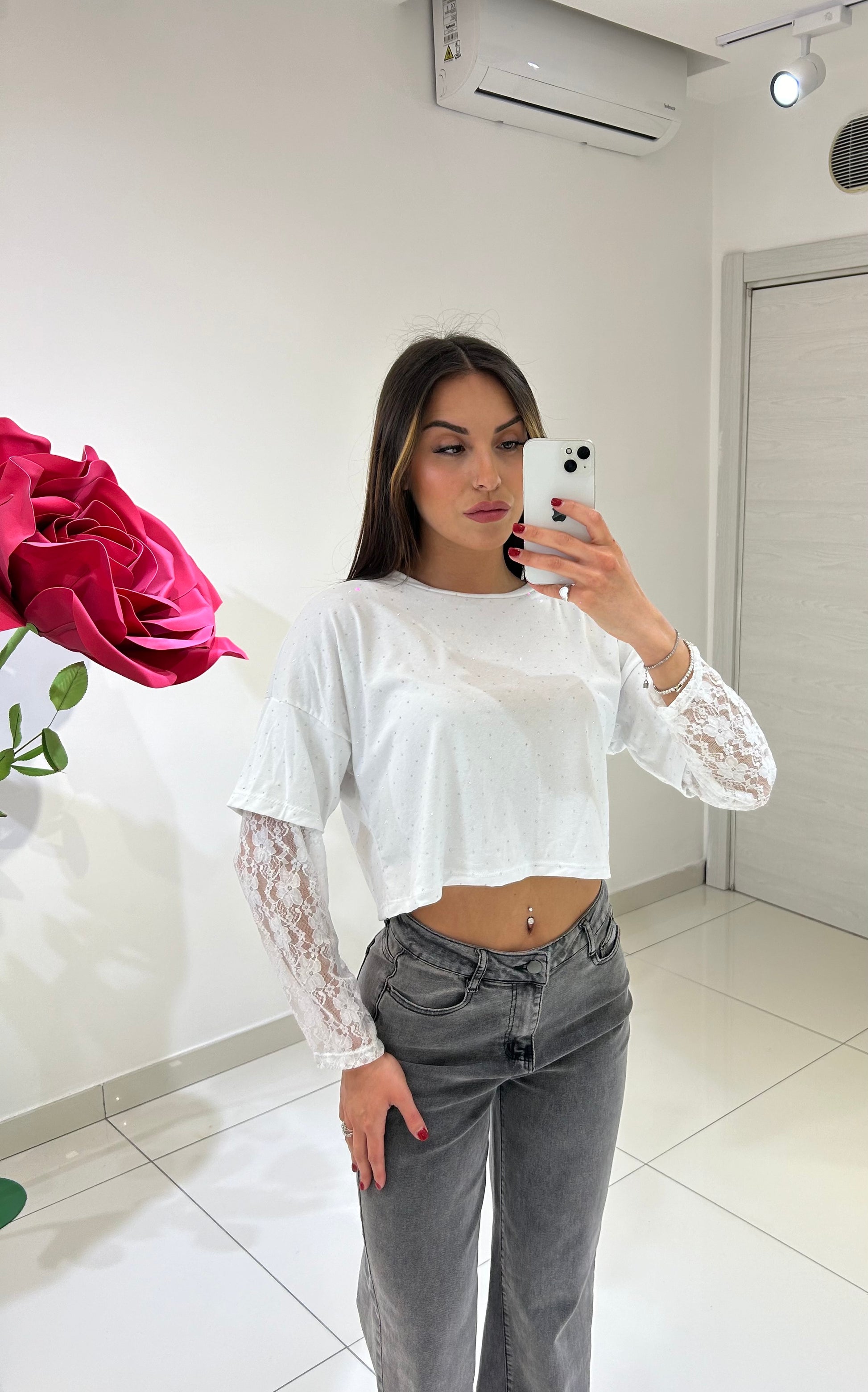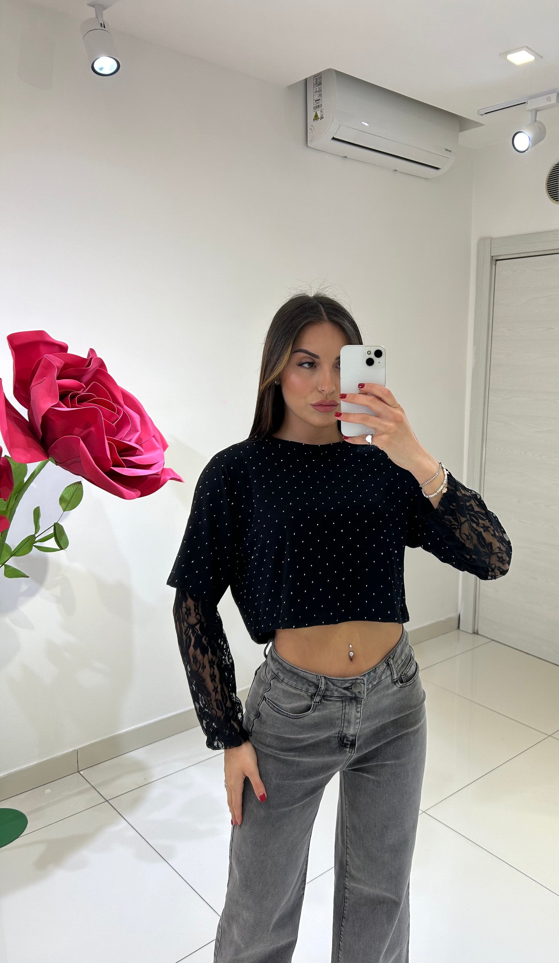 MAGLIA CROP CON STRASS E MANICOTTI IN PIZZO E STRASS, TAGLIA UNICA