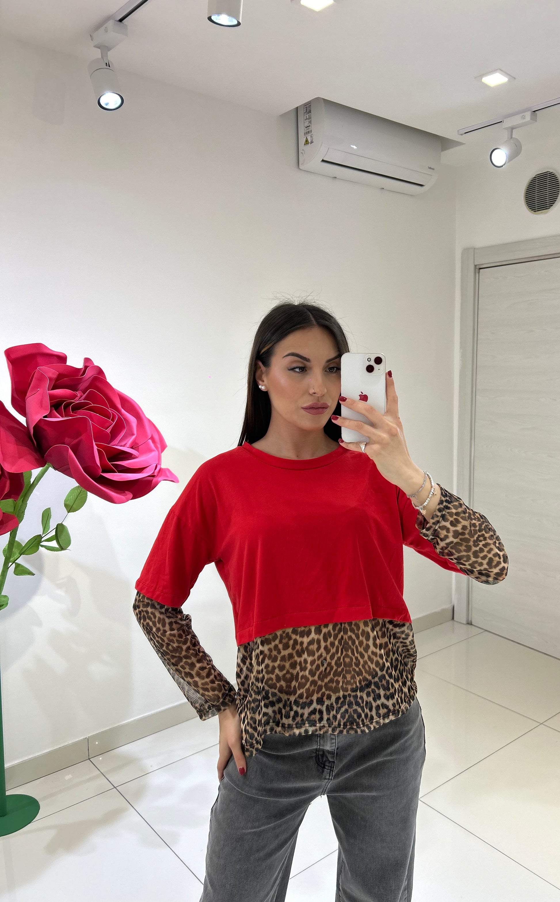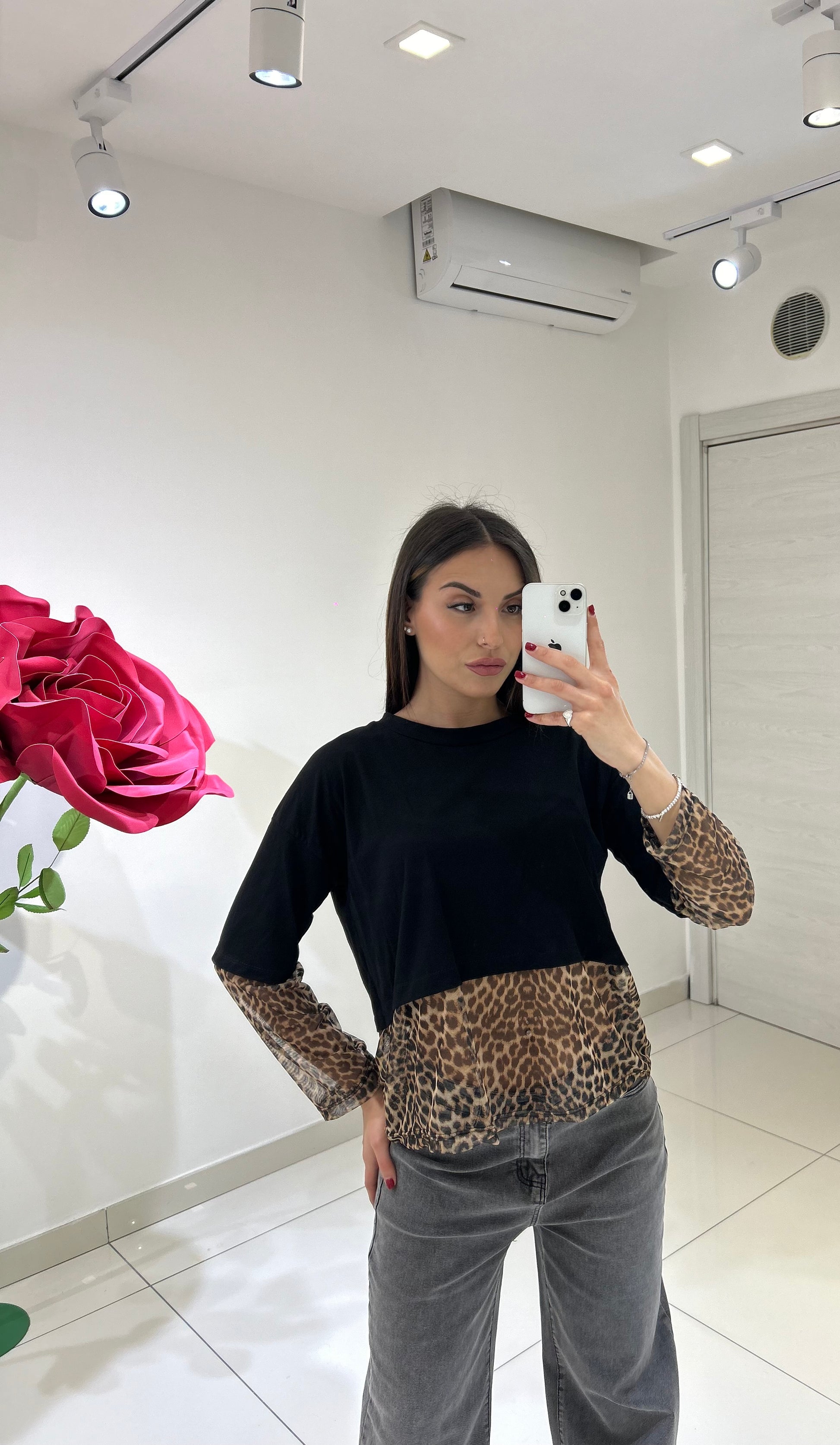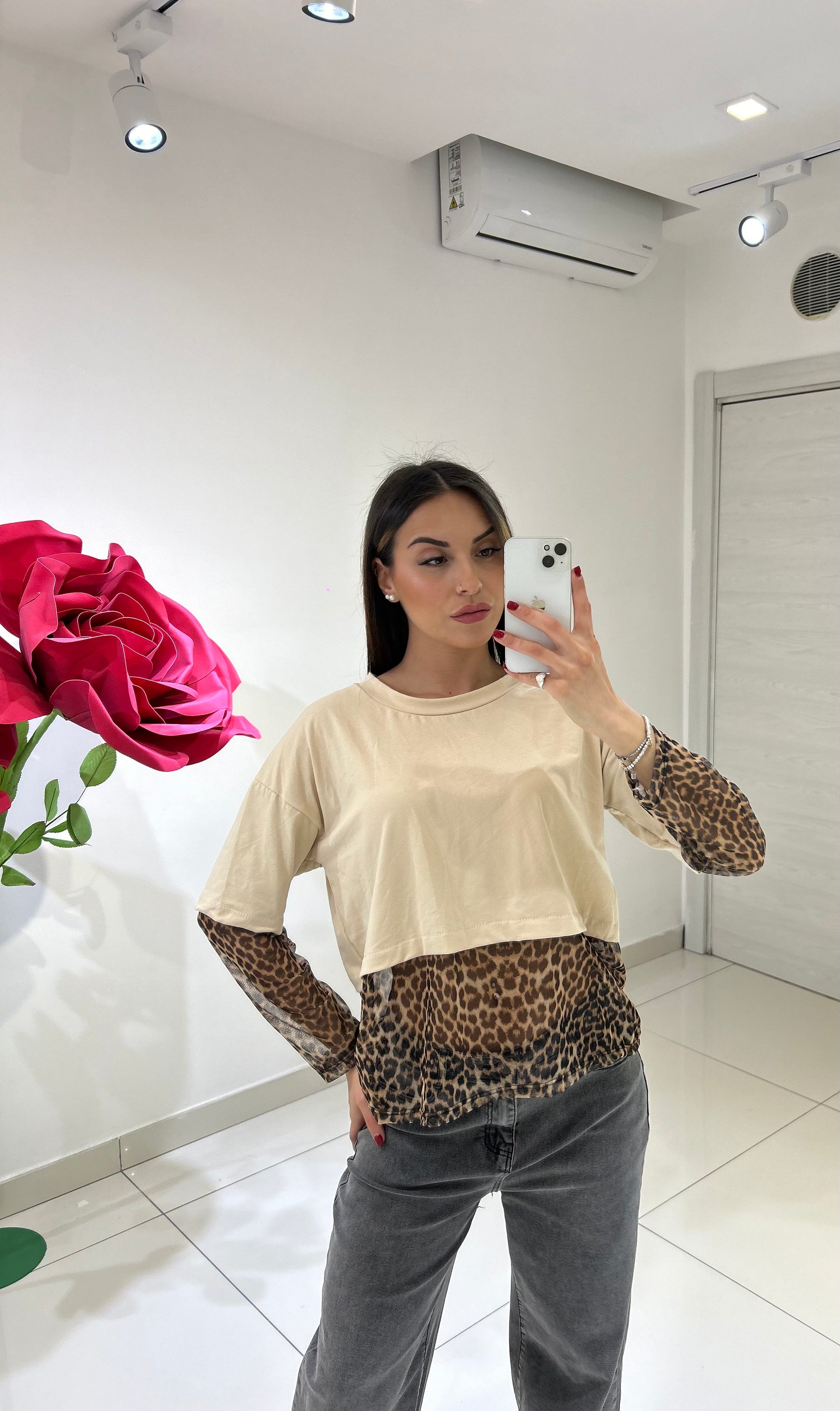 MAGLIA CON TULLE ANIMALIER E MANICHE CON DETTAGLIO TULLE ANIMALIER, TAGLIA UNICA