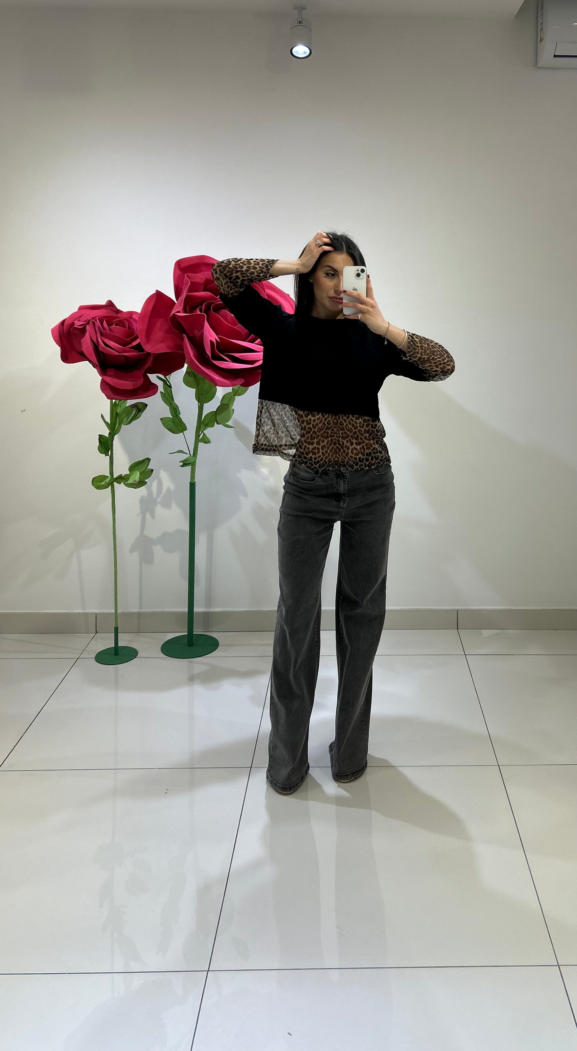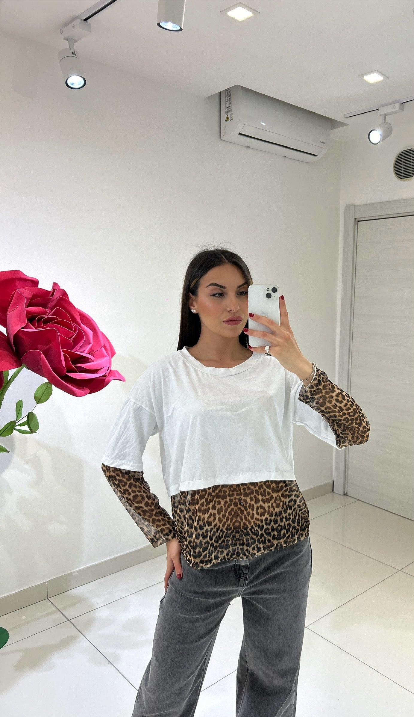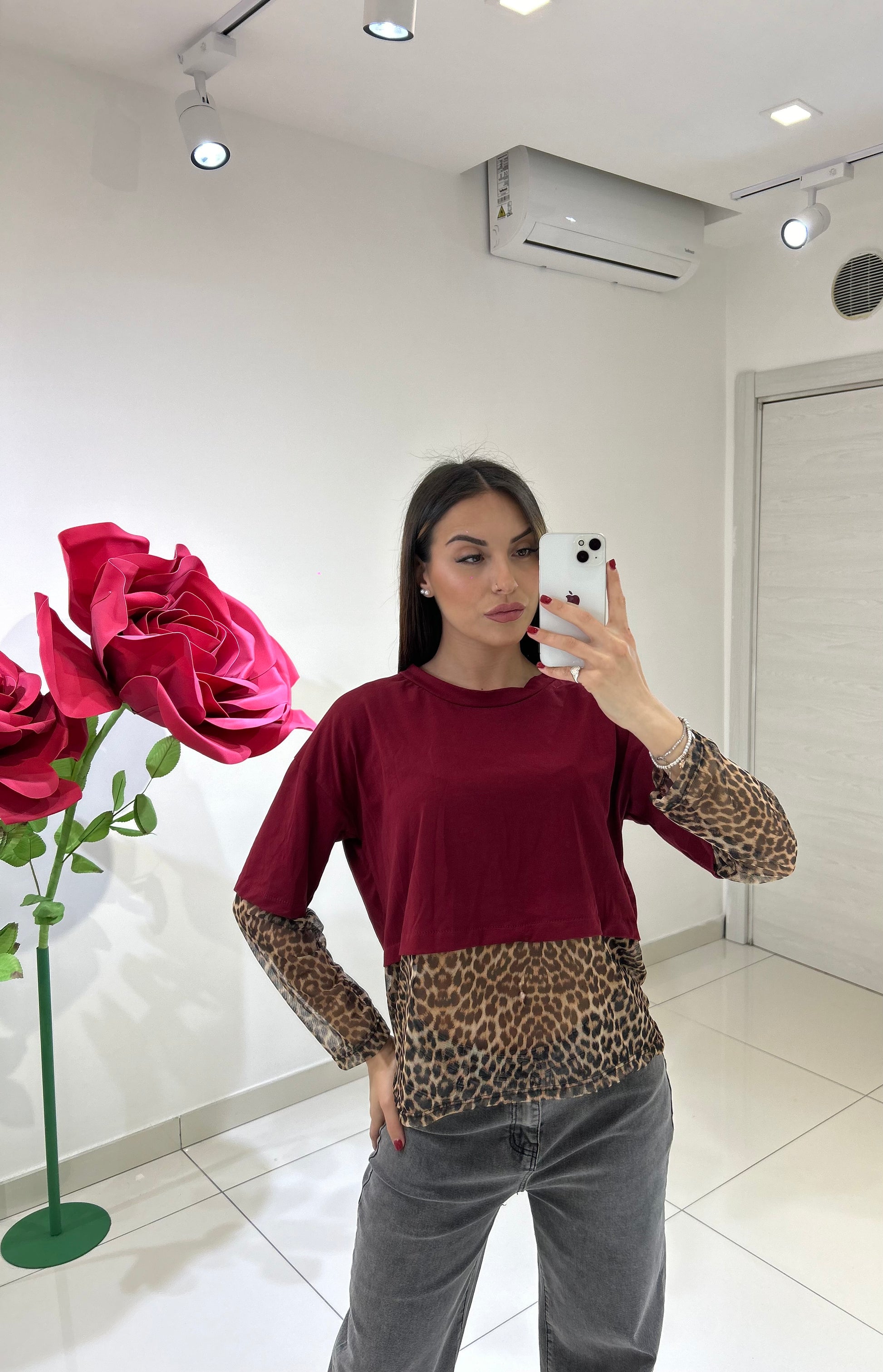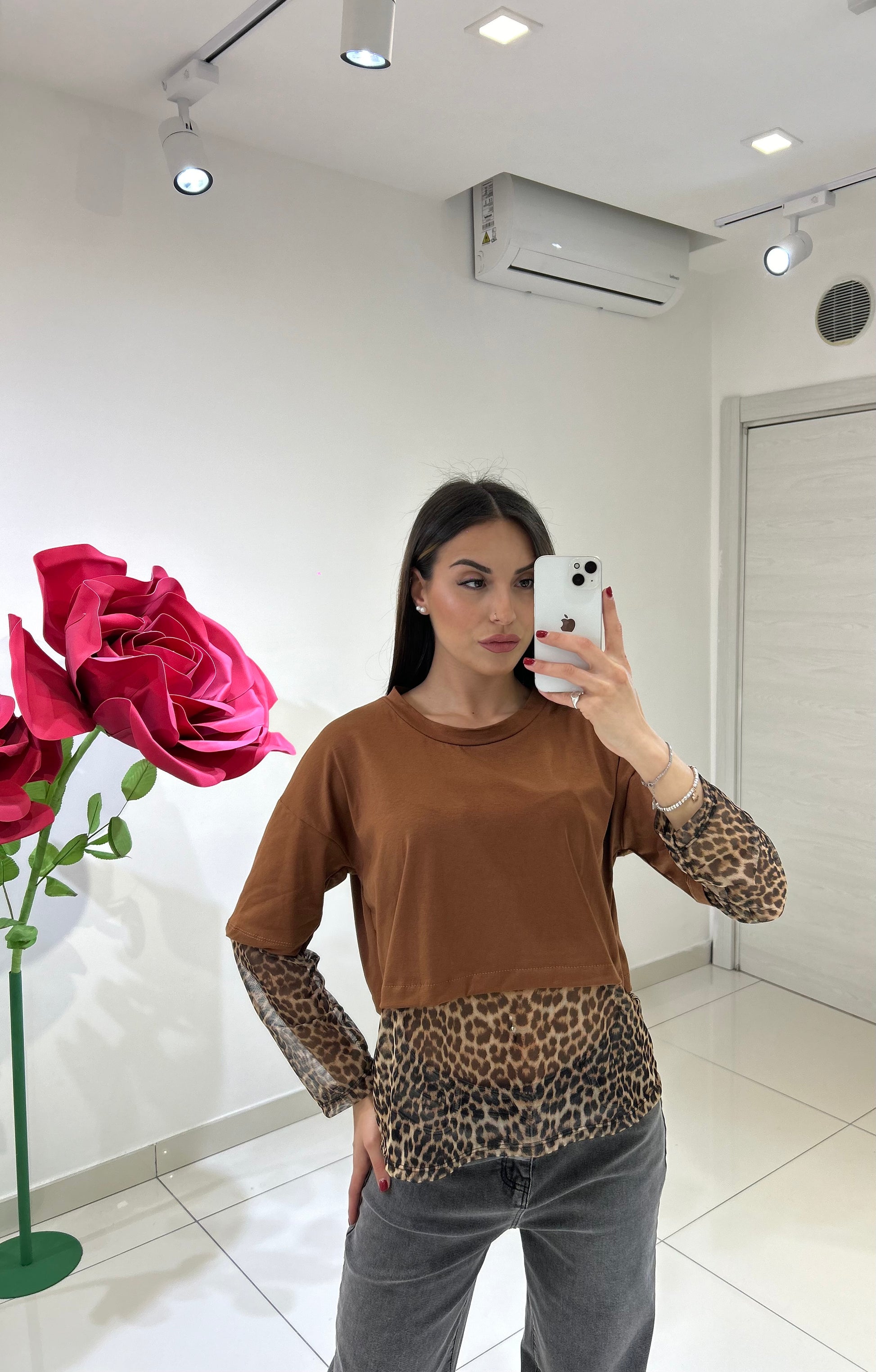 MAGLIA CON TULLE ANIMALIER E MANICHE CON DETTAGLIO TULLE ANIMALIER, TAGLIA UNICA