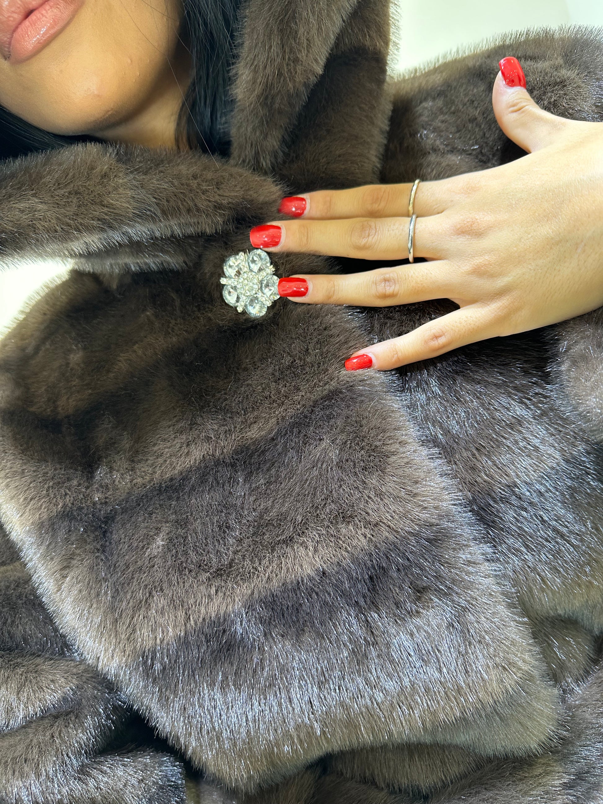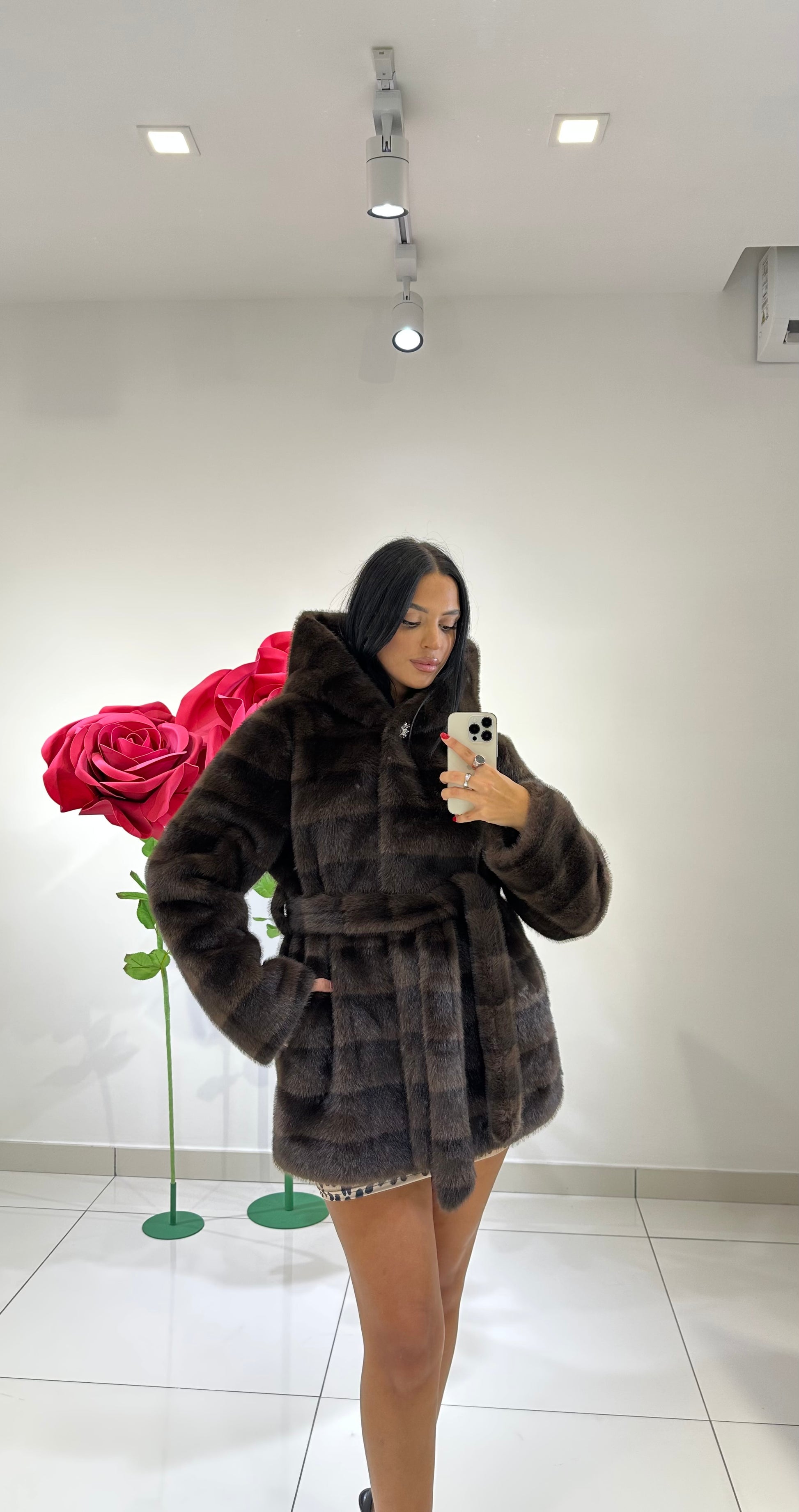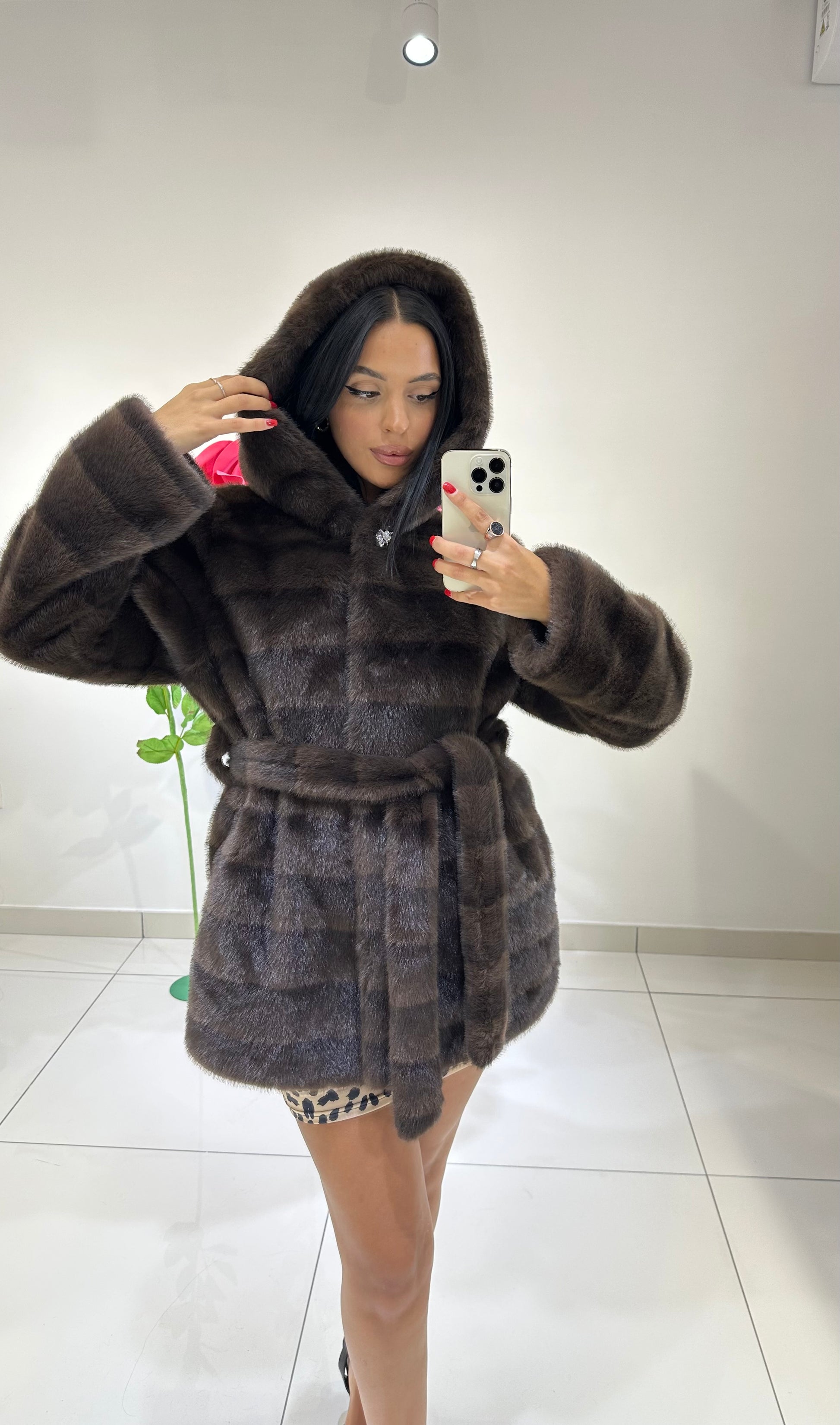 PELLICCIA CON FODERA ALL’INTERNO,CAPPUCCIO, DETTAGLIATA DA BOTTONE GIOIELLO CON TASCHE LATERALI E CINTURA INCLUSA.