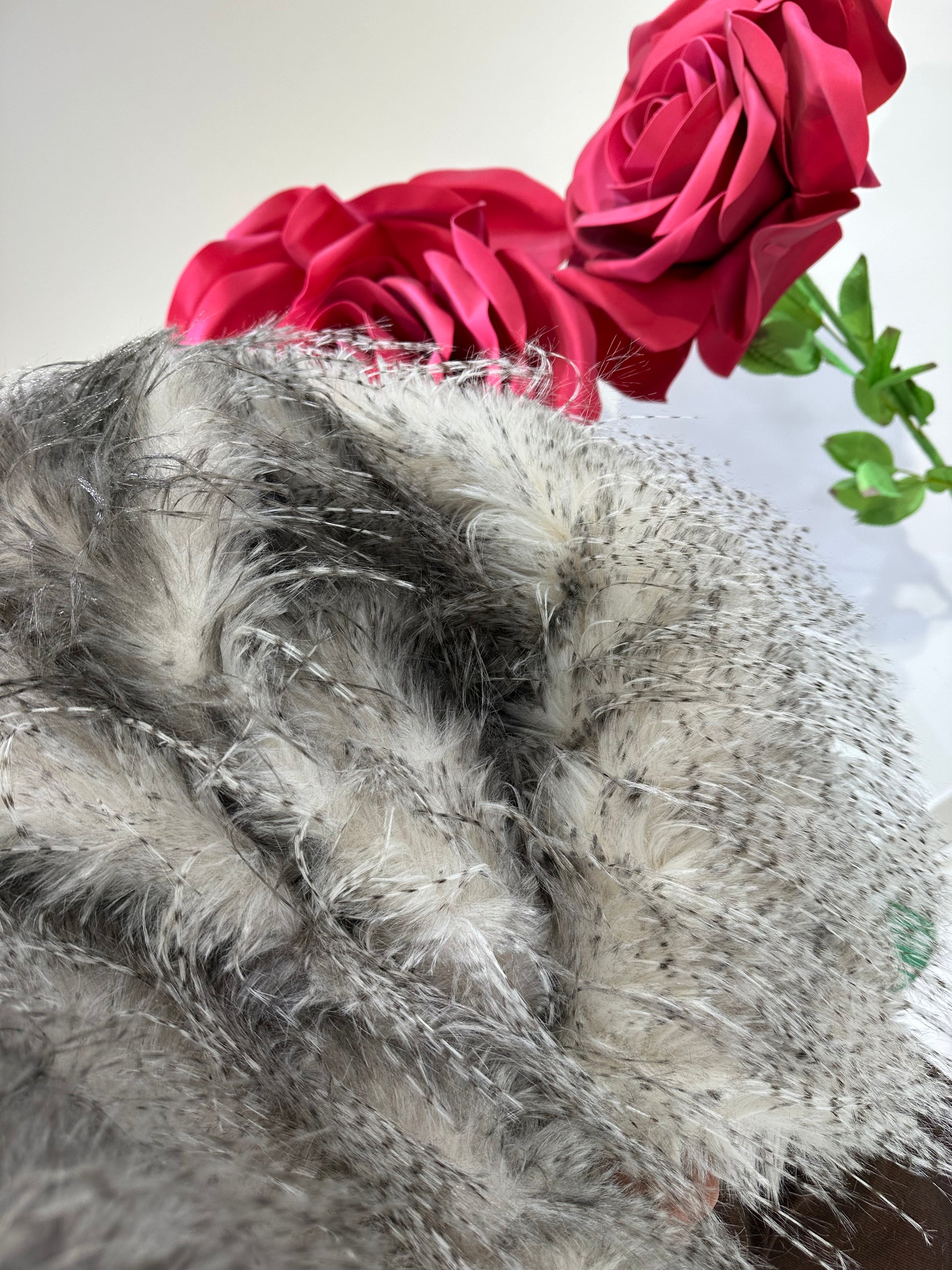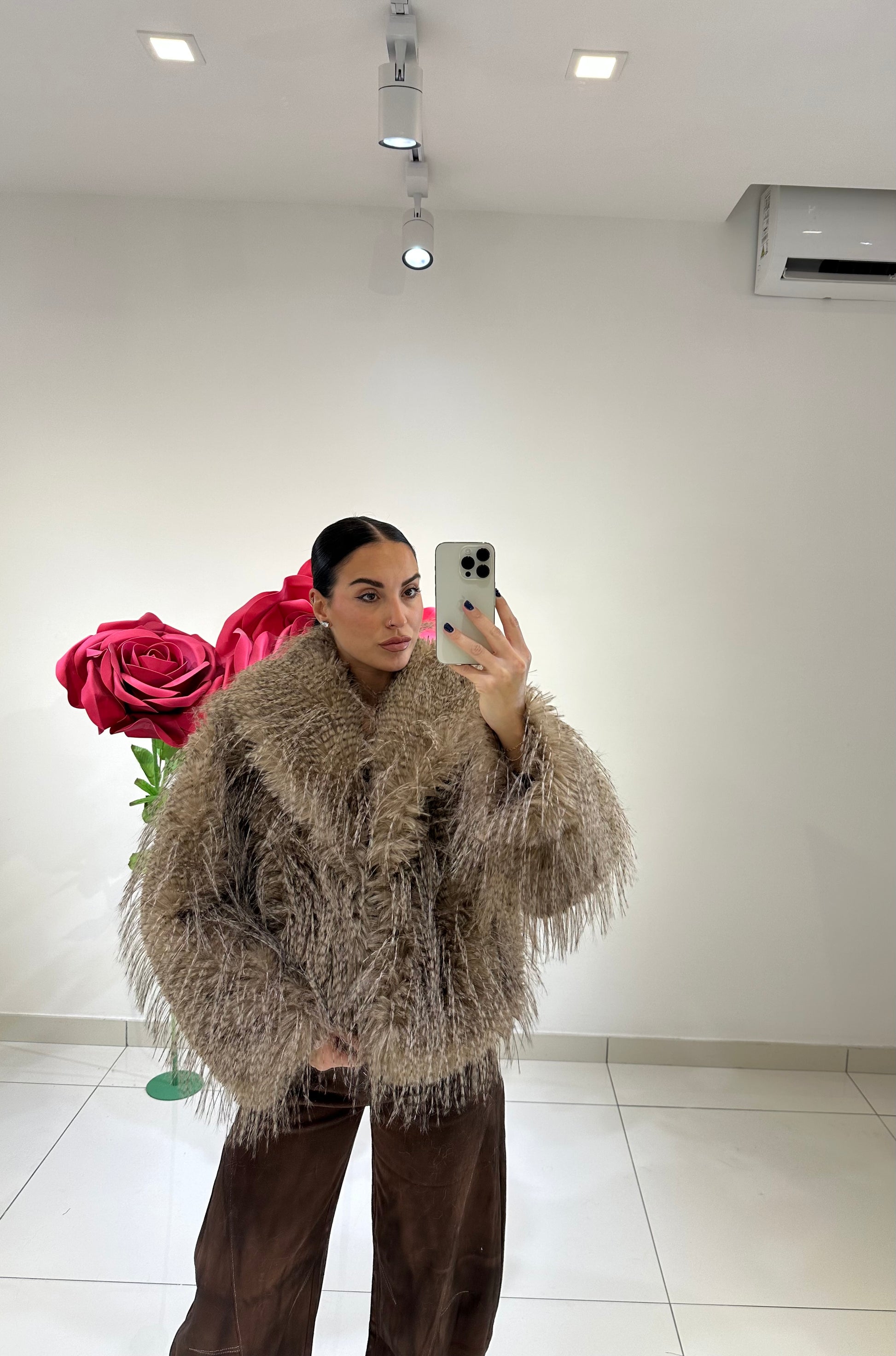 PELLICCIA CON COLLO AMPIO, PELLICCIA E PIUME, FODERATA ALL’INTERNO, EFFETTO SFUMATO. IN VARI COLORI