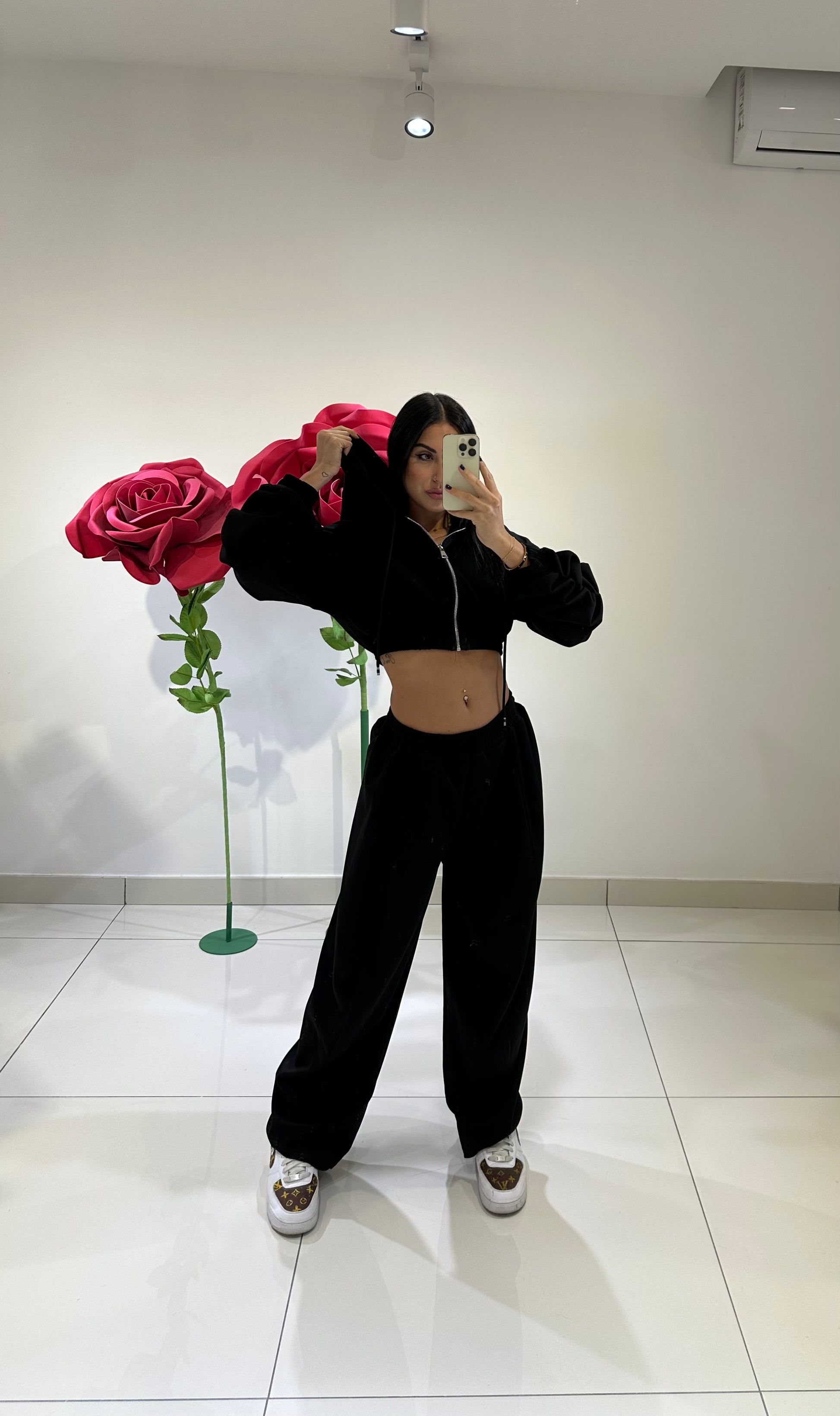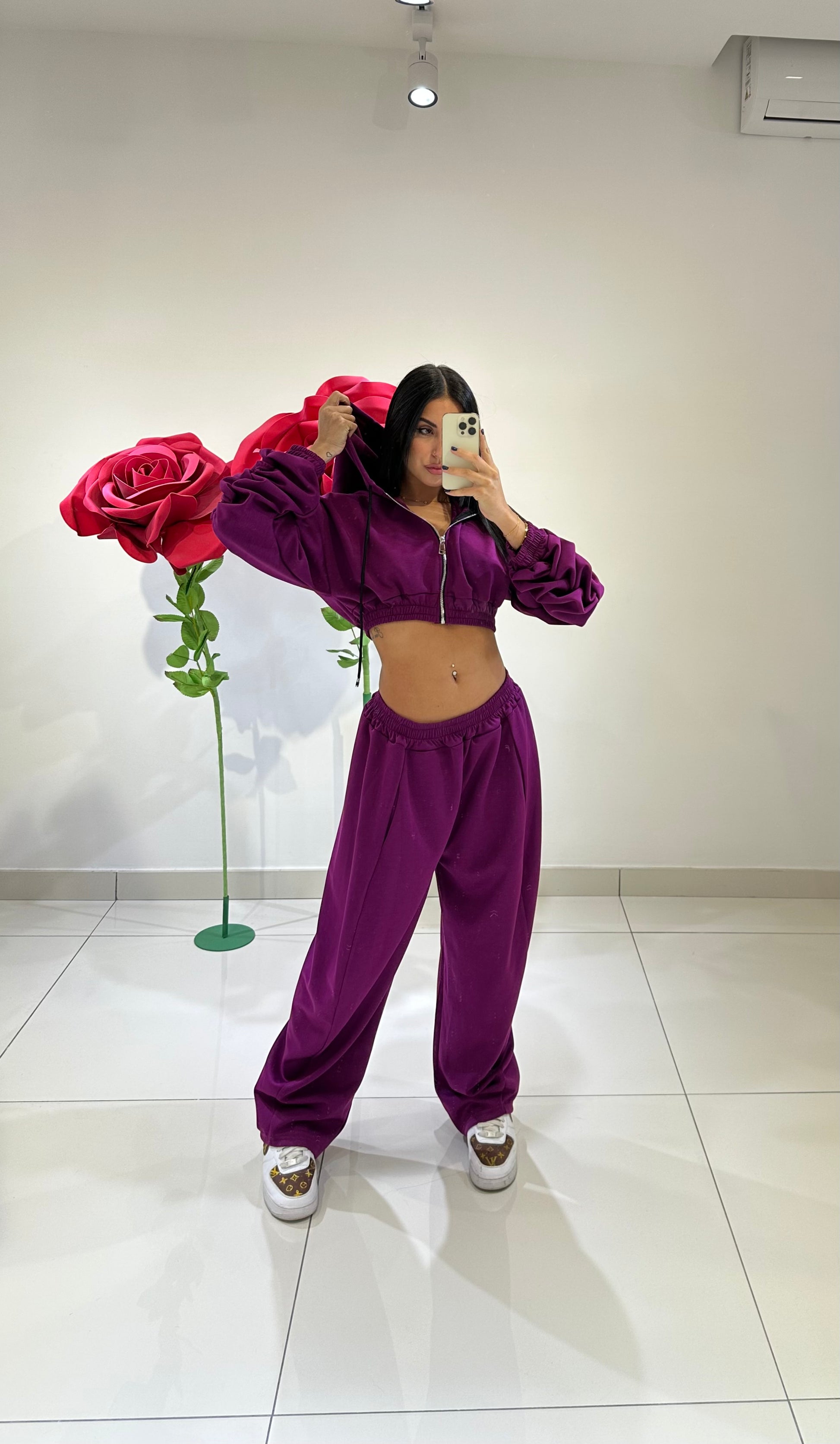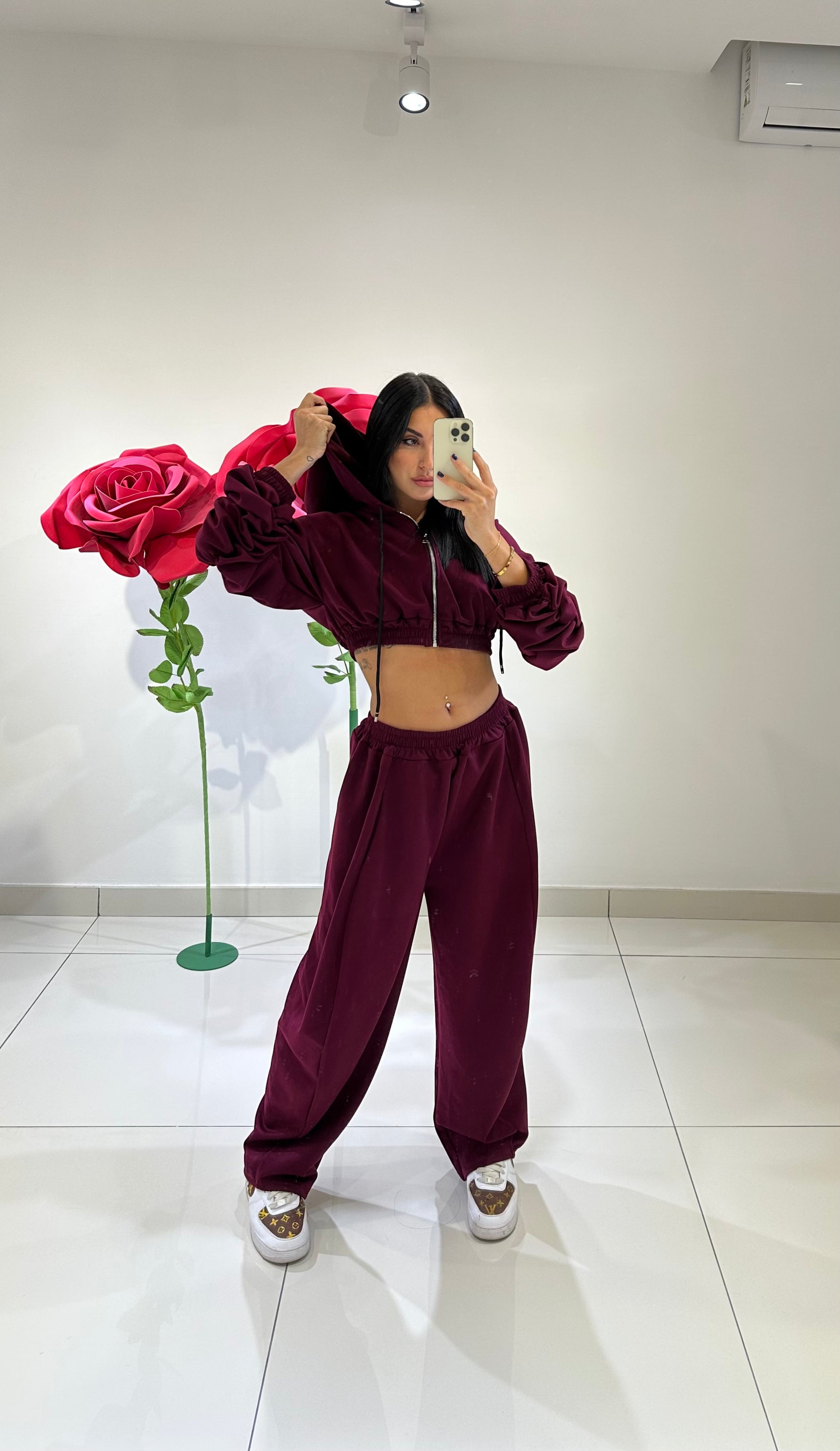 COORDSET DI TUTA COMPOSTO DA FELPA CROP CON ZIP, CAPPUCCIO E DRAPPEGGIO LUNGO LA MANICA. PANTALONE GAMBA LARGA CON ELASTICO IN VITA E TASCHE. IN VARI COLORI